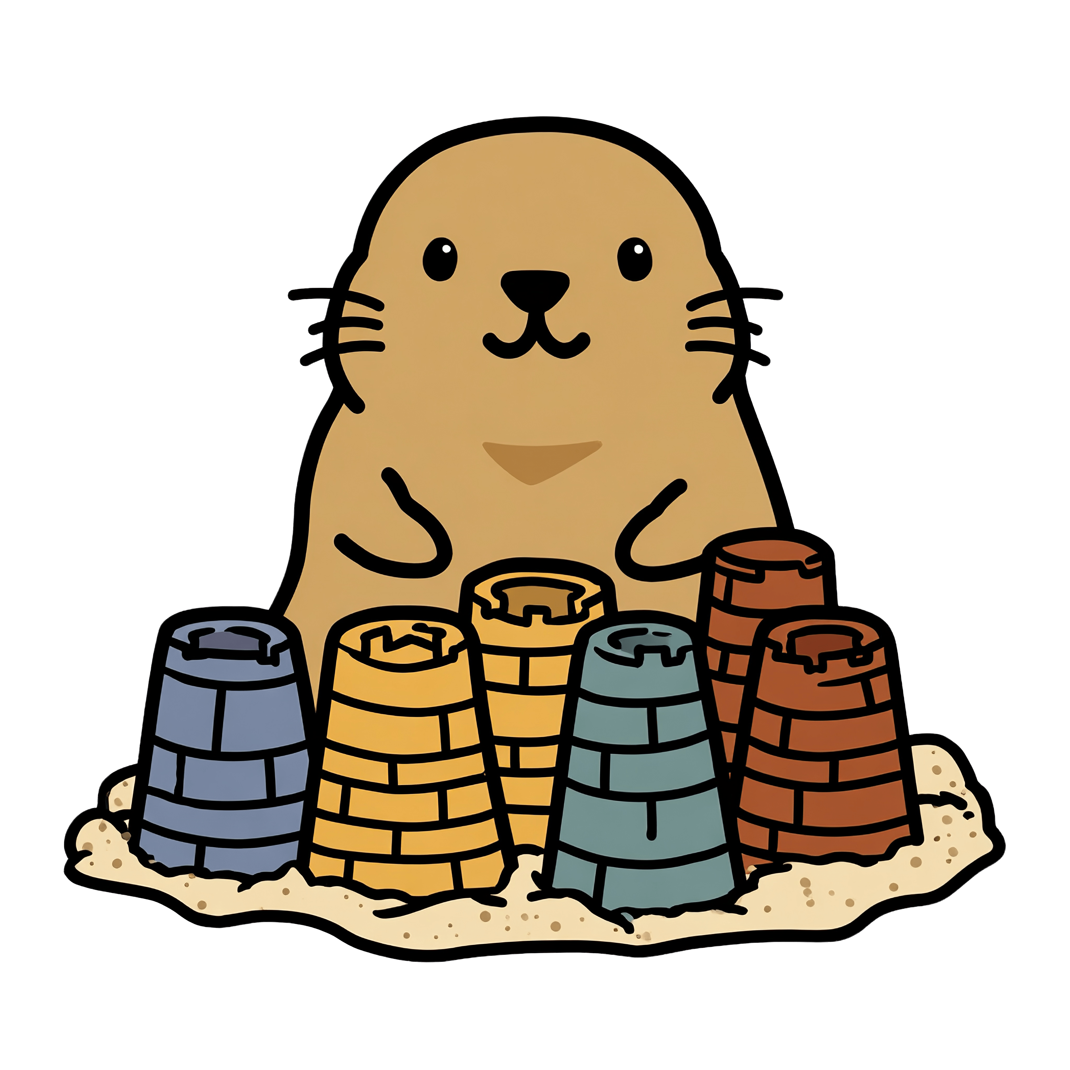 Groundhog surrounded by a row of vibrant sandcastles, featuring colors like blue, orange, and red, sitting on sand. This simple, cartoon-style illustration highlights the groundhog's round body and subtle expression, with detailed sandcastle patterns emphasizing different textures and hues.