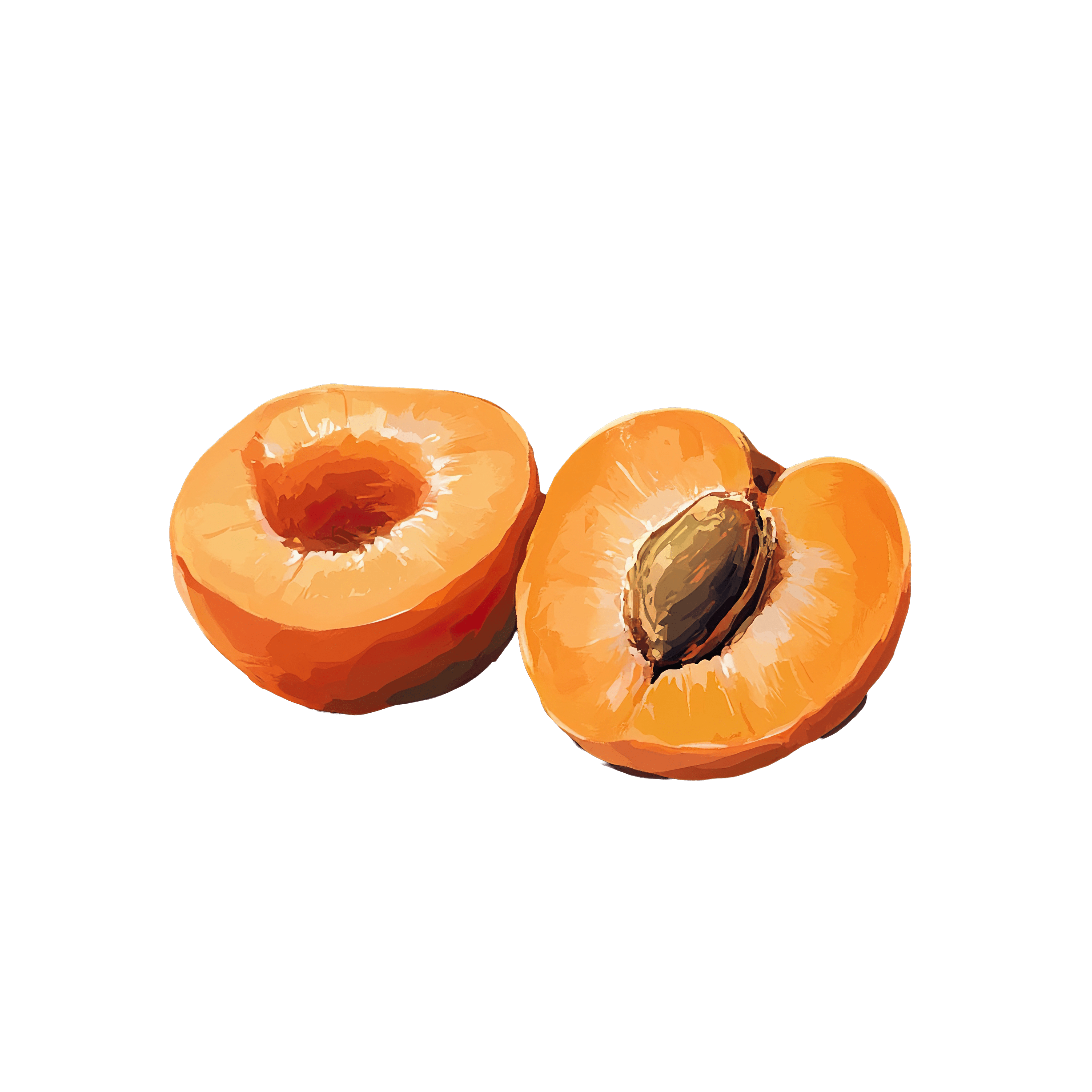 Halved Apricots with Pits Exposed Two apricot halves with visible pits.Download PNG ▼Download JPG ▼Related posts:Watercolor Illustration of Snowy Mountains with a Bright Yellow SunLemon Layer Cake Slice with Icing and Lemon WedgeFestive Gnome with Red Hat and Winter AttireYellow Banana with Green StemVibrant Orange and Yellow Sun with Radiating FlamesVibrant Green Soybean Plant with LeavesPavlova Dessert Topped with Fresh Berries and Mint LeavesBanana Slices on Toasted Bread with Honey DrizzleDetailed Watercolor Illustration of a Purple Orchid FlowerSea Buckthorn Branch with Vibrant Orange Berries clipart vector art plant leavesCartoon wolf wearing a large black witch hatMonkey on Vines Clipart Illustration