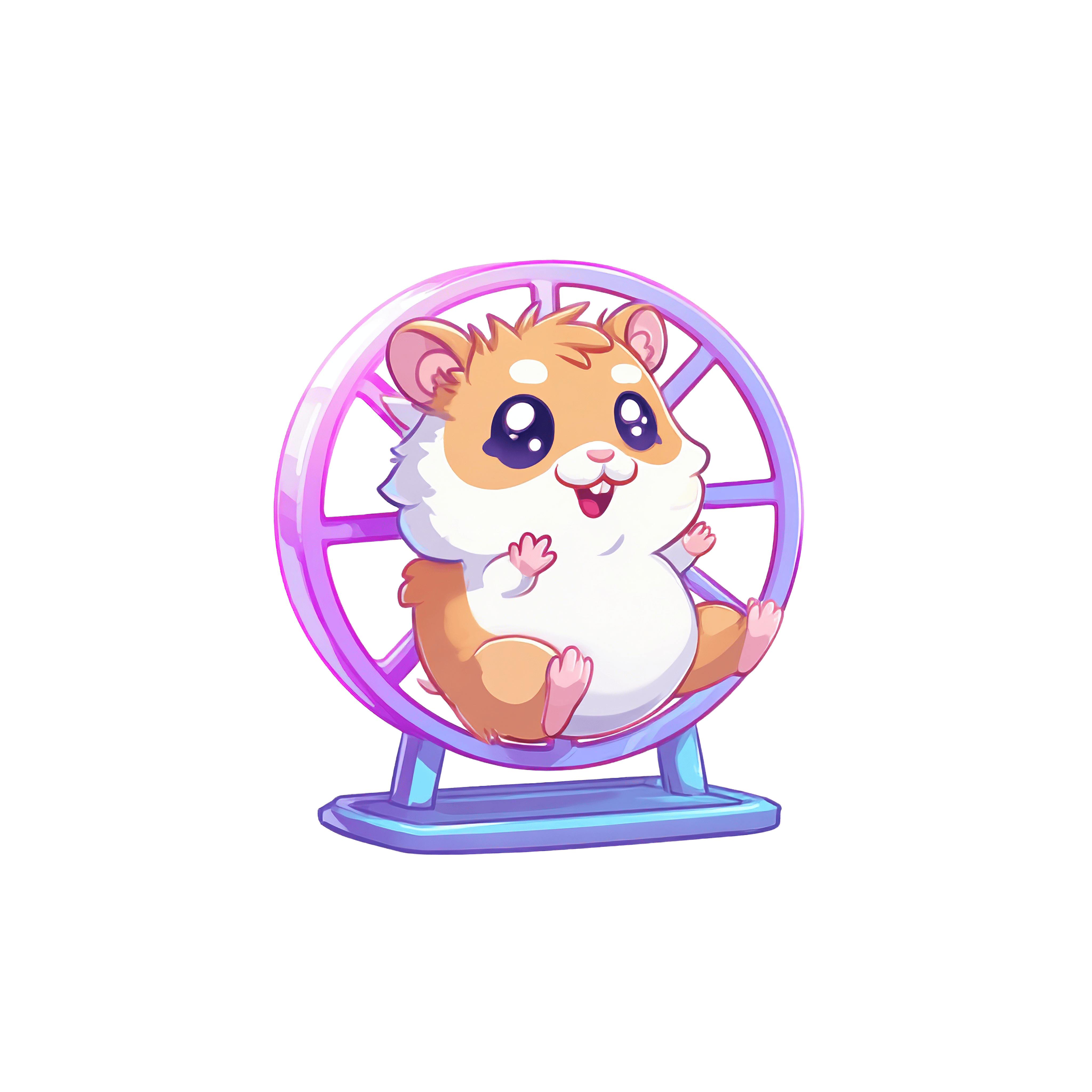 Illustration of a hamster running on a wheel, captured in a cartoon style. The hamster is depicted with a playful expression while positioned inside a purple exercise wheel. The color palette is mainly brown and white for the hamster, contrasting with the purple and blue tones of the wheel. This clipart is suitable for educational materials, pet-related designs, or children's content.