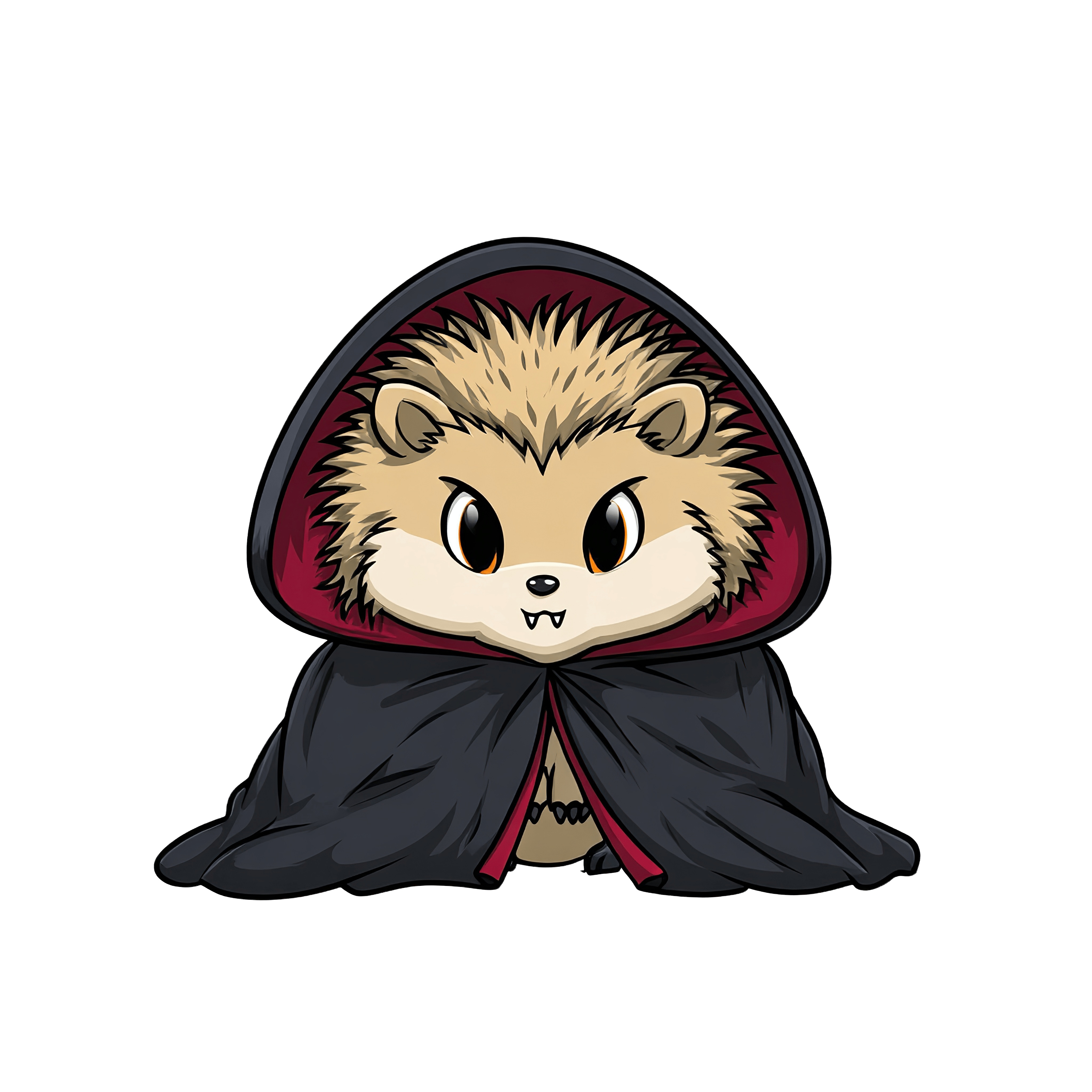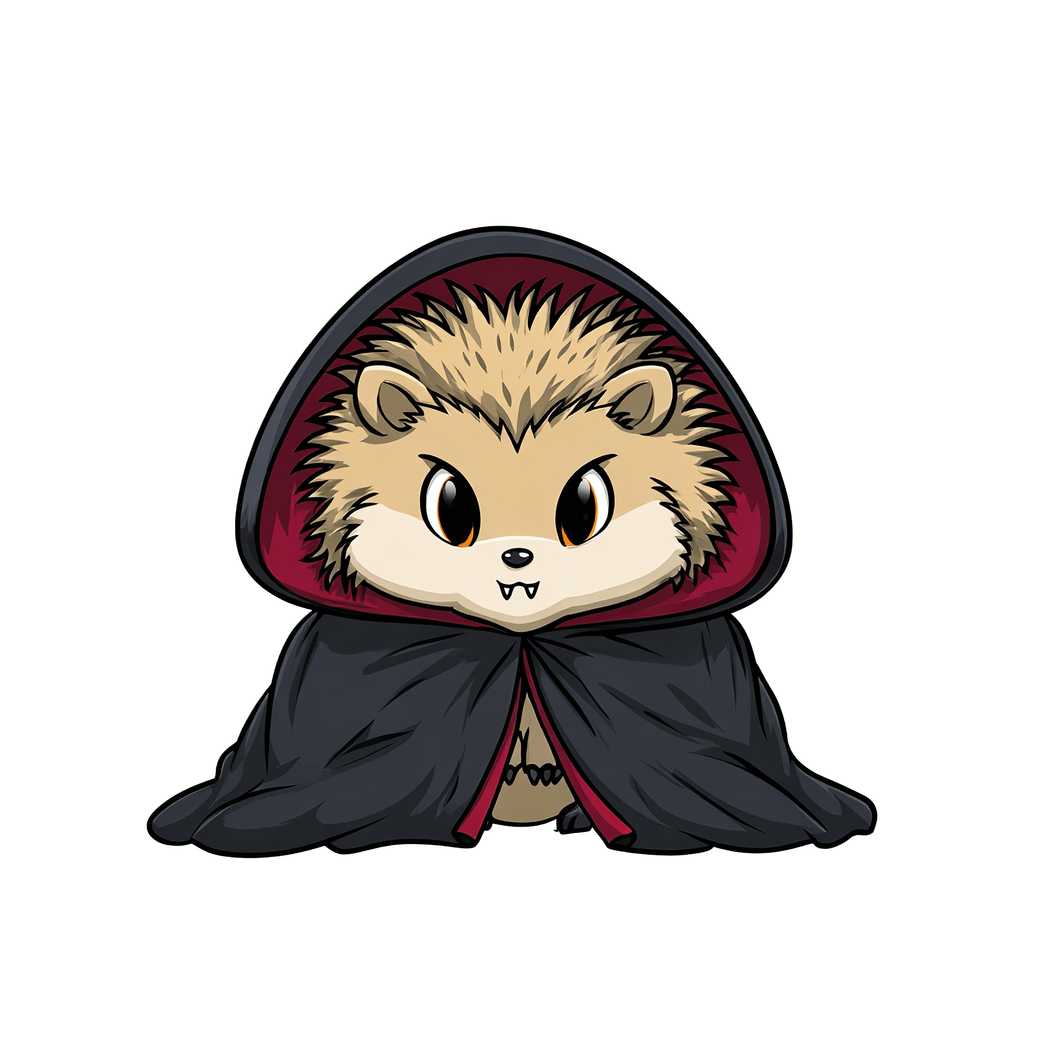 A hedgehog is depicted in this clipart, wearing a large black cloak with red lining. The cloak covers the body, while the hedgehog's face is visible, showcasing prominent eyes and facial features. The illustration is styled as a cartoon character, emphasizing a clean and bold design. The style is suitable for various uses like educational materials, crafts, or themed projects.