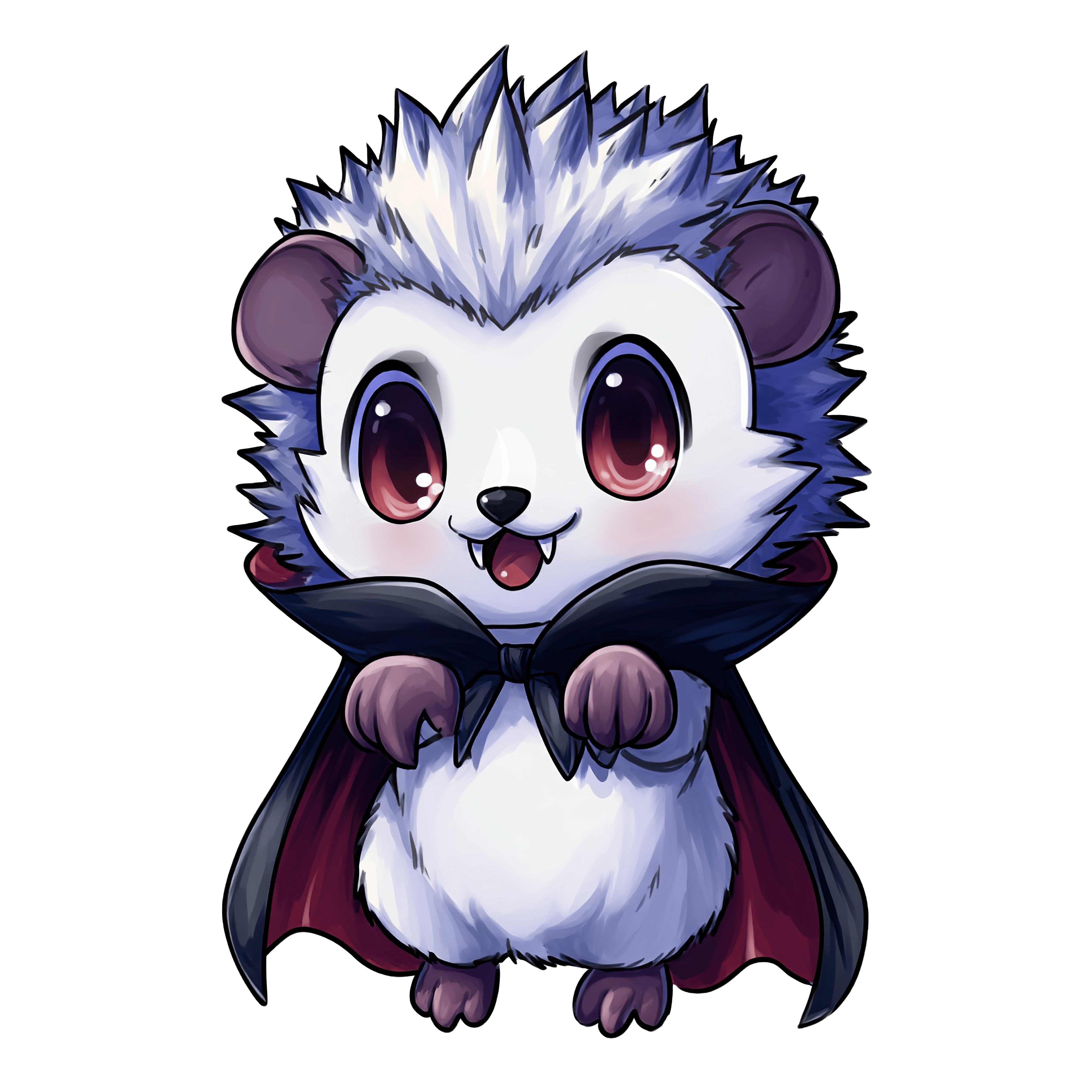 This image depicts an illustrated hedgehog dressed in a vampire costume. The hedgehog is shown with a spiky fur style, wearing a black cape with a red lining. The character illustration features prominent eyes and small fangs, emphasizing its vampire theme. The clipart style presents the animal in a simplified, cartoon-like manner suitable for various creative uses.