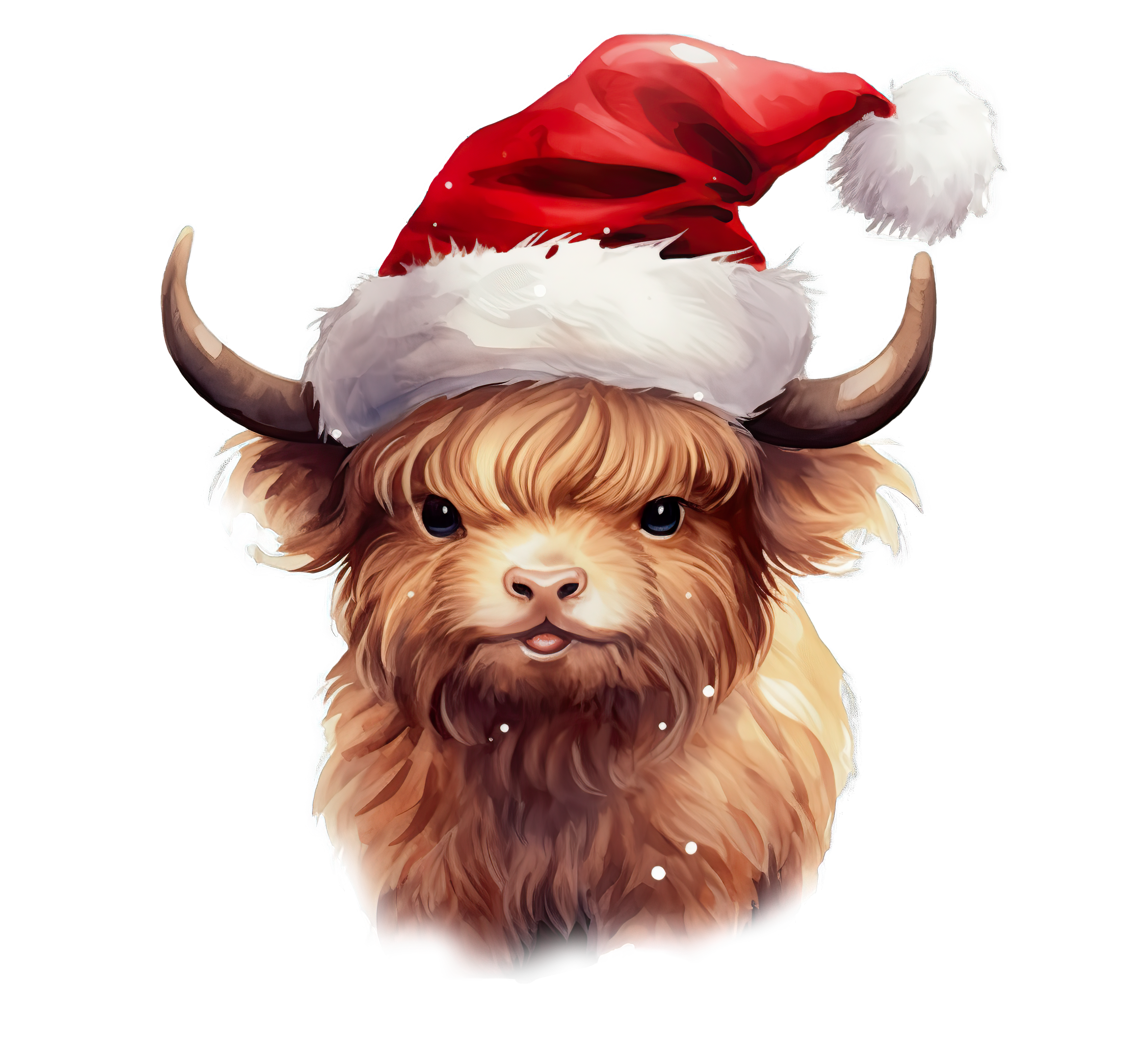 Highland Cow Wearing Santa Hat for Christmas Themed Illustration Highland cow with long horns wearing a red Santa hat.Download PNG ▼Download JPG ▼Related posts:Cluster of Ripe Raspberries with Green Leaves fruit food branch clipart vectorFresh green bok choy vegetable with detailed leafy textureLively Citrus Slice with Green Leaves Vector ArtWatercolor Figs with Leaves and Sliced Fruit purple green clipart vector artCovered Wooden Wagon with Canvas Top and Wooden WheelsOwl in Red Scarf Clipart DesignBlack and White Cow with Bell Clipart IllustrationPink Lily Flower with Detailed Petals on BlackYellow Chick with Red Bow Tie ClipartCarrot Juice in Glass with Fresh Parsley GarnishGlass of Iced Tea with Lemon Slice and StrawColorful Peacock Clipart with Patterned Plumage