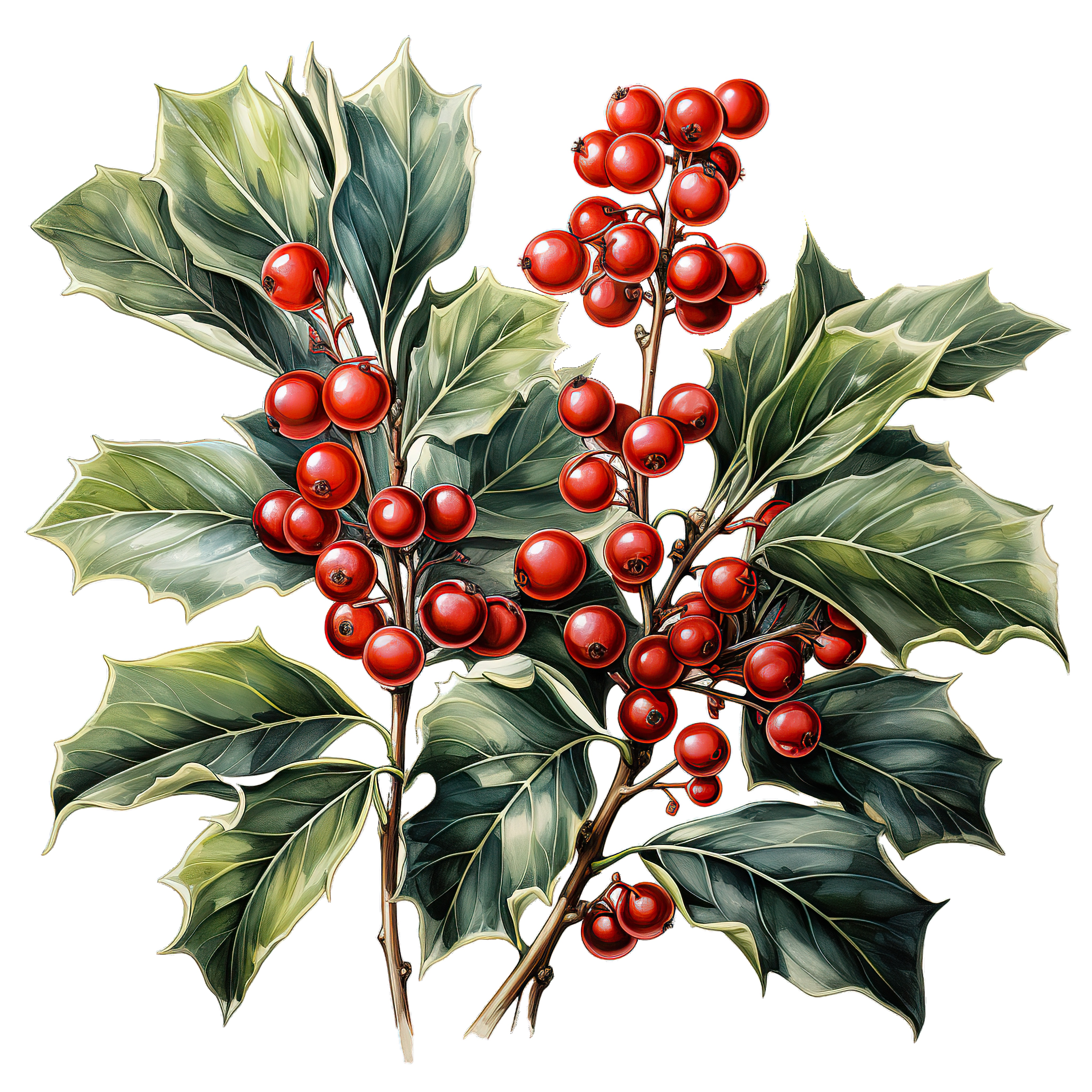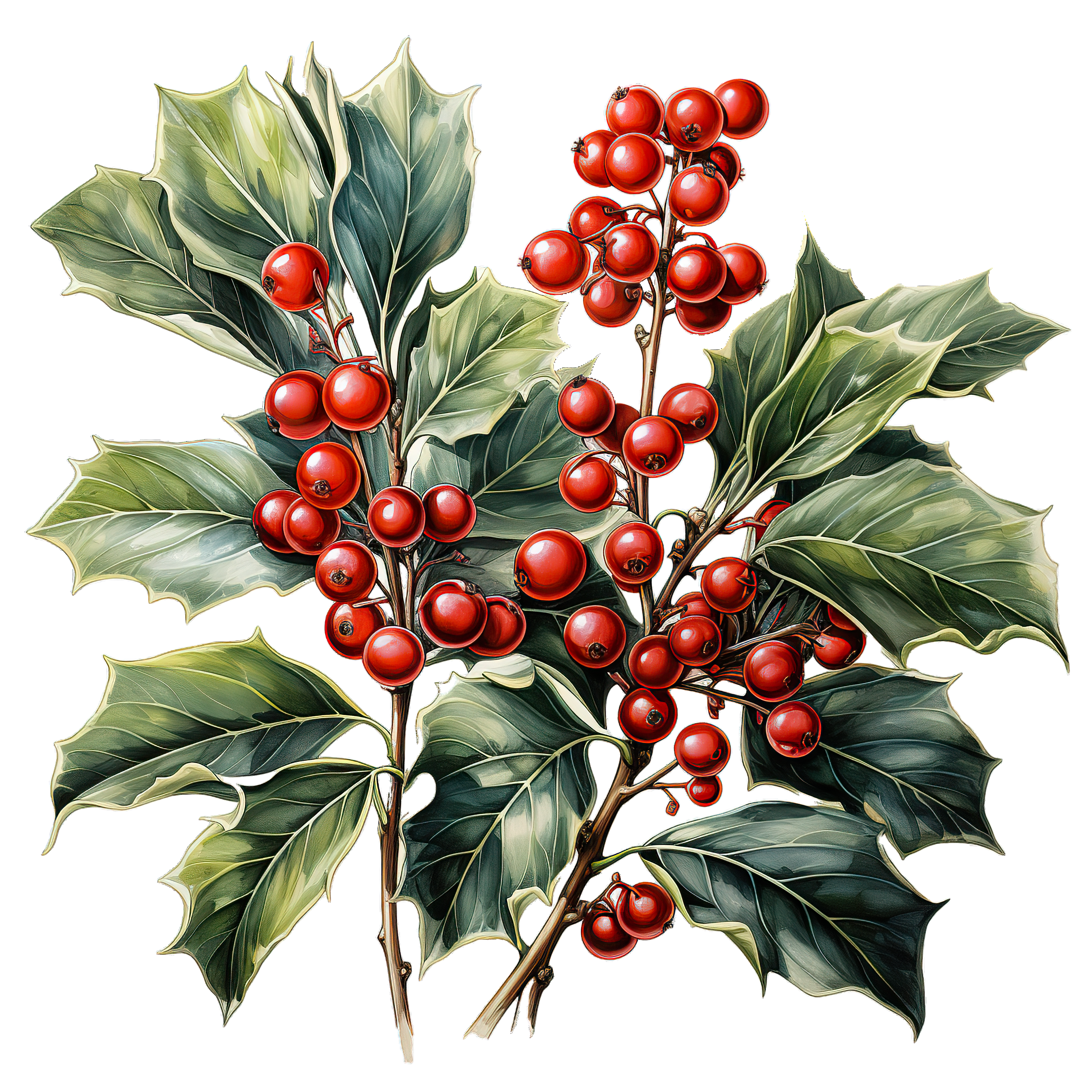 Holly Branches with Red Berries and Green Leaves Illustration Holly branches with vibrant red berries and glossy green leaves.Download PNG ▼Download JPG ▼Related posts:Glass Cup of Tea with Orange Slice and LeavesCinnamon Roll Clipart with Swirled Pastry Design golden-brown food dessert bakery vectorBlue Butterfly With Detailed Wing Patterns Illustration WingsRed Christmas Ornament with Pine Branches and Detailed ReflectionsSmiling Sun with Radiating Rays in Starry Night GraphicHolly Leaves with Red Berries Vector IllustrationIntricate Red and White Snowflake Gingerbread Cookie DesignIntricate Mandala Snowflake with Pine Elements in Red and GreenWatercolor Hyacinth Stems in Various Growth Stages plants flowers botanical art clipartWoman in Red Turban and Scarf with Bold EarringsMint Tea in Glass Cup with Fresh LeavesVintage Wooden Covered Wagon with Large Wooden Wheels Clipart