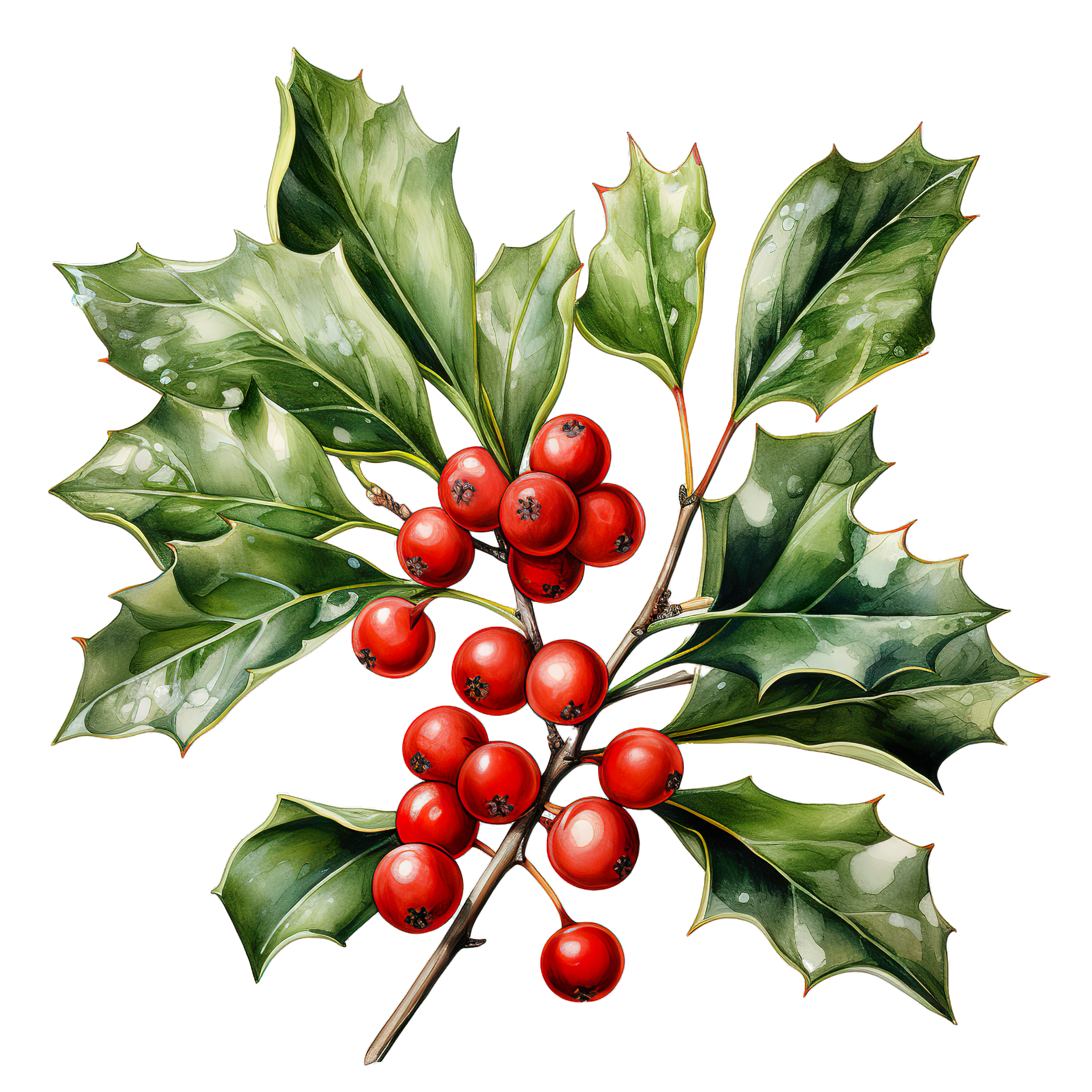Holly Leaves with Red Berries for Holiday Decorations Holly leaves with red berries used traditionally in holiday decorations.Download PNG ▼Download JPG ▼Related posts:Hand-drawn cassava roots with detailed texture and shadingVintage Camper Decorated with Festive Holiday Wreaths and SnowSitting tiger clipart with orange and black stripesTall Glass of Orange Juice with Straw drink beverage watercolor clipart vectorCartoon bird clipart with orange and gray plumageYoung girl with floral wreath and autumn leaves in hairIced Coffee in a Clear Plastic Cup ice cubes beverage cold drinkPink Sleigh Loaded with Brightly Colored Wrapped Gift BoxesOtter clipart with antlers and festive ornamentsOtter in Yellow Boots Clipart IllustrationRed Christmas Ornament with Gold Ribbon and Decorative PatternsDetailed Kale Leaf with Curly Edges in Green Tones