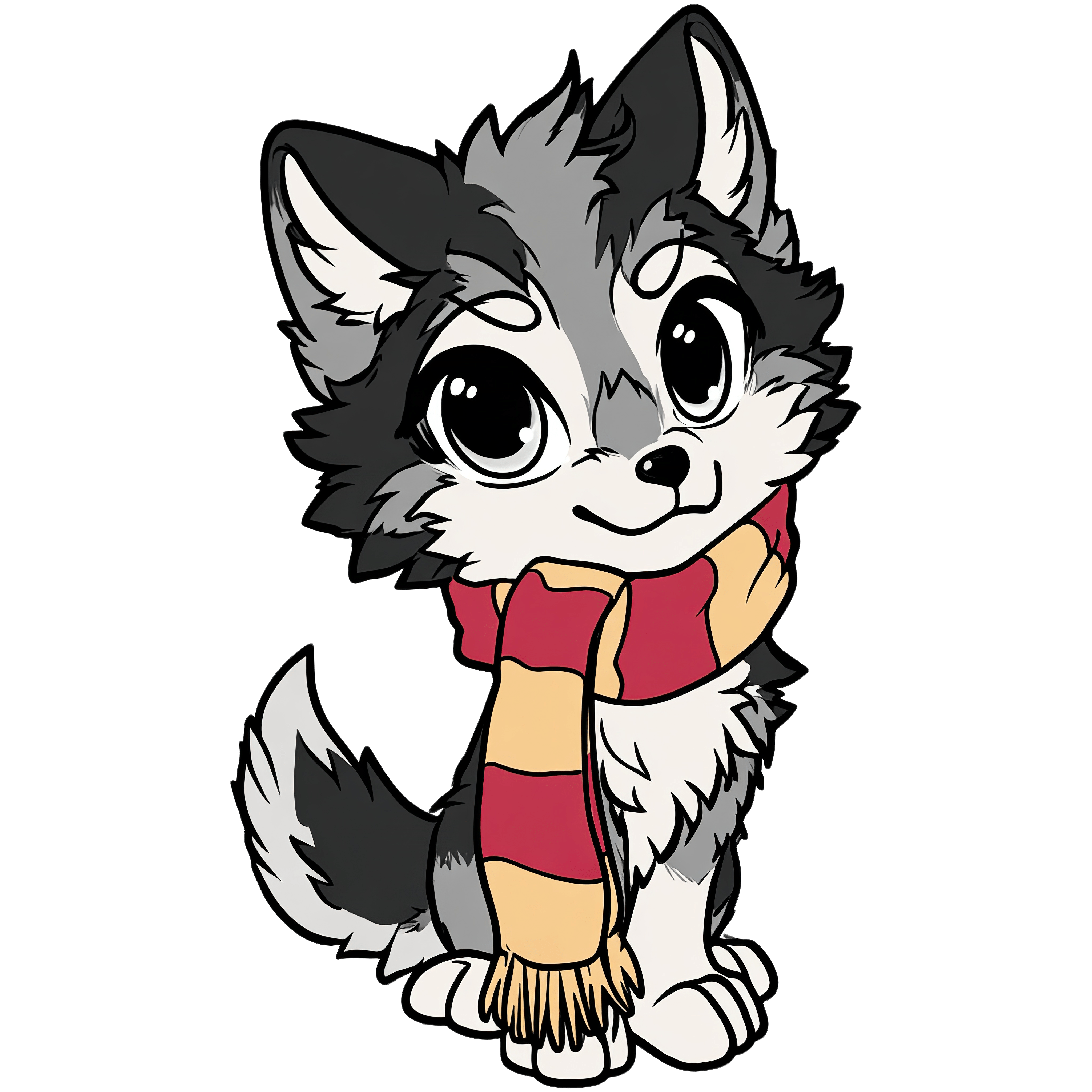 Husky depiction with black, grey, and white fur, wearing a red and yellow striped scarf. The design highlights bushy fur and large, expressive eyes, creating a distinct vector art style. The illustration emphasizes the classic husky features like pointed ears and fluffy tail, set in a clean, simple format well-suited for various digital and printable uses.