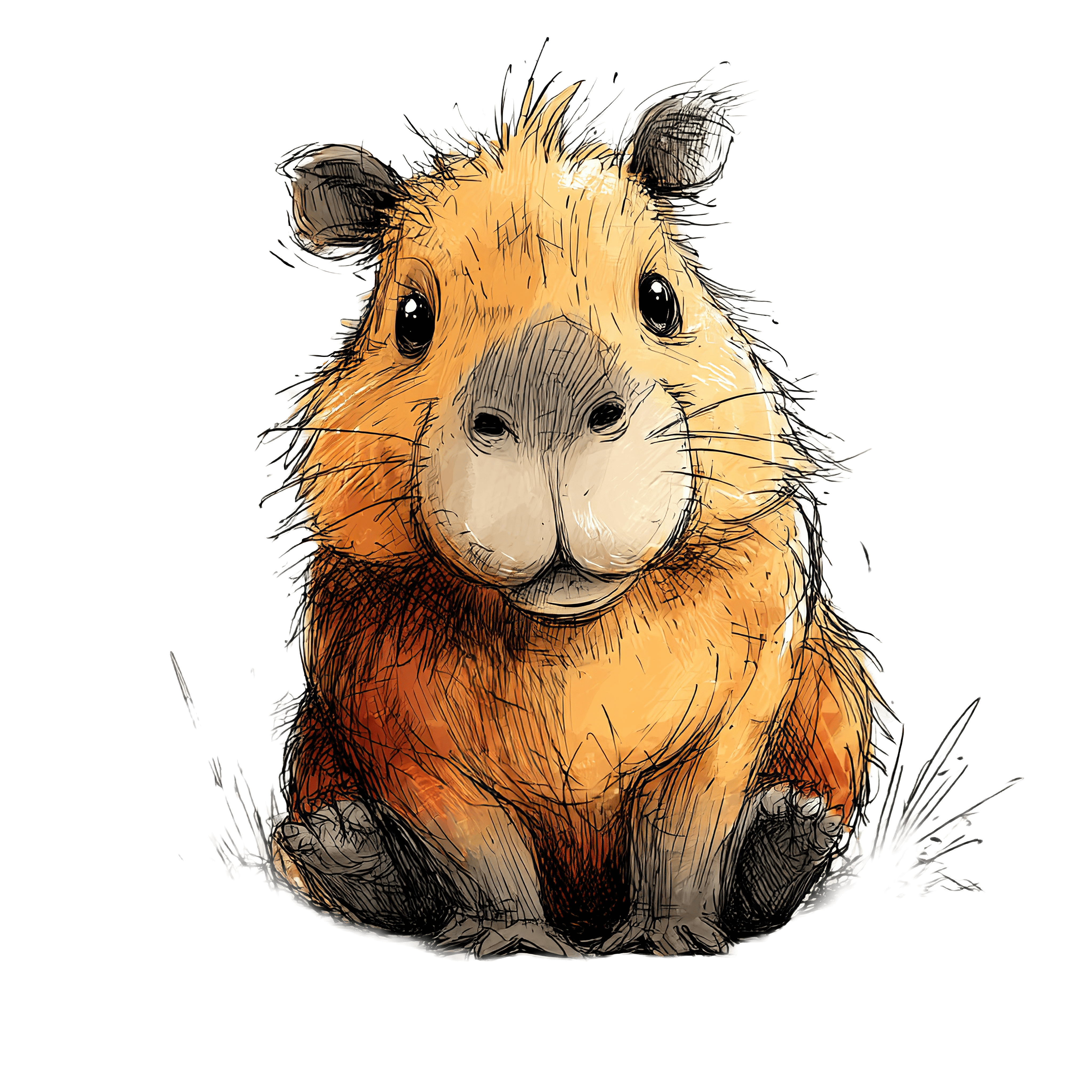This clipart depicts a capybara sitting in a sketchy style, highlighting detailed fur and a large snout. The animal is illustrated using a pen and ink drawing technique, giving it a textured appearance with varying shades of orange and brown. The black background contrasts with the animal’s lighter tones, focusing on its expressive features. This is ideal for projects involving wildlife themes or artistic drawings.