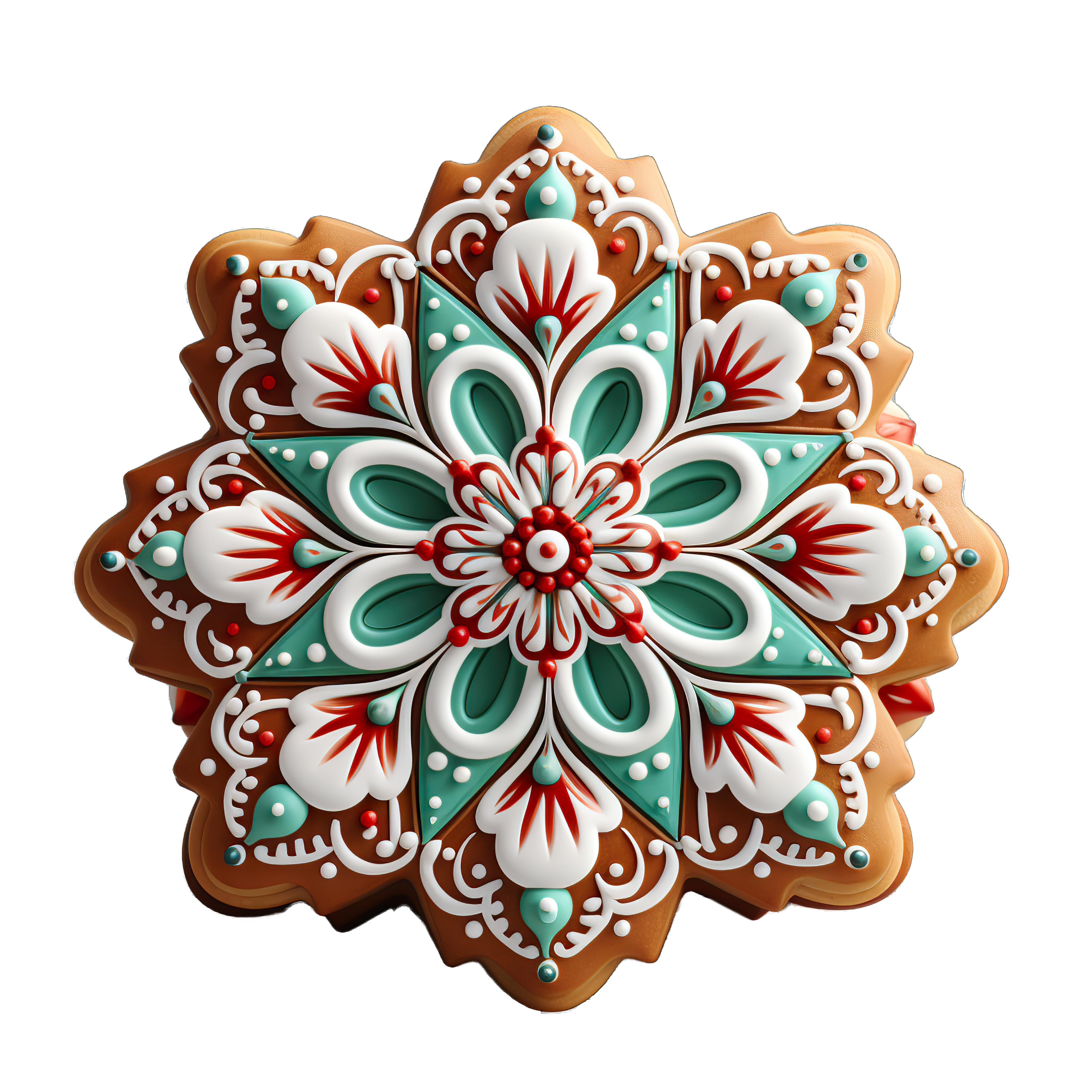 Intricate Gingerbread Cookie with Colorful Ornate Frosting Design Detailed gingerbread cookie with an elaborate pattern of red, white, and green icing.Download PNG ▼Download JPG ▼Related posts:Watercolor Sunrise Over Mountain Silhouette with Radiant SunraysWatercolor Kiwi Slices with Vivid Green Flesh fruit clipart food vector artTwo Whole Onions with Brown Skins and Green TopsBanana Smoothie in Glass with Spoon art drink beverage watercolor clipart vectorChameleon On Green Branch Tongue PngBotanical Art of Blackberries and Leaves in Watercolor StyleVibrant Butterfly With Multicolored Wings Illustration SymmetricalWater Droplets on Peach Colored Rose with Green LeafWatercolor Carrot with Green LeavesOlive Branch with Green Leaves and Ripe OlivesTwo Whole Durians with Spiky Green Shells durian fruit tropical clipart vectorDigital Art of Edible Cauliflower with Lush Green Leaves