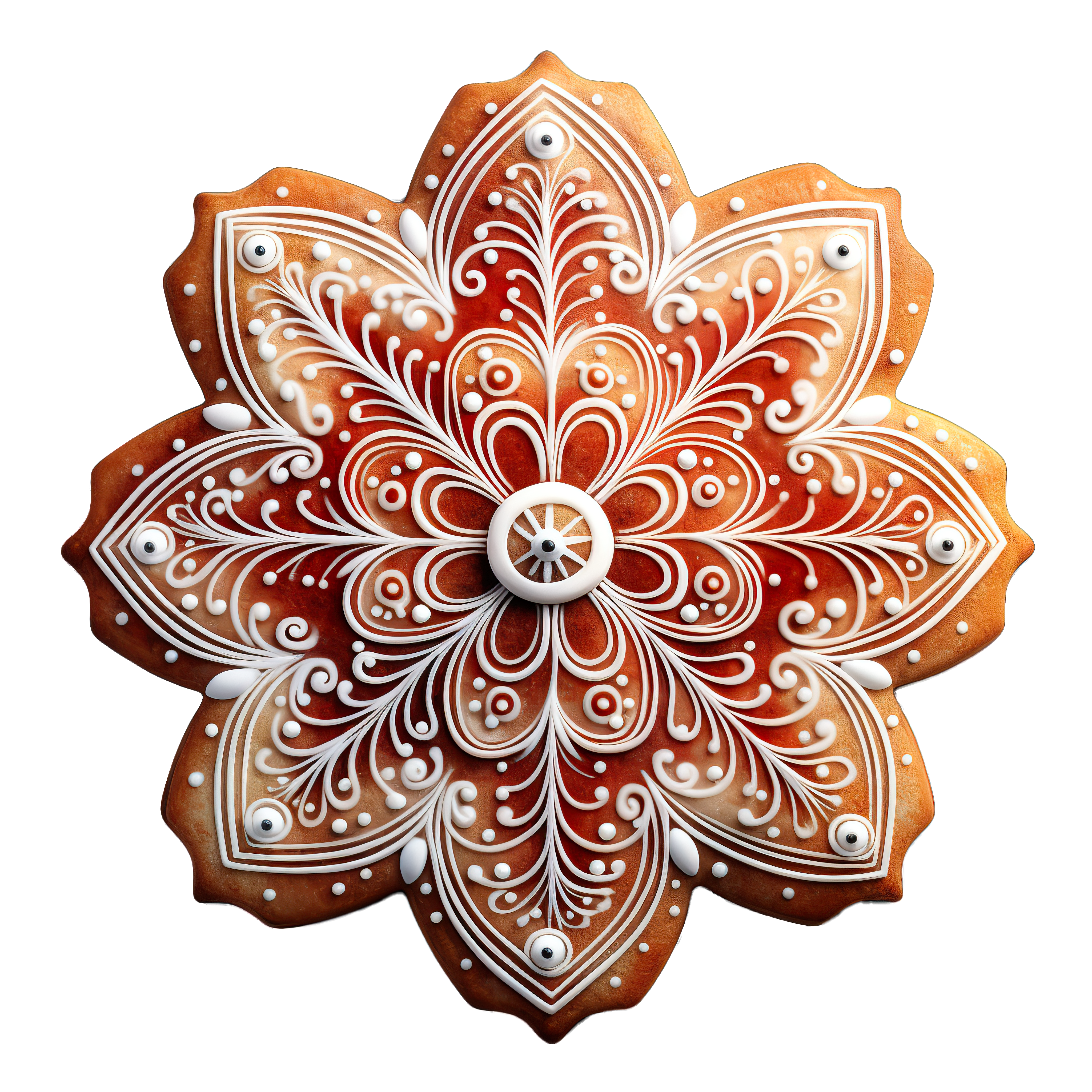 Intricate Gingerbread Cookie with Detailed White Icing Design Gingerbread cookie decorated with elaborate white icing in floral pattern.Download PNG ▼Download JPG ▼Related posts:Fluffy white dog with blue butterfliesWhite Hibiscus Flower with Green Leaves on Black BackgroundTiger cub holding orange basketball clipartFresh Bok Choy Bunch with Green Leaves and White StemsStylized Sun and Moon Faces with Stars on Black BackgroundCupcake with Whipped Cream and Caramel Drizzle dessert food sweet watercolor clipartCartoon Superhero Character in Blue and Yellow CostumeTurtle wearing purple beanie clipartGecko wearing Santa Claus hat and outfitWatercolor Green Citrus Fruit with Halved View clipart vector art printable juicyGreen Okra Pods with Leaves and Cross-Section ViewYellow pelican clipart with large beak and bold outline
