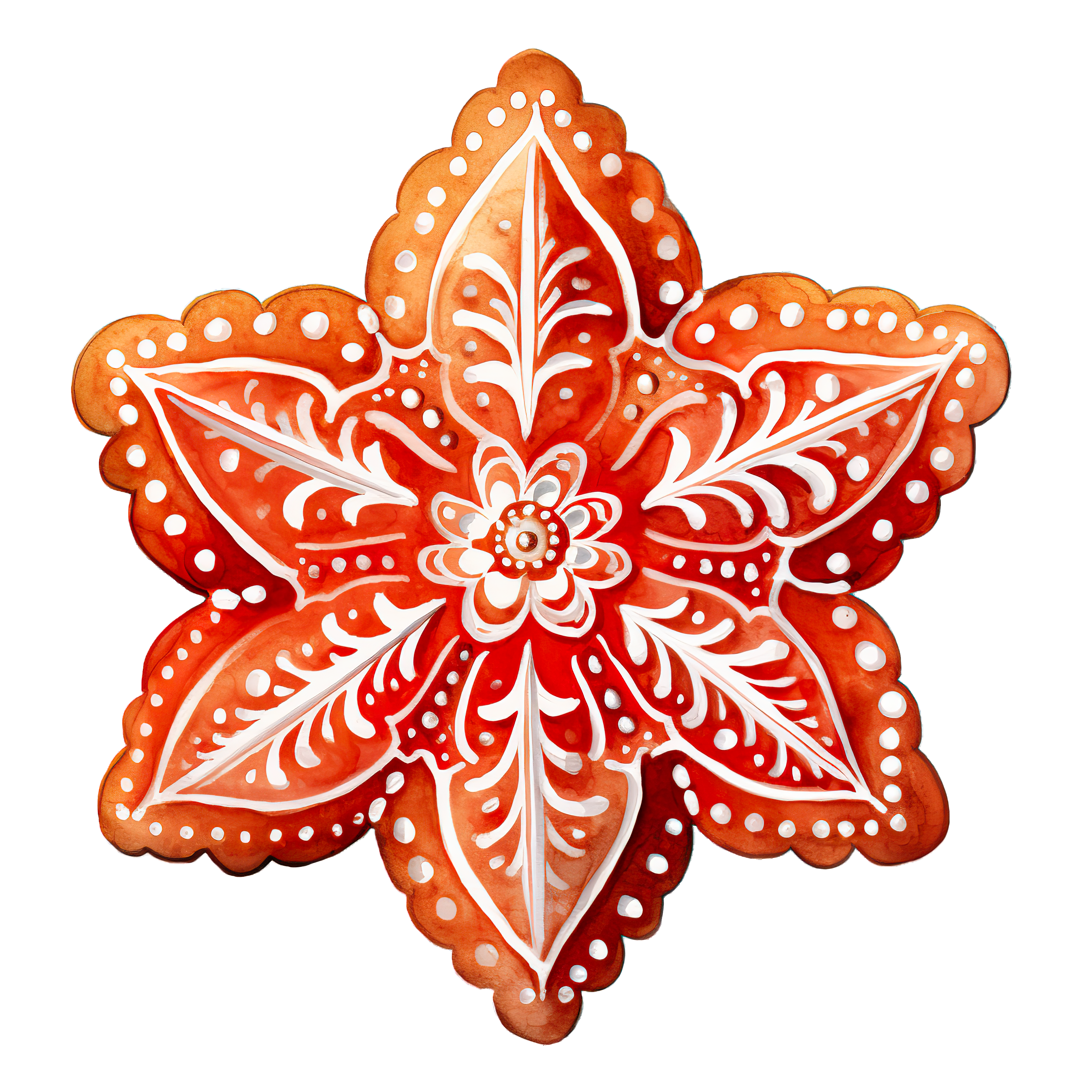 Intricate Red Gingerbread Cookie Design with White Icing Pattern Red gingerbread cookie design with white icing, featuring intricate patterns.Download PNG ▼Download JPG ▼Related posts:Pineapple with Fresh Juice and Sliced Piece on DisplayBunch of Fresh Green Parsley Leaves ClipartSquirrel wearing Santa hat clipart illustrationChristmas Elf Sitting on Rooftop with Starry Night BackgroundWatercolor Whole and Sliced Figs with Intricate TextureSpotted Cow Eating Cereal ClipartFresh Spinach Leaves Bunch in Detailed Vector ArtCartoon kangaroo wearing green elf hat and scarfTwo Slices of Yellow Melon with Seeds fruit clipart vector art foodYellow owl clipart with detailed feathersWatercolor Blackberries with Detailed Texture and Green StemsRed Brown White Dog Illustration