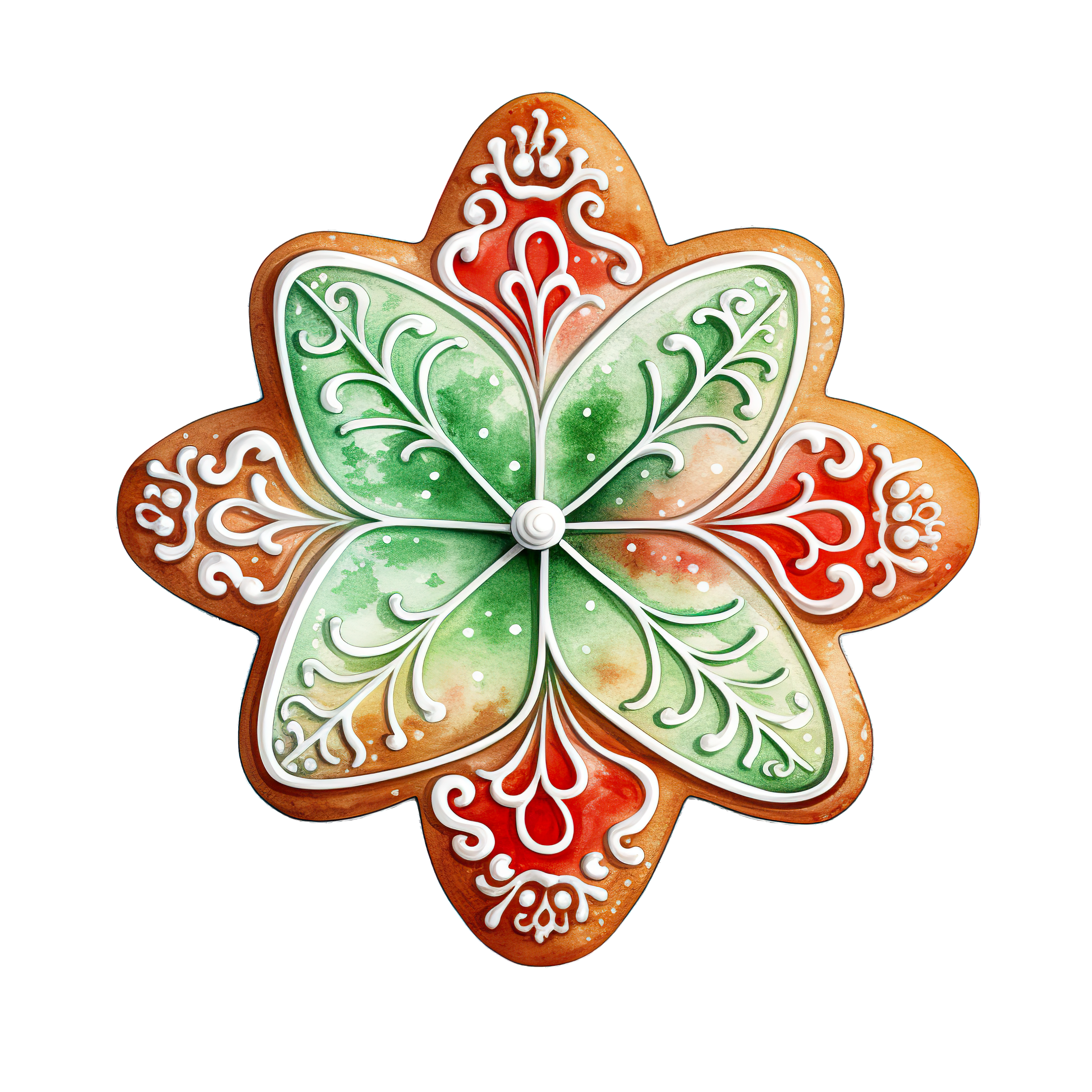 Intricate Snowflake-Shaped Gingerbread Cookie with Red and Green Icing Snowflake-shaped gingerbread cookie decorated with red and green intricate icing.Download PNG ▼Download JPG ▼Related posts:Sloth Hanging from Branch with Green LeavesMint Julep in a Silver Cup with Fresh Mint LeavesHalf Peach with Seed in Detailed Vector ArtChristmas Elf Holding Green and Red Wrapped PresentsOtter in Yellow Boots Clipart IllustrationRaccoon Clipart with Witch Hat DesignCherry Tart with Whipped Cream and Mint GarnishPink Frosted Donut with Sprinkles Clipart frosting watercolor food dessert sweet pastryOrange tiger-like creature with antlersLychee Drink with Fresh Lychees and Lemon SliceColorful hummingbird clipart with detailed feathersGreen Bamboo Stalks Tied Together with Leaves bundle clipart vector art printable