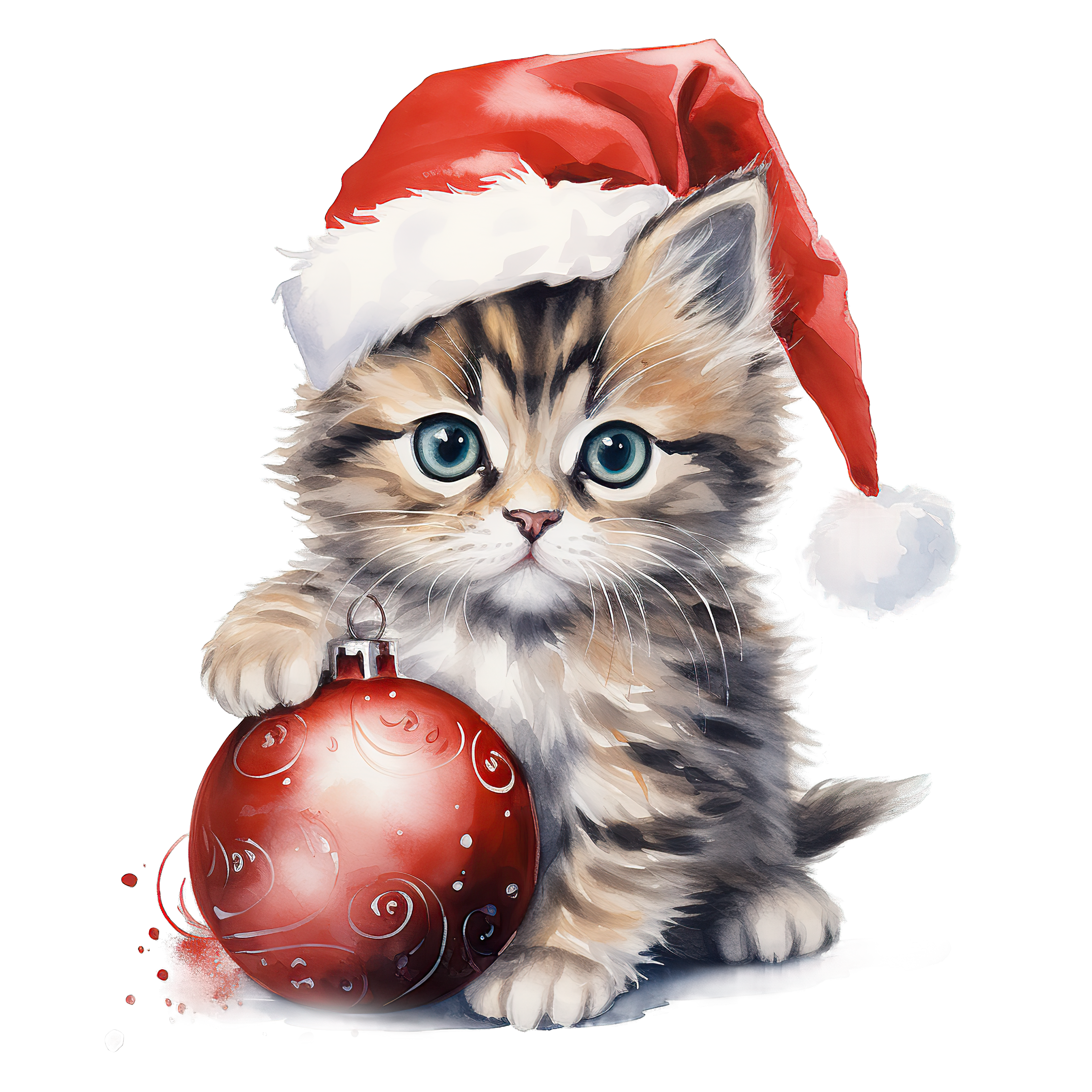 Kitten Wearing Santa Hat with Red Christmas Ornament Kitten in a Santa hat holding a red Christmas ornament.Download PNG ▼Download JPG ▼Related posts:Watercolor Blackberries with Green Leaves DesignWatercolor Cupcake with Swirled Orange Frosting dessert sweet treat baked good clipartChristmas Tree with Pinecones and Festive Gift BoxesColorful Gradient Winged Butterfly With Sparkling DetailsChocolate Mousse in Glass with Silver Spoon dessert dish brown sweet foodWatercolor Cupcake with Red Currants on Top dessert food sweet pastry clipartDetailed Botanical art of a Flowering Plant flower pink blossom green leavesWoman Wearing Festive Red Headscarf and Green Dress with AccessoriesFresh Cauliflower Surrounded by Vibrant Green LeavesDecorated Christmas Tree with Wrapped Gifts in Festive ColorsTriangular Pastries on a Dark Ceramic Plate food snack baked dessert clipartBlue Watercolor Cloud with Raindrops on Black Background