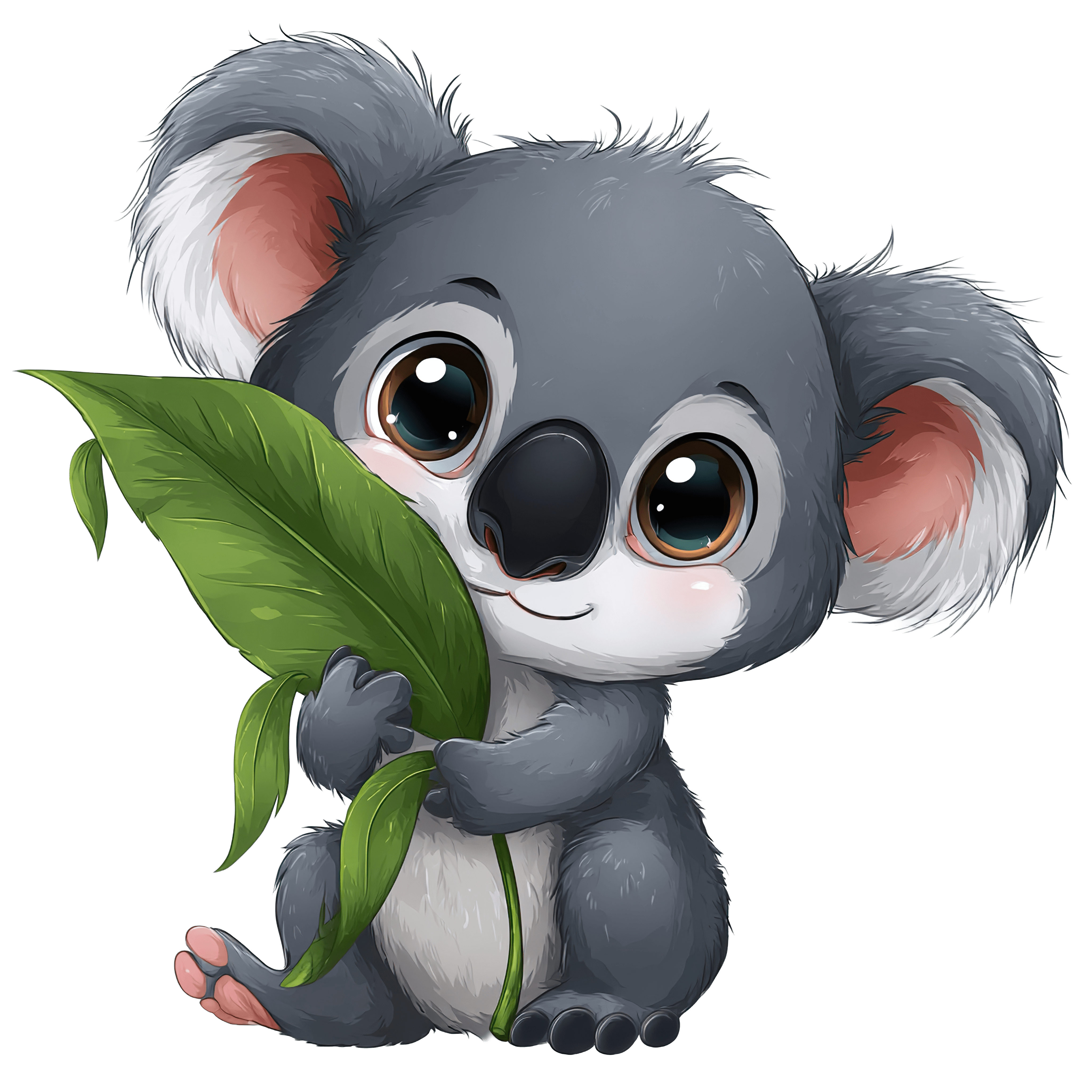 This illustration features a gray koala holding a green leaf, showcasing its distinct large ears and black nose. The koala is rendered in a cartoon style with smooth lines and bold colors. It's ideal for educational materials, children's books, and printable art. The koala's features are simplified for an appealing look, making it suitable for various creative projects.