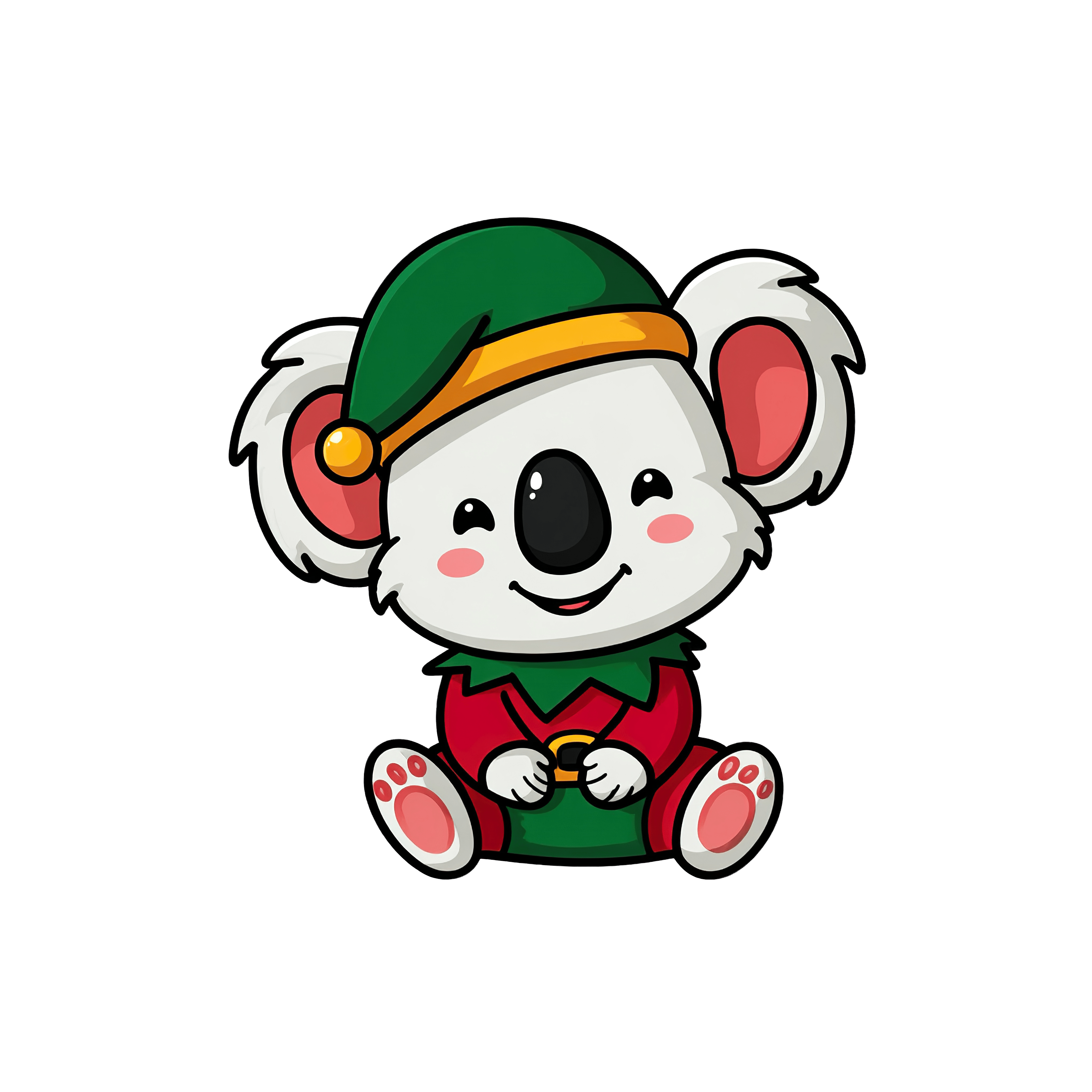 Cartoon koala illustrated in a festive elf outfit featuring a green hat and red clothing. The koala is seated, displaying its signature large nose and rounded ears with pink interiors. The design is simple and colorful, capturing the essence of holiday cheer with a vibrant and approachable style, ideal for holiday-themed projects.