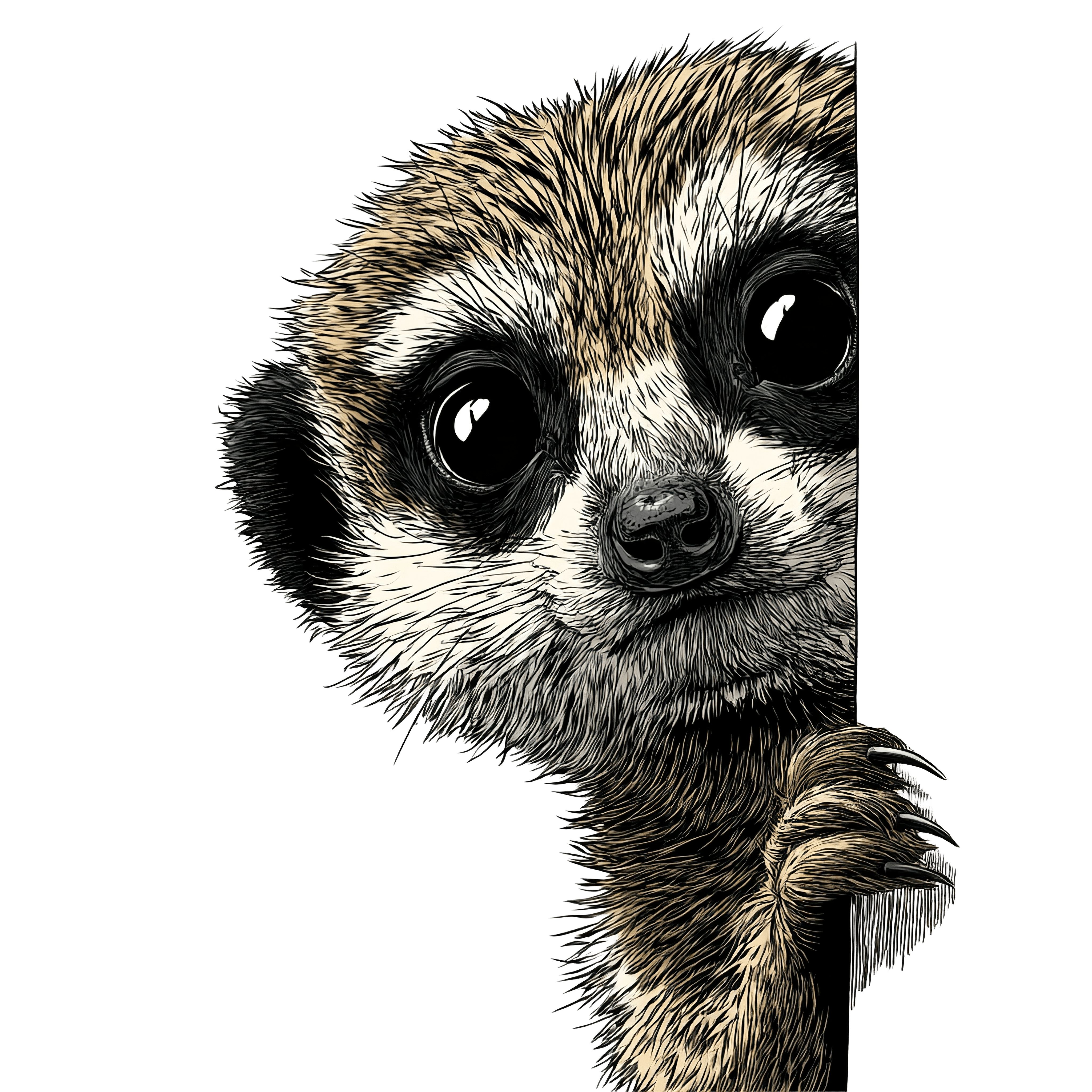 Meerkat illustration capturing its curious gaze, depicted with detailed fur texture and dark eyes. The animal is shown emerging from the side, emphasizing its signature slender body. The fine linework and shading highlight the warm brown and white coloration, providing a realistic yet artistic representation. The design is suitable for use in educational materials or themed projects.