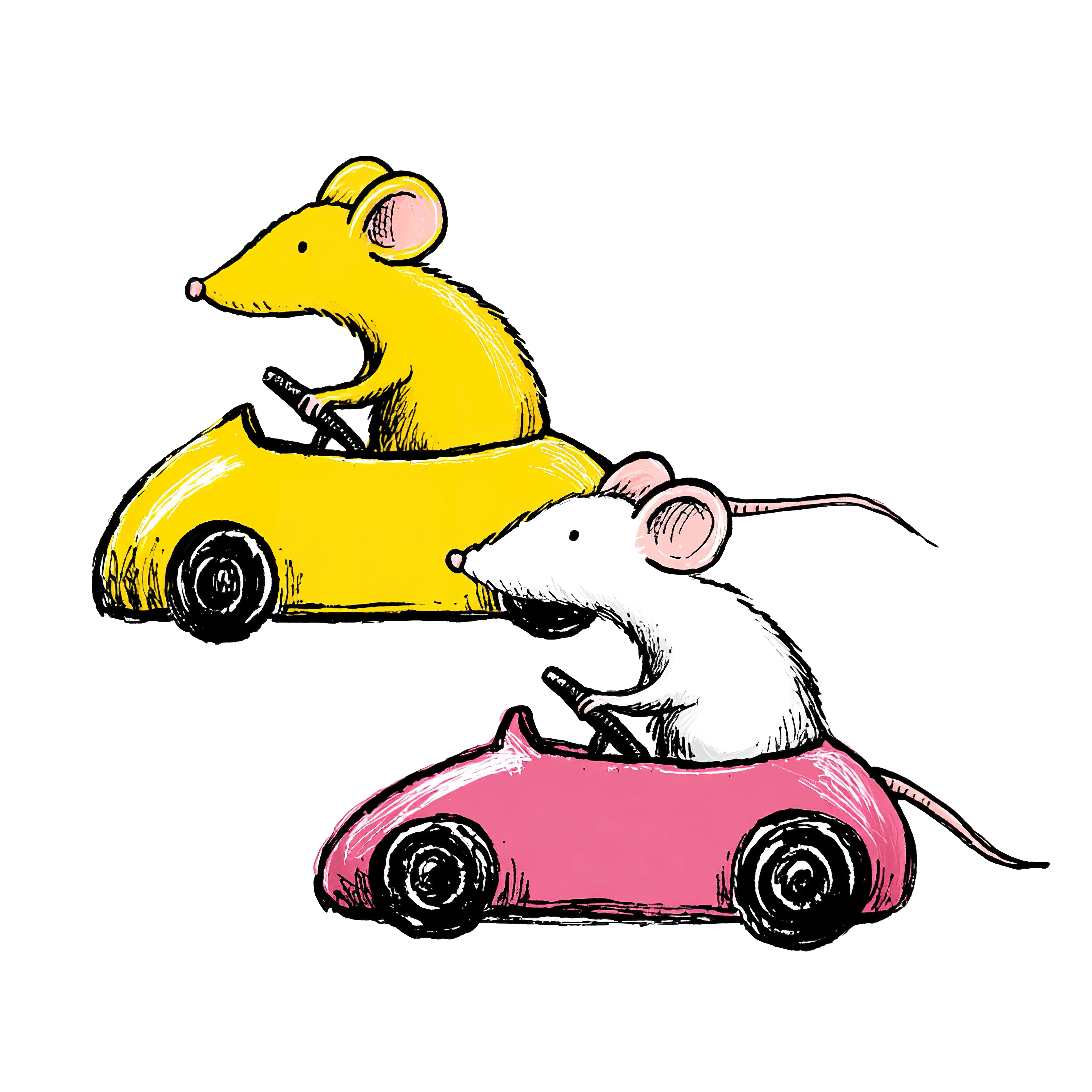 Yellow and white mice drive bright yellow and pink cars, showcasing a whimsical and playful theme. The illustration features a simple, hand-drawn style with bold outlines and vibrant colors. The mice are depicted from a side view, emphasizing their small bodies and large ears as they ride in their cartoon cars. The artwork emphasizes a fun and imaginative concept suitable for various creative projects.