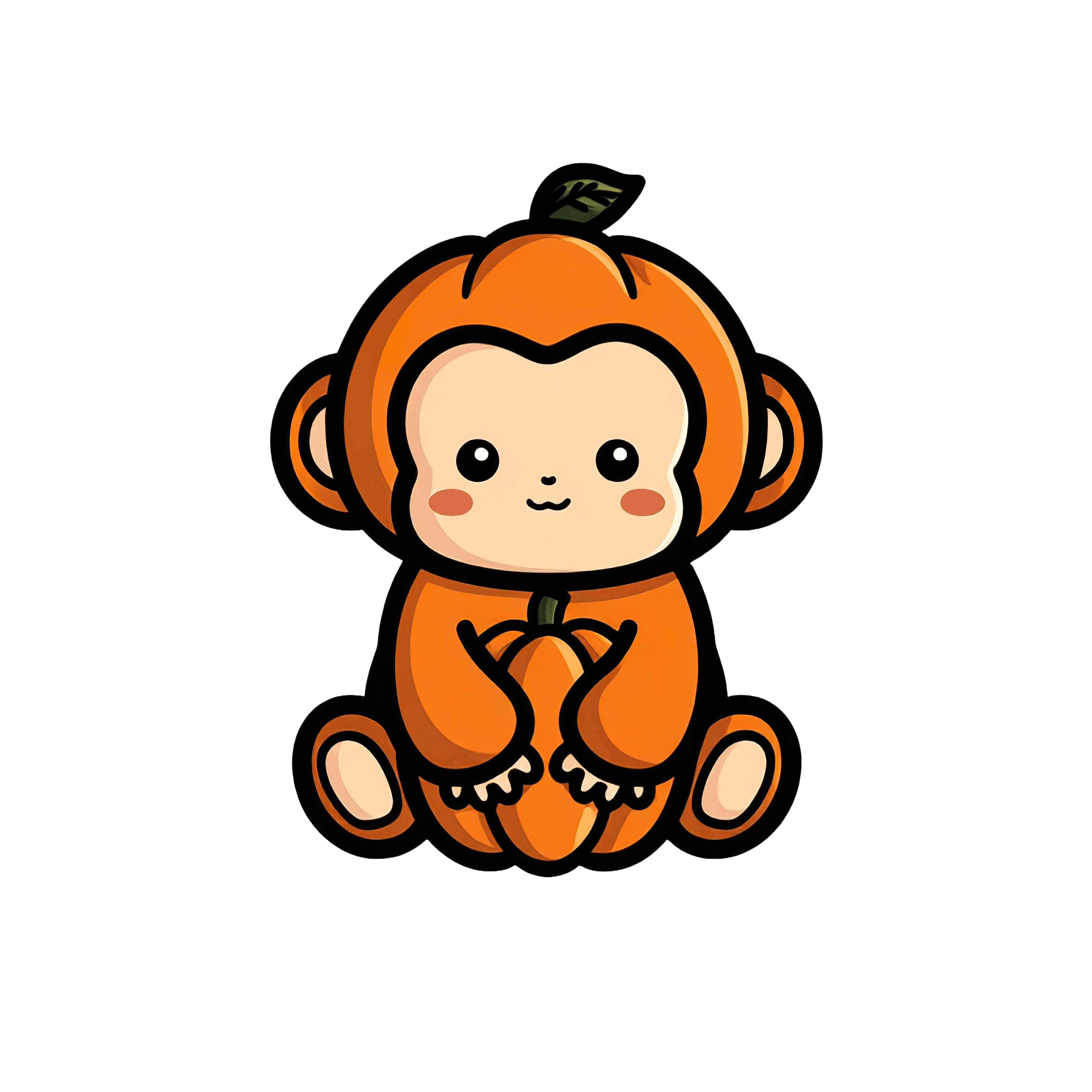 Monkey dressed in an orange pumpkin costume, holding a small pumpkin. The design has a clear outline, emphasizing the shape and features. The monkey's expression is neutral with defined lines, accenting its ears and face, while the pumpkin details are simple yet distinct, enhancing the theme.