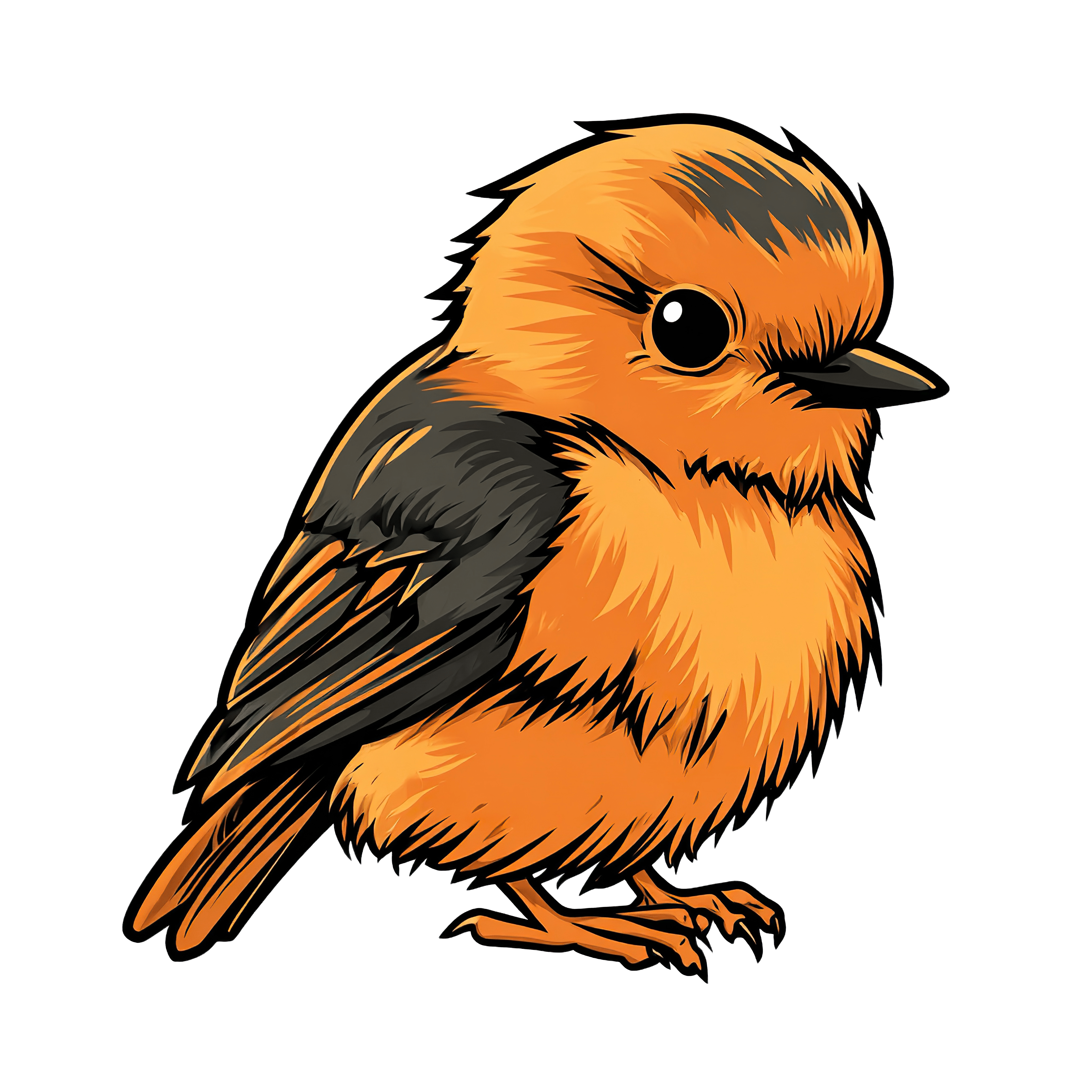 Orange and black bird with striking plumage and a round form. Detailed feathers highlight the bird’s body, accented by bold black marks. Stylized illustration with a clear focus on coloration and pattern. Ideal for use in educational materials, illustration projects, or nature-themed designs.