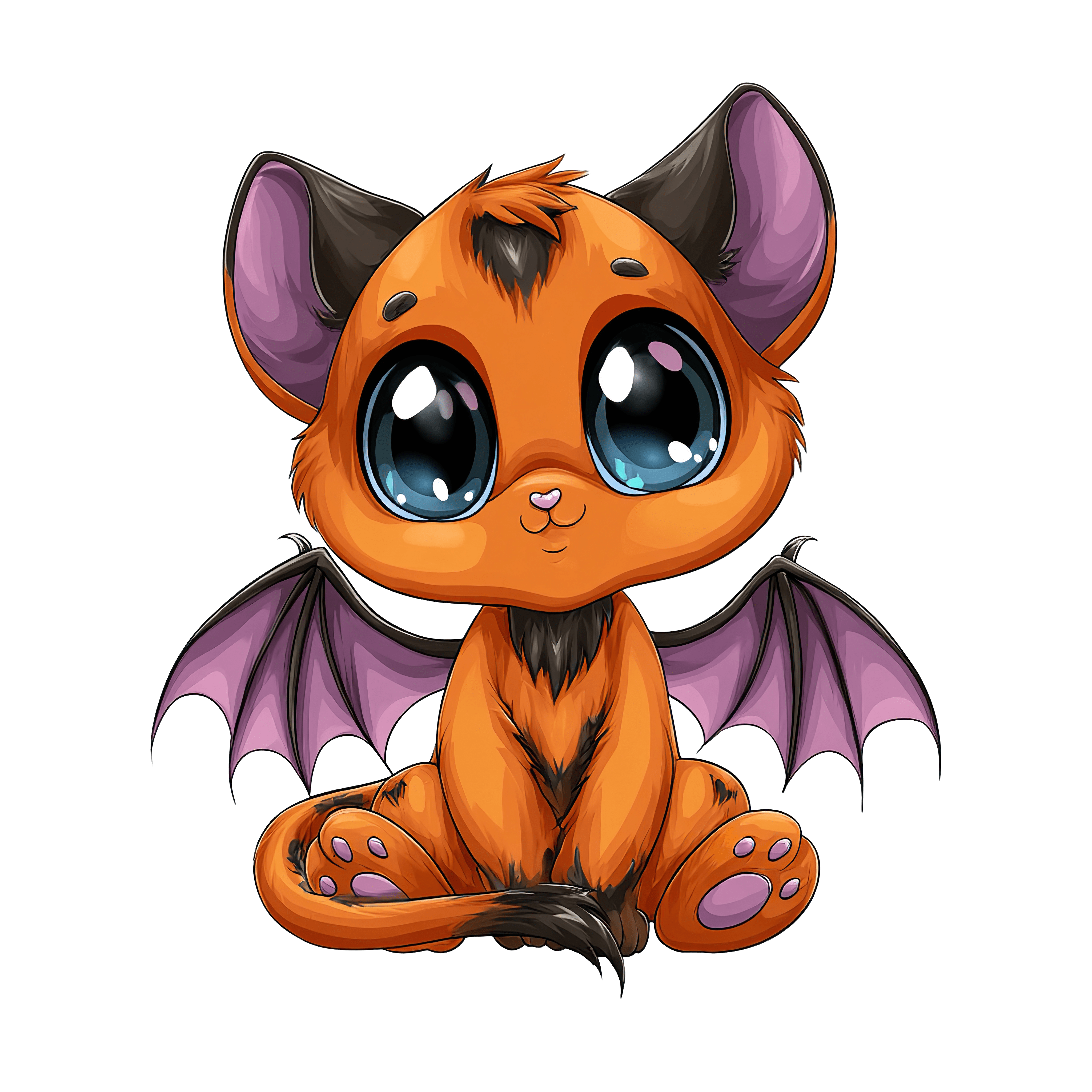 Cartoon illustration of a young orange bat sitting with large eyes and purple wings. The bat has prominent ears, a small nose, and is drawn with a soft, colorful style. The image is designed as clipart, suitable for use in various creative projects, including printable materials and decorations. The character presents a simple yet engaging visual, focusing on essential animal features.