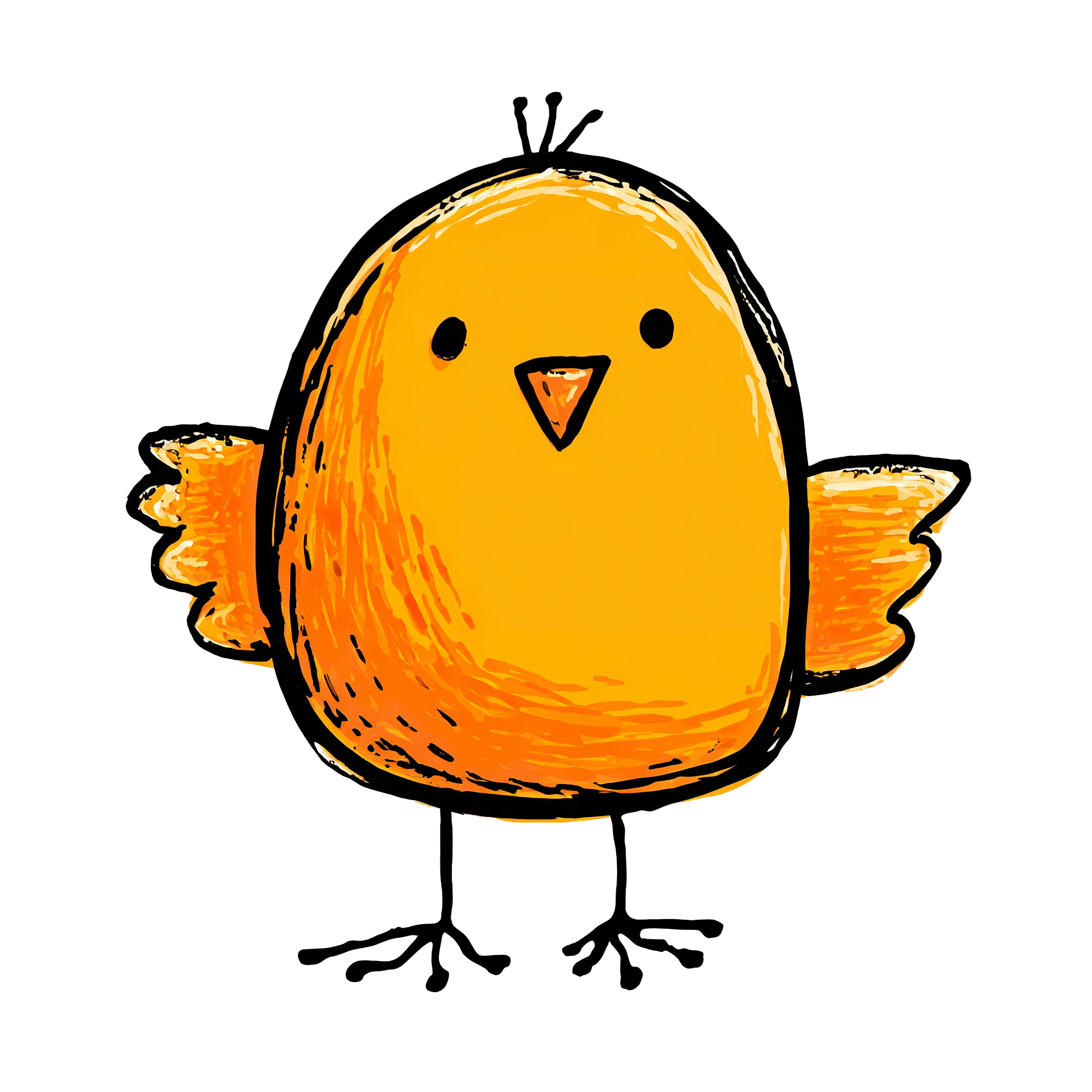 This clipart image features a simplistic illustration of a bird in orange, showcasing a round body with small black eyes and an open beak. The bird has outstretched wings and thin legs, drawn in a minimalistic style with a textured appearance. The design uses bold outlines and a textured fill, creating a distinctive, artistic look suitable for various design projects or educational materials.