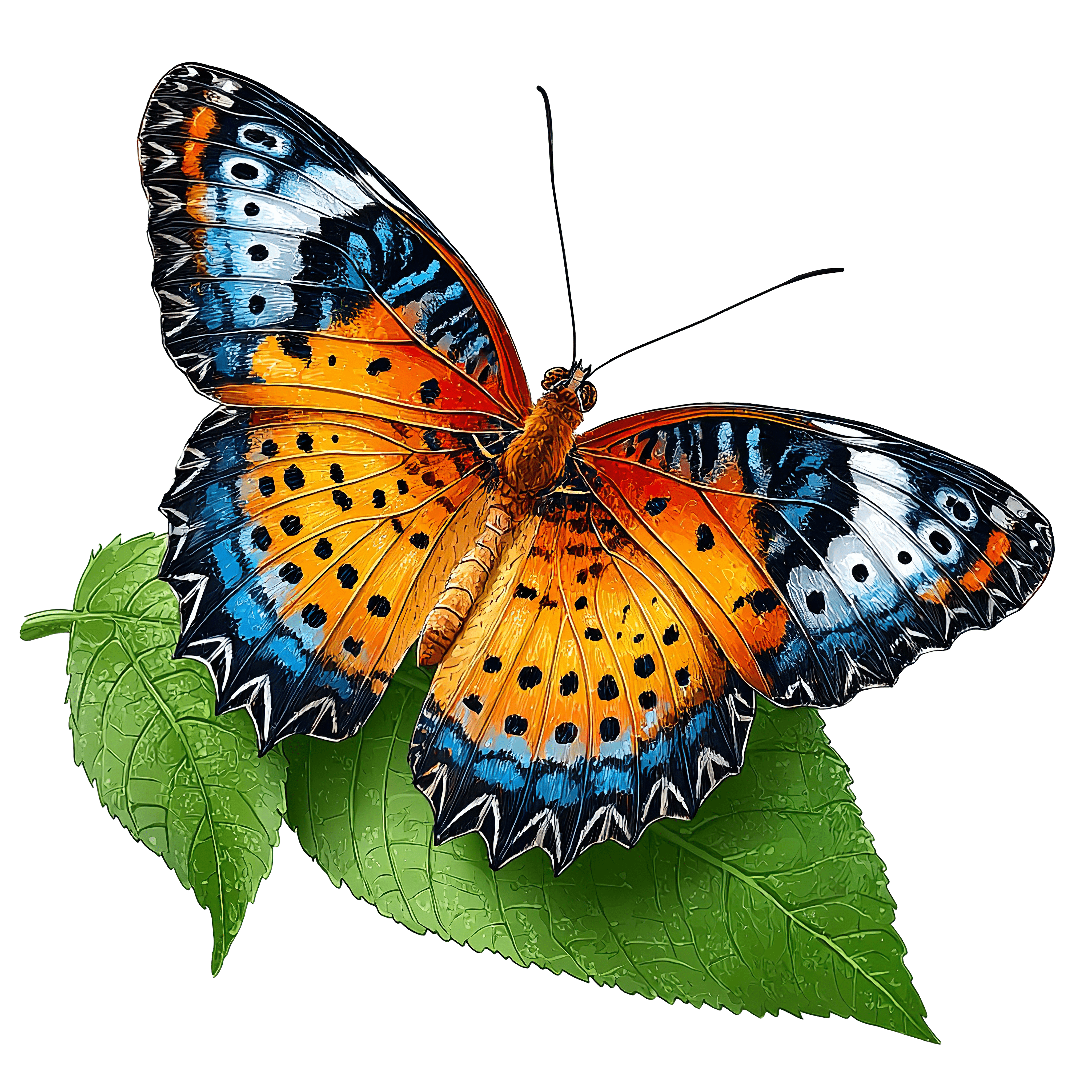 Orange Blue Butterfly Green Leaves Vibrant butterfly with orange and blue wings perched on green leaves.Download PNG ▼Download JPG ▼Related posts:Detailed Butterfly Illustration With Pink And Black PatternedWatercolor oranges with leaves and sliced halves fruit citrus clipart vector artCartoon White Rabbit Holding an Orange Carrot ClipartDetailed illustration of a pink lotus flower with layered petalsWatercolor Pumpkin with Stem for Autumn Celebrations holiday halloween thanksgiving orange clipartColorful Blue Orange Butterfly Showcasing Intricate Wing PatternsBird Wearing a Large Wizard Hat ClipartVibrant Pink Dahlia Flower with Detailed Petals and Green LeafGreen dinosaur in Santa hat and red coatYellow owl clipart with detailed feathersBlack Cat Face with Intense Yellow Eyes ClipartElegant White Crocus Flowers with Green Leaves on Black