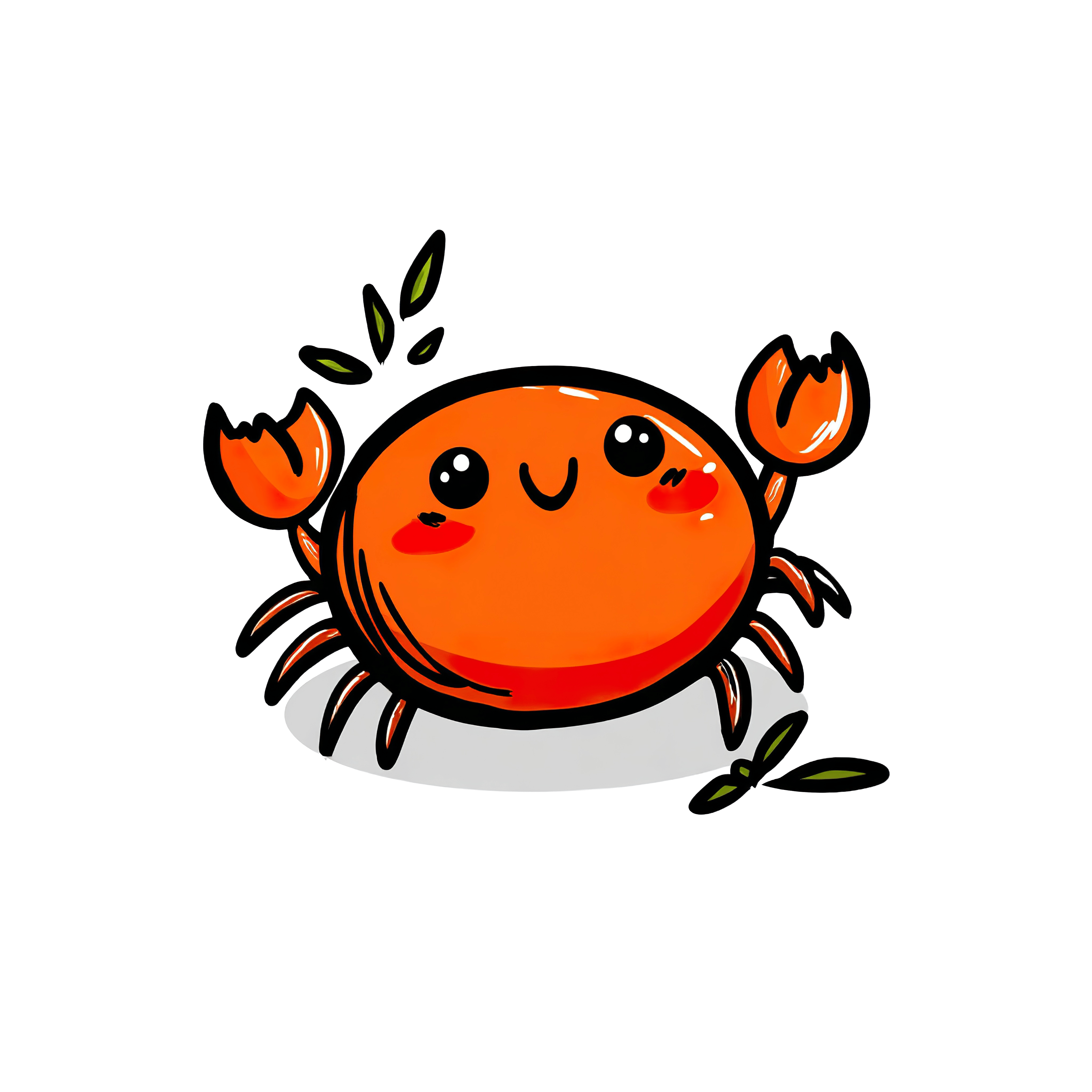 A clipart image of a bright orange cartoon crab, featuring simple facial features and raised claws. The crab is accented with small green leaves, adding a decorative touch. The image has a clean, bold outline and vibrant colors, making it suitable for various design projects involving marine life or playful themes.
