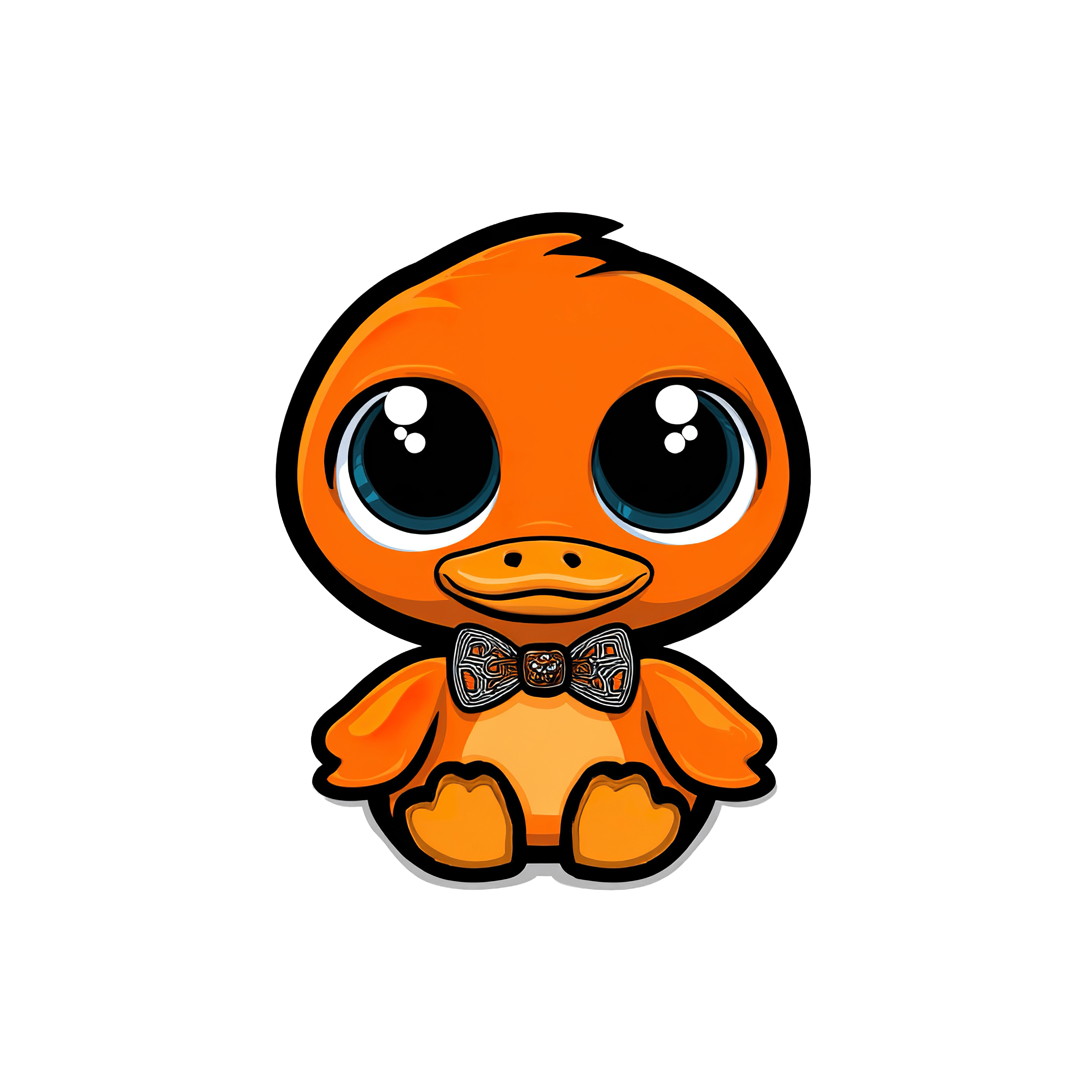 A digital clipart image of an orange duck in a cartoon style. The duck features large, round eyes and a decorative bow tie. Its body is simplified with smooth lines, emphasizing a clean design. This vector art adds a playful element to any project requiring an animal icon.