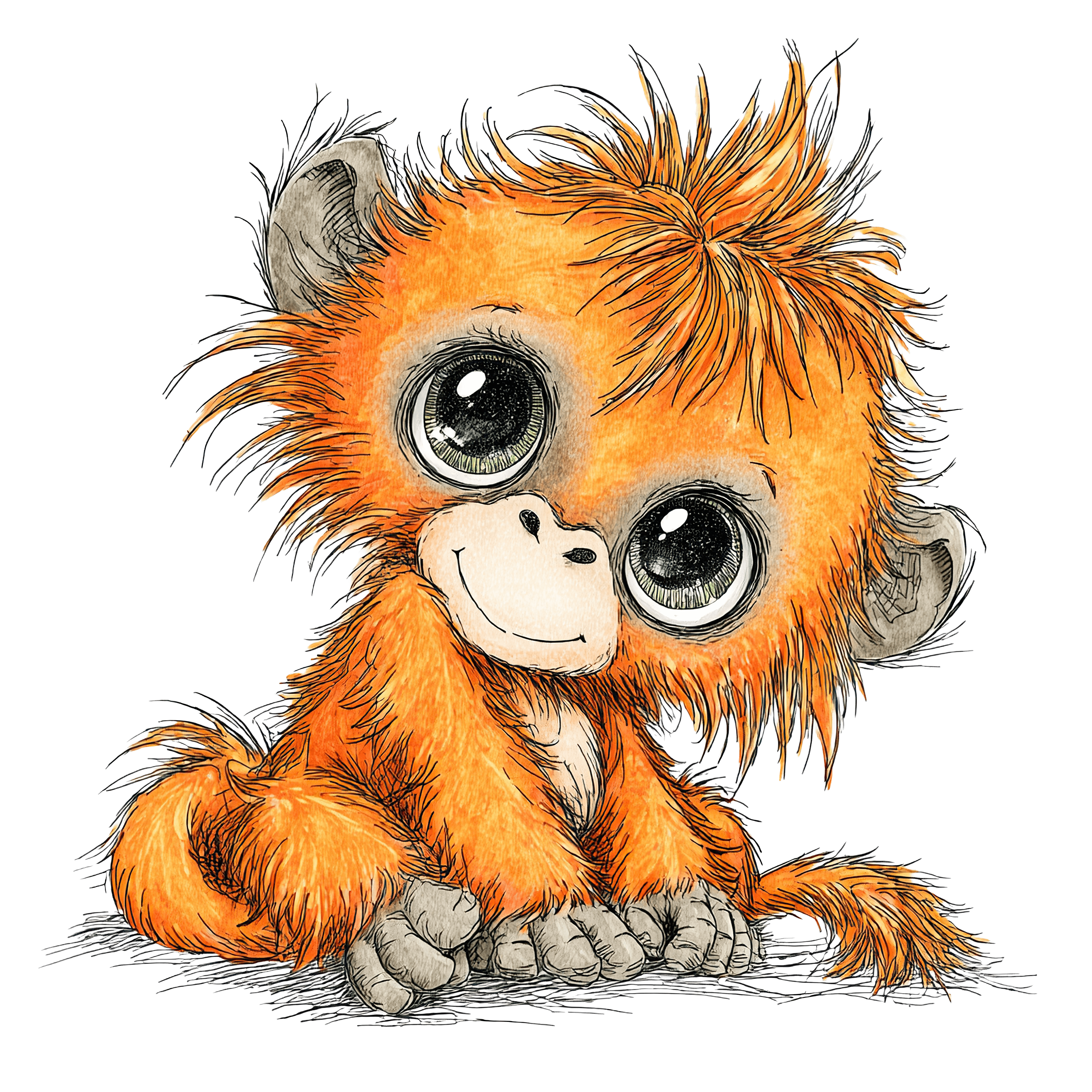 Orange monkey with fluffy, textured fur and large, expressive eyes. The digital illustration uses bold lines and vibrant colors to emphasize the monkey's distinctive features. Its bushy tail curls beside its body, and the large ears add to its distinct character. Styled in a playful cartoon manner, perfect for children's illustrations or educational materials.