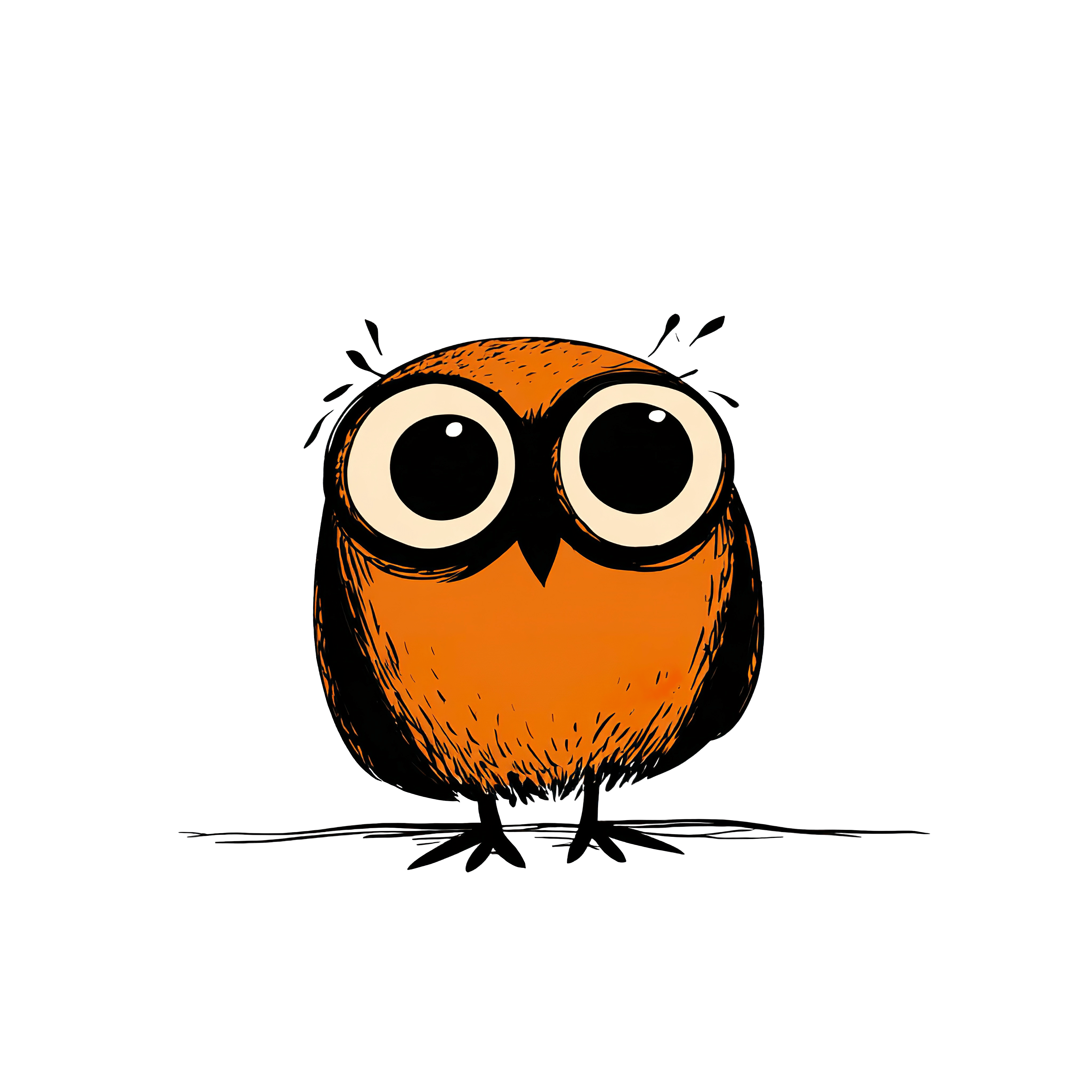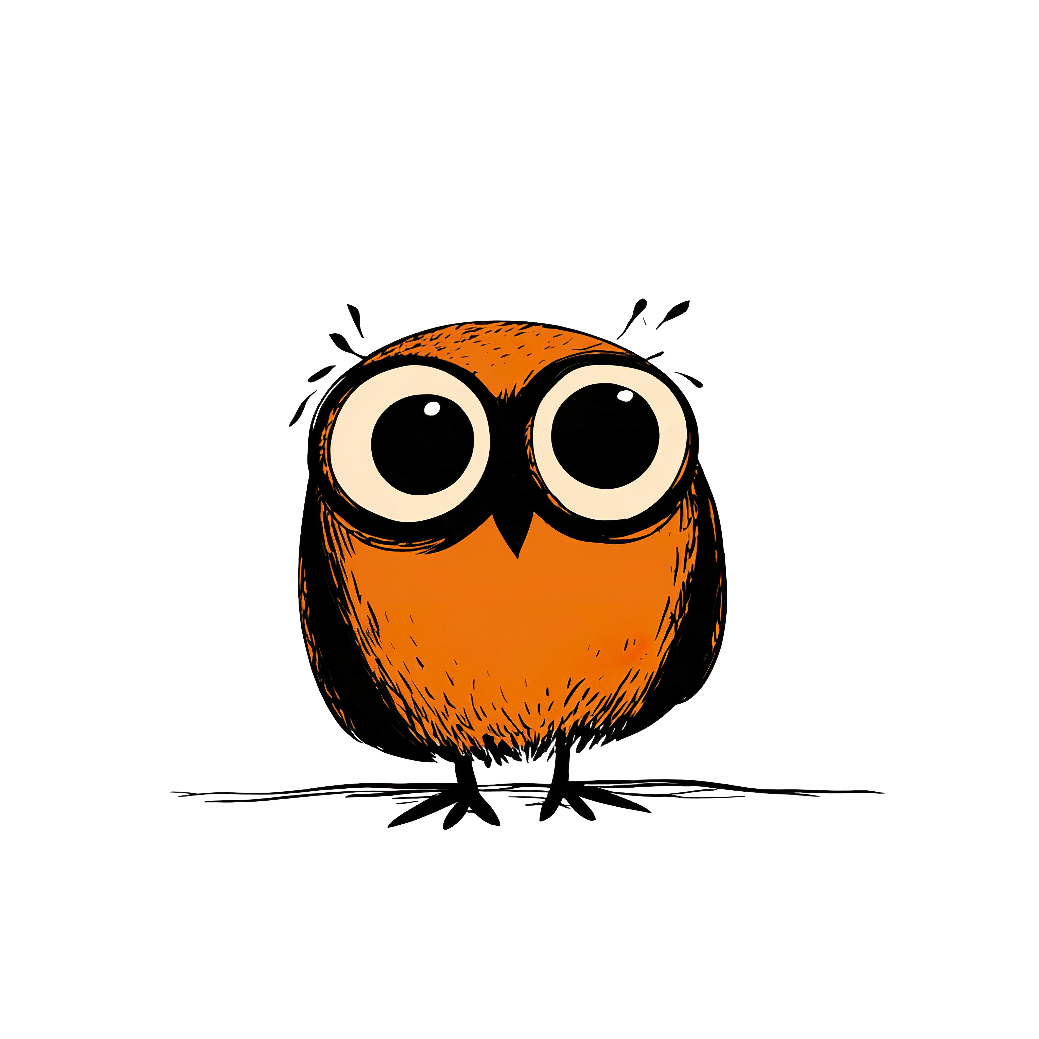 Orange owl with prominent black eyes, illustrated with a textured drawing style. Dark wing feathers contrast with lighter orange areas, and the round body is perched atop two simplified legs. The oversized eyes and minimalist features highlight the owl, creating a bold and simple design.