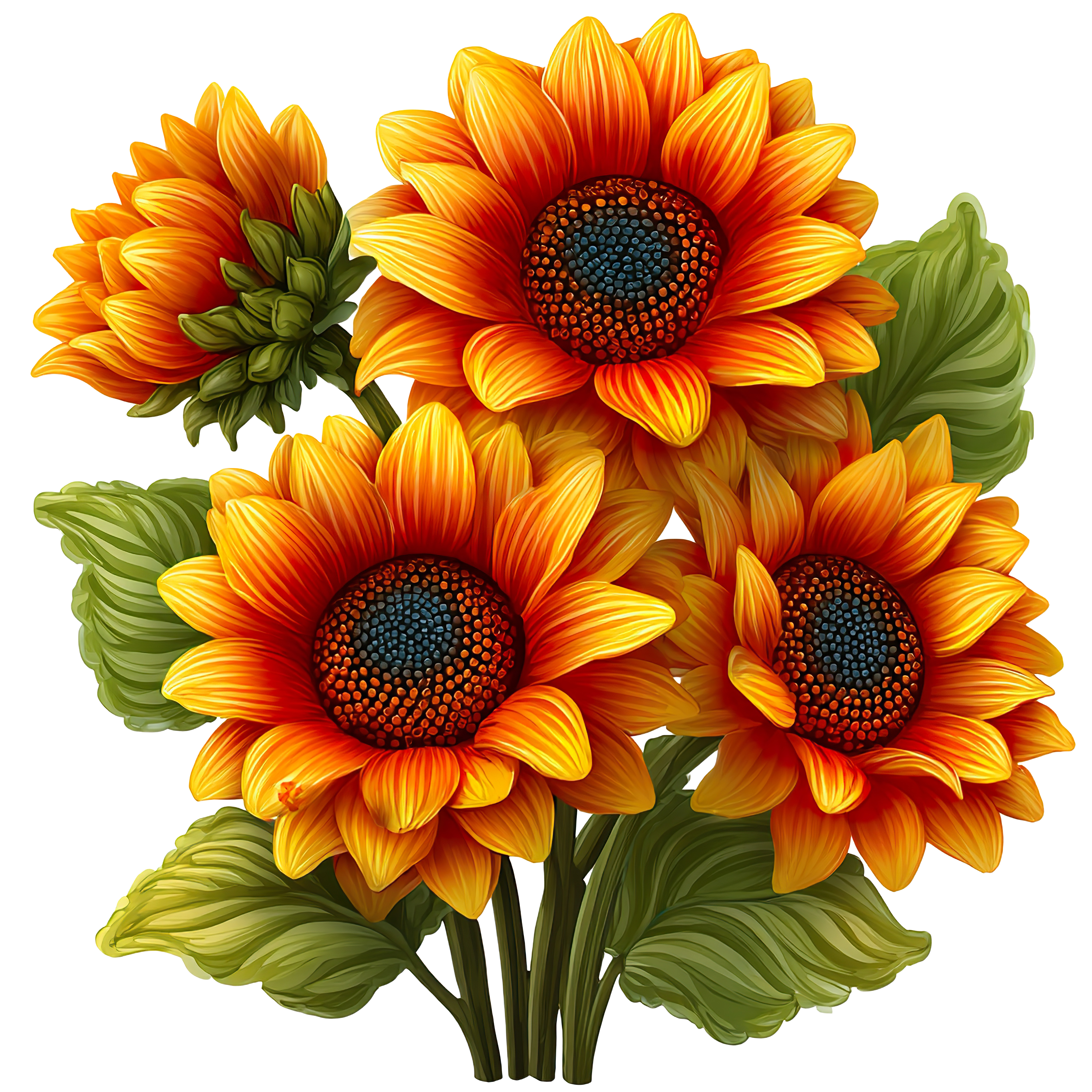 Orange Sunflowers Green Leaves Clipart Bright orange sunflowers with green leaves.Download PNG ▼Download JPG ▼Related posts:Elegant Woman in Sparkling Blue Gown with Flowing HairWatercolor Red Onion with Detailed Texture and ColorDetailed Blue Butterfly With Intricate Wing Patterns IllustrationVibrant Green Celery Stalks with Lush LeavesVibrant Corn Stalks with EarsIntricate Gingerbread Star Ornament with Decorative IcingWatercolor Parsley Plant with RootsWatercolor Green Cactus with Pink Flowers on BlackCreamy Milkshake in a Plastic Cup with StrawColorful Clown Face with Red Nose and Bright EyesWatercolor Illustration of Red Poppy Flowers and Green Leaves ArrangementWatercolor Illustration of a Green Aloe Vera Plant