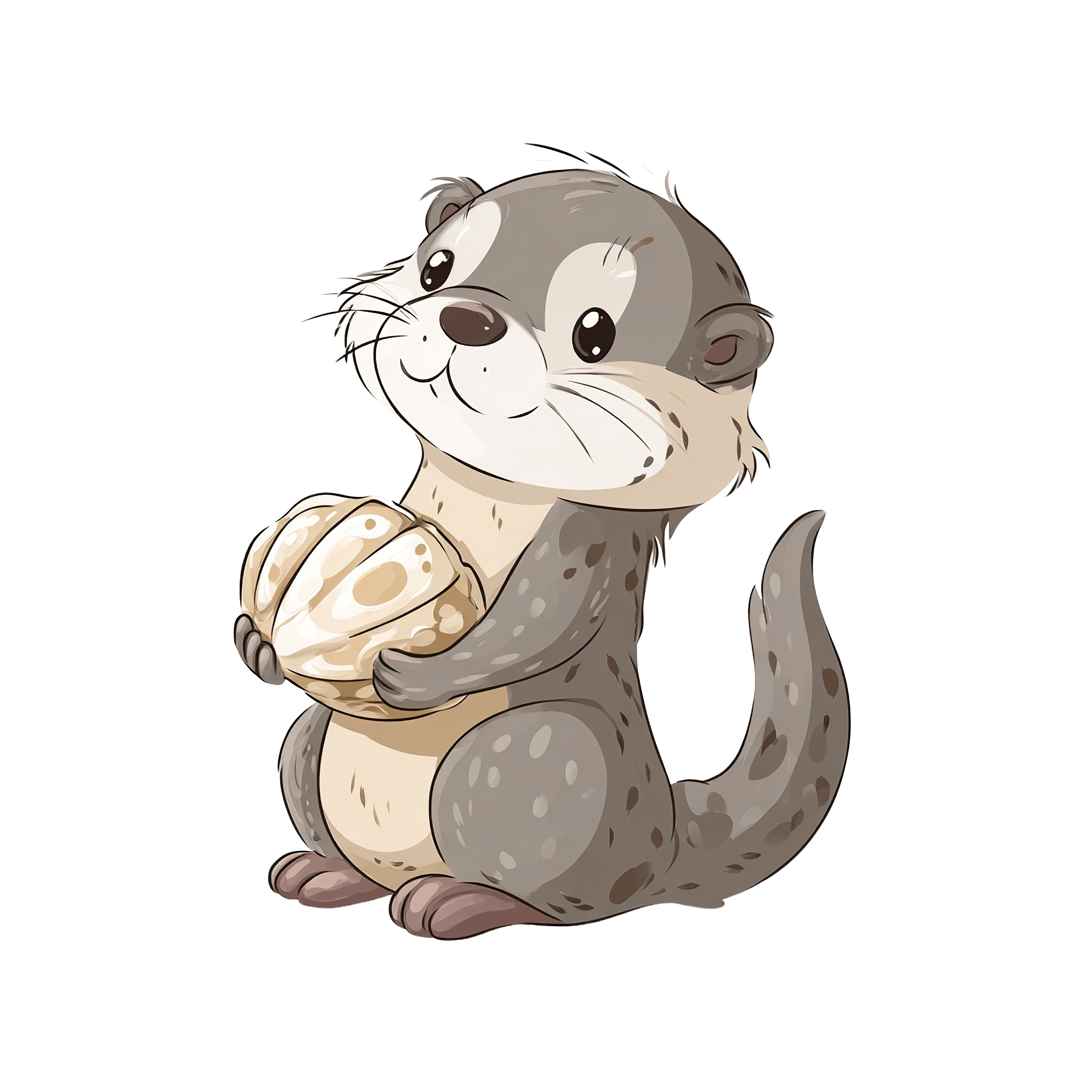 Otter with grey fur and a cream-colored belly, holding a large seashell. Simplified cartoon style with a focus on round eyes and prominent whiskers. The otter's tail is curved at the end, and its body features light grey spots.