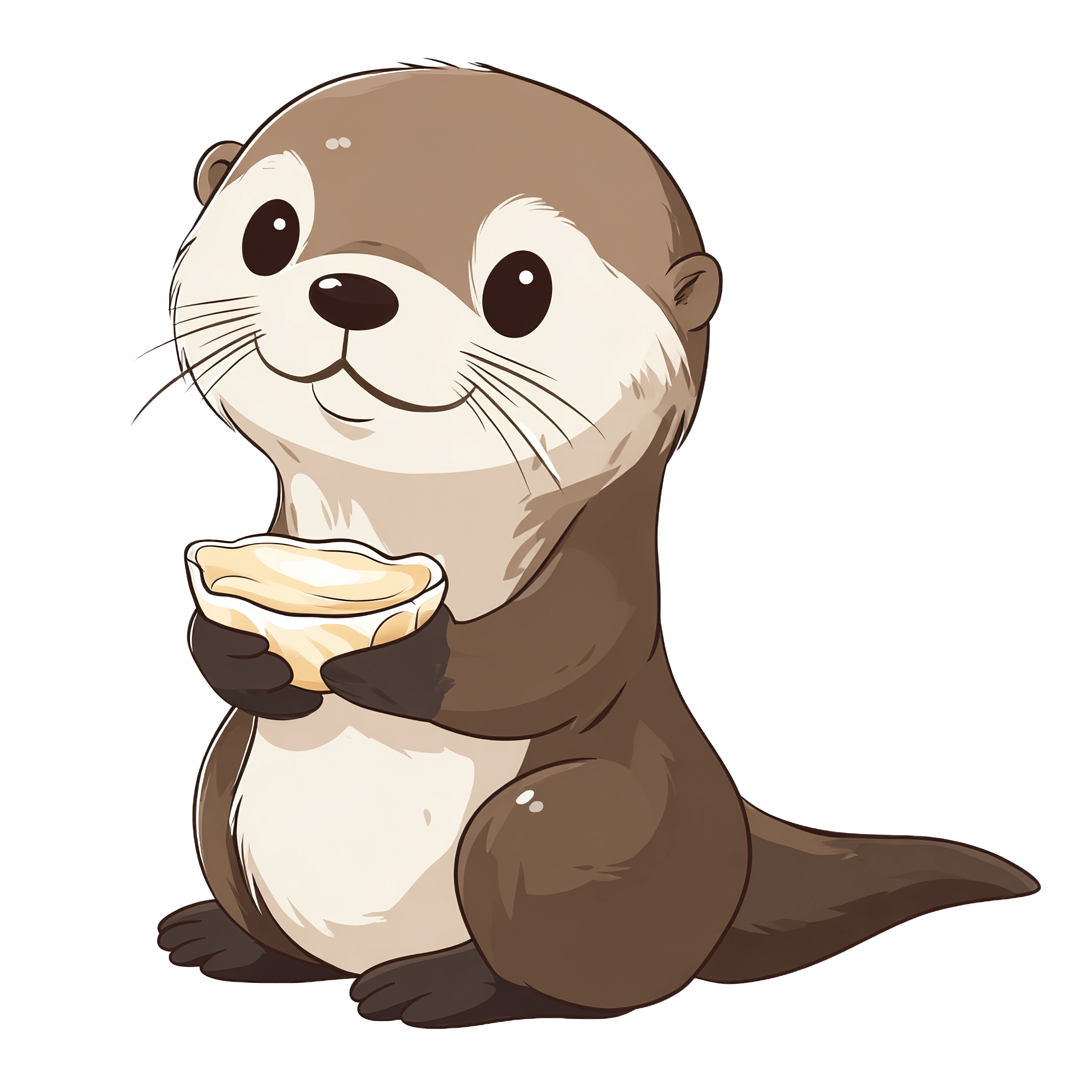 Otter illustration in a seated position holding a shell with both paws. Featuring a smooth brown coat and white accents, the animal showcases large, expressive eyes and distinct whiskers. The image emphasizes the otter's natural form with a simple and clean design, ideal for a range of creative projects.