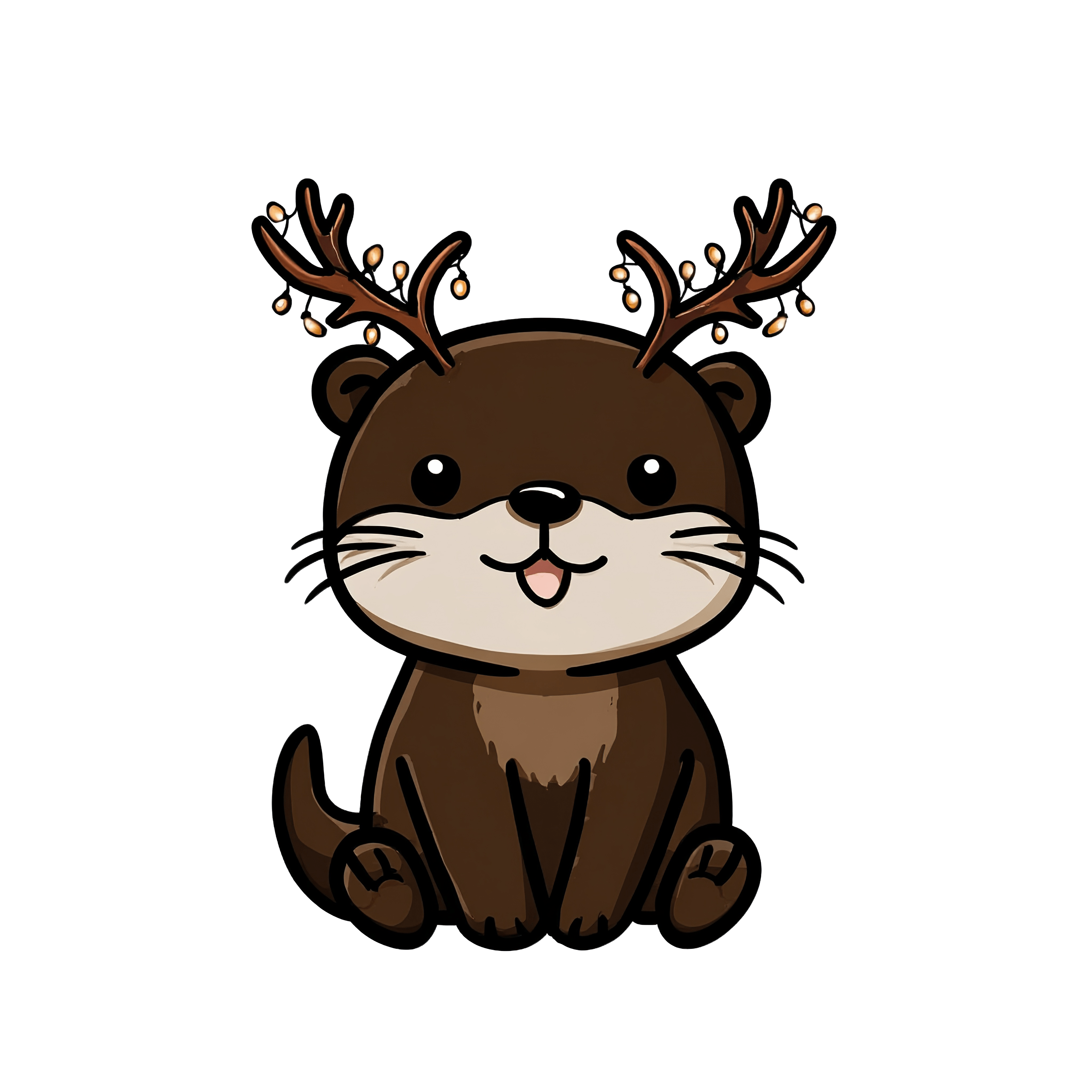 Brown otter with distinctive antlers, detailed facial features, and slight shading, sitting upright. Simple lines and vibrant colors highlight the design. Antlers are adorned with small ornamental bulbs, adding a whimsical touch.