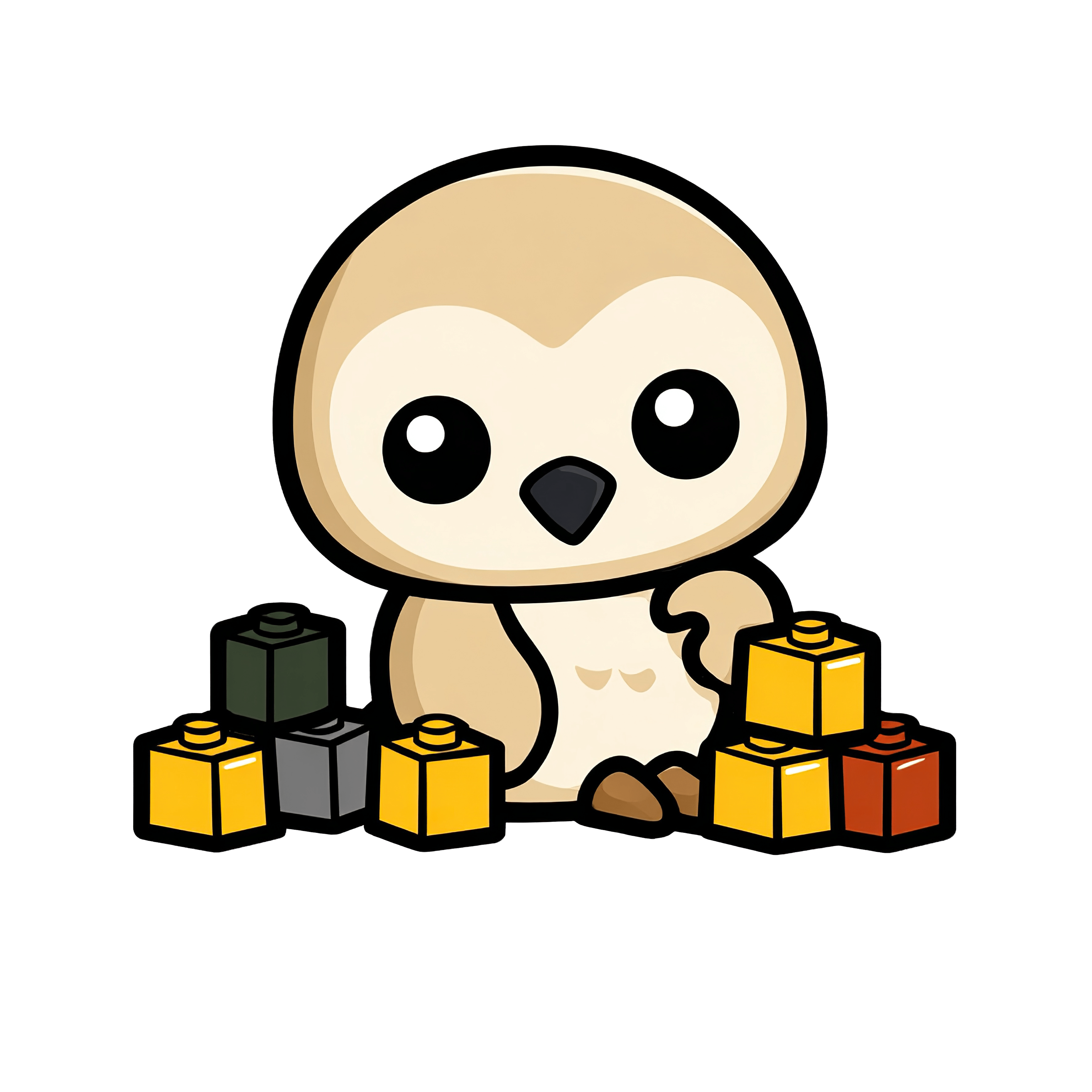Owl sitting among multicolored blocks, featuring a round body, large black eyes, beige and white feathers, and a small beak. Surrounded by yellow, black, grey, red, and green blocks arranged casually. The simple, bold-lined style gives a clean and minimal appearance, making it versatile for any use.