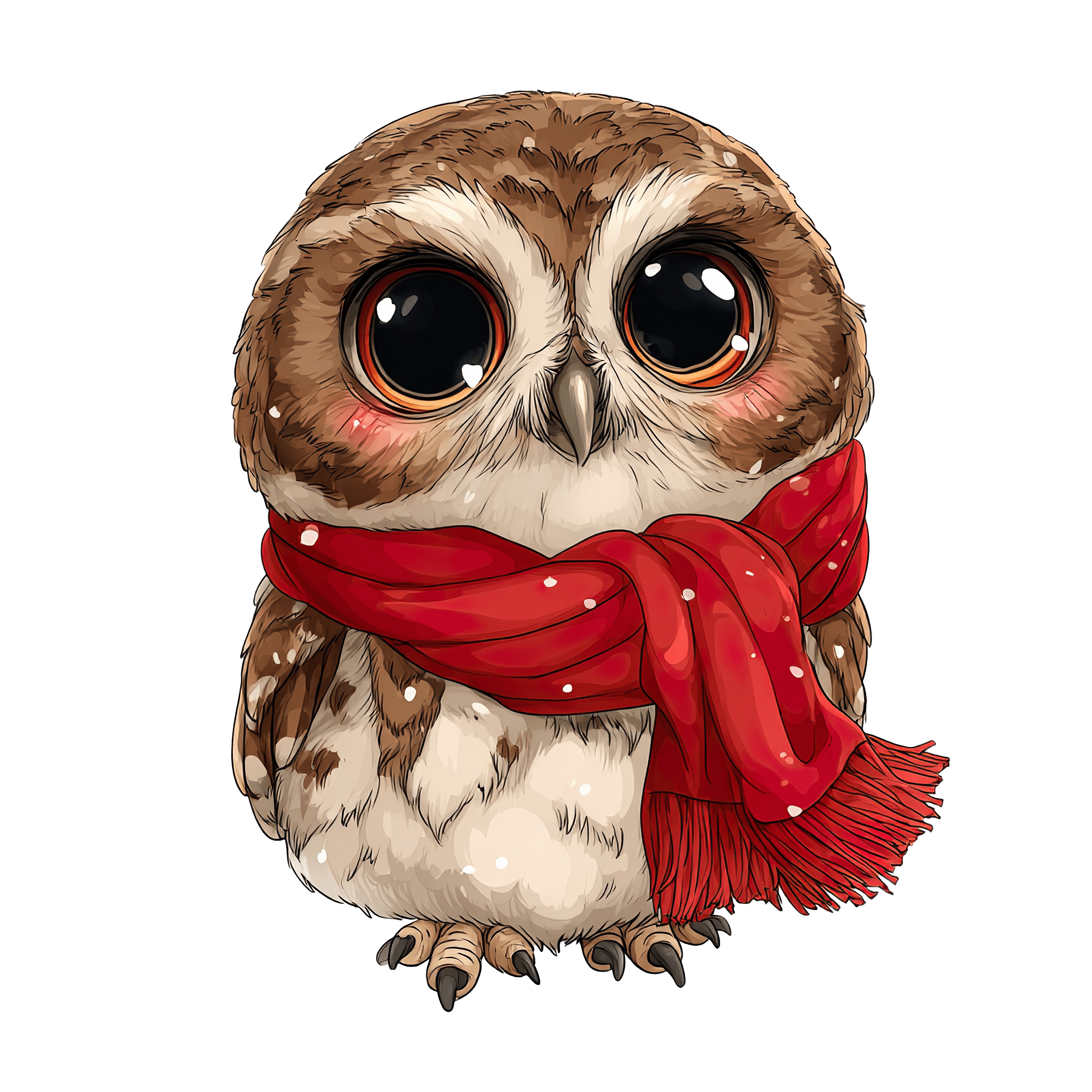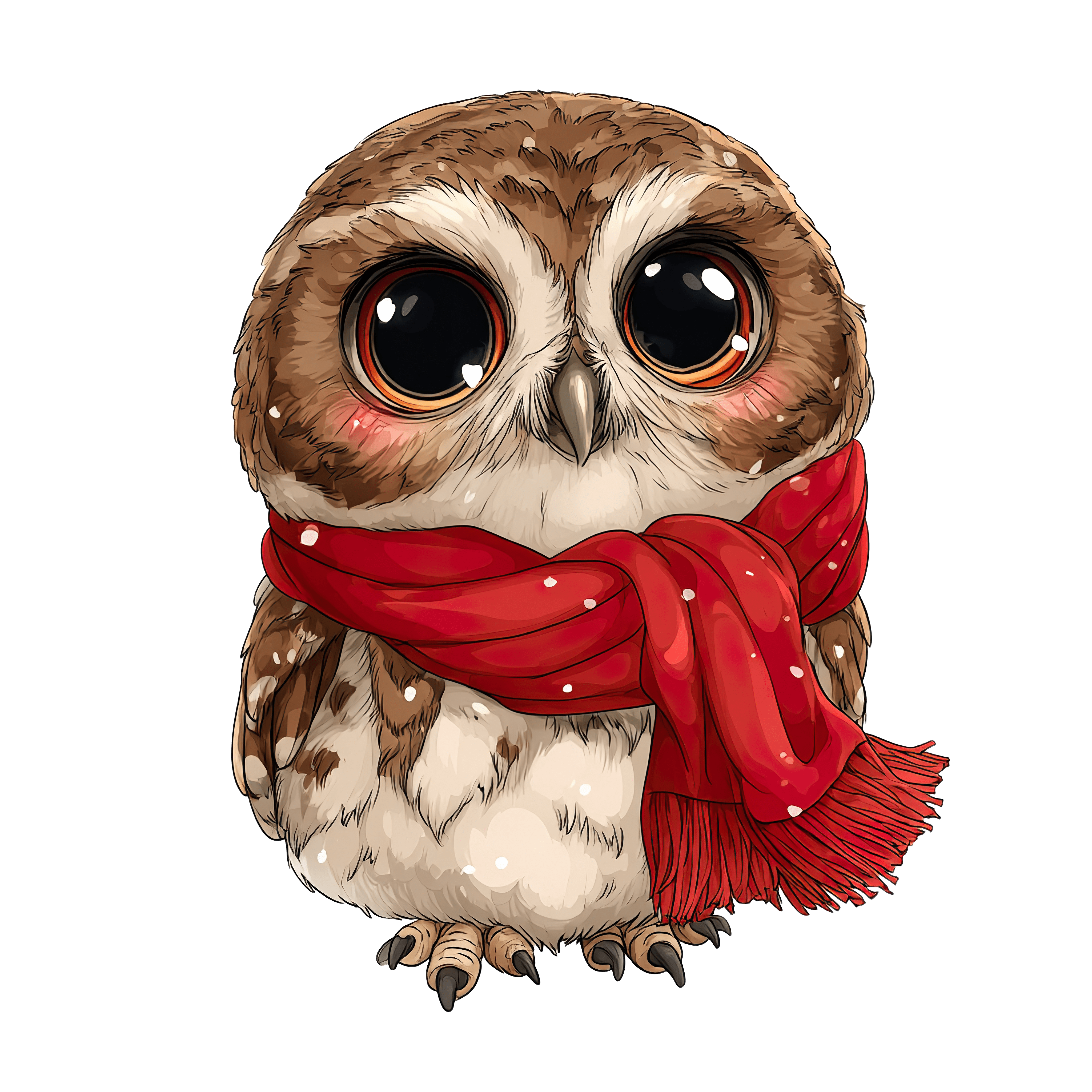 Owl with large eyes and brown and white feathers, wrapped in a bright red scarf. The illustration highlights the detailed feather patterns and the contrast of the vibrant scarf against the owl's natural tones. A simple and engaging digital artwork focusing on the owl's features and wintry accessory.