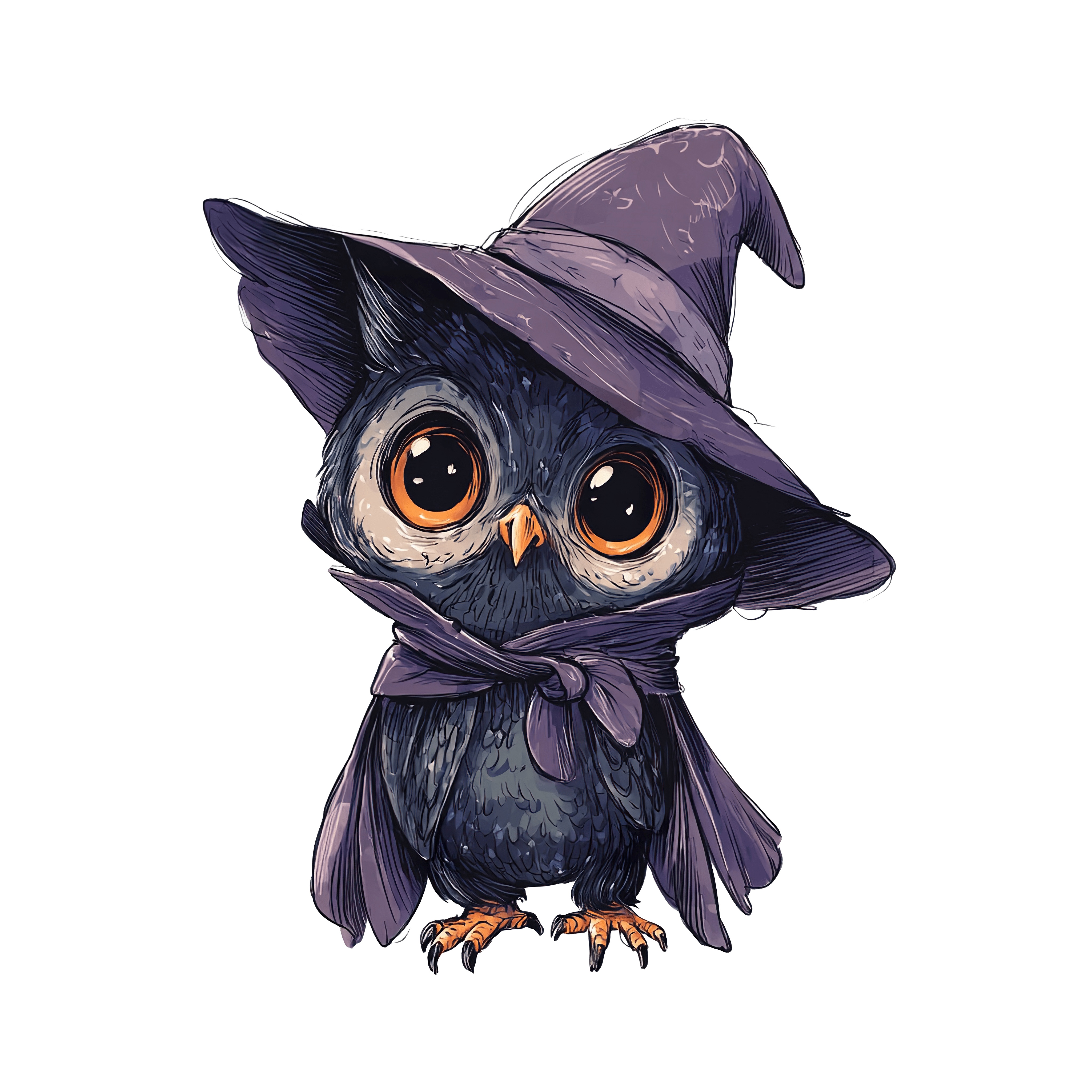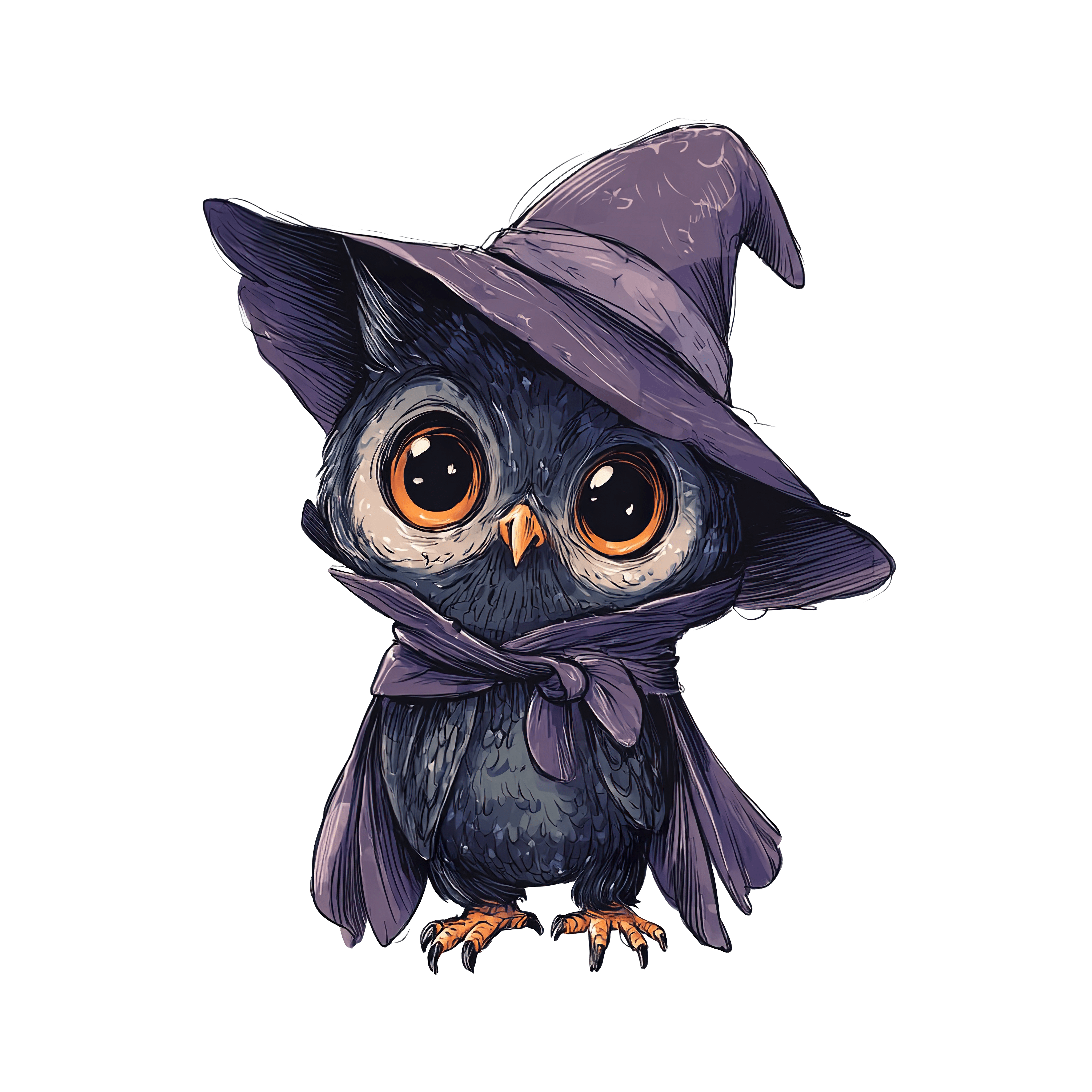 Owl illustration featuring a detailed design with a large purple witch hat and matching scarf. The owl's feathers are primarily dark with prominent eyes and an orange beak. Artistic details highlight its textured plumage and sharp talons, set against a clear background.