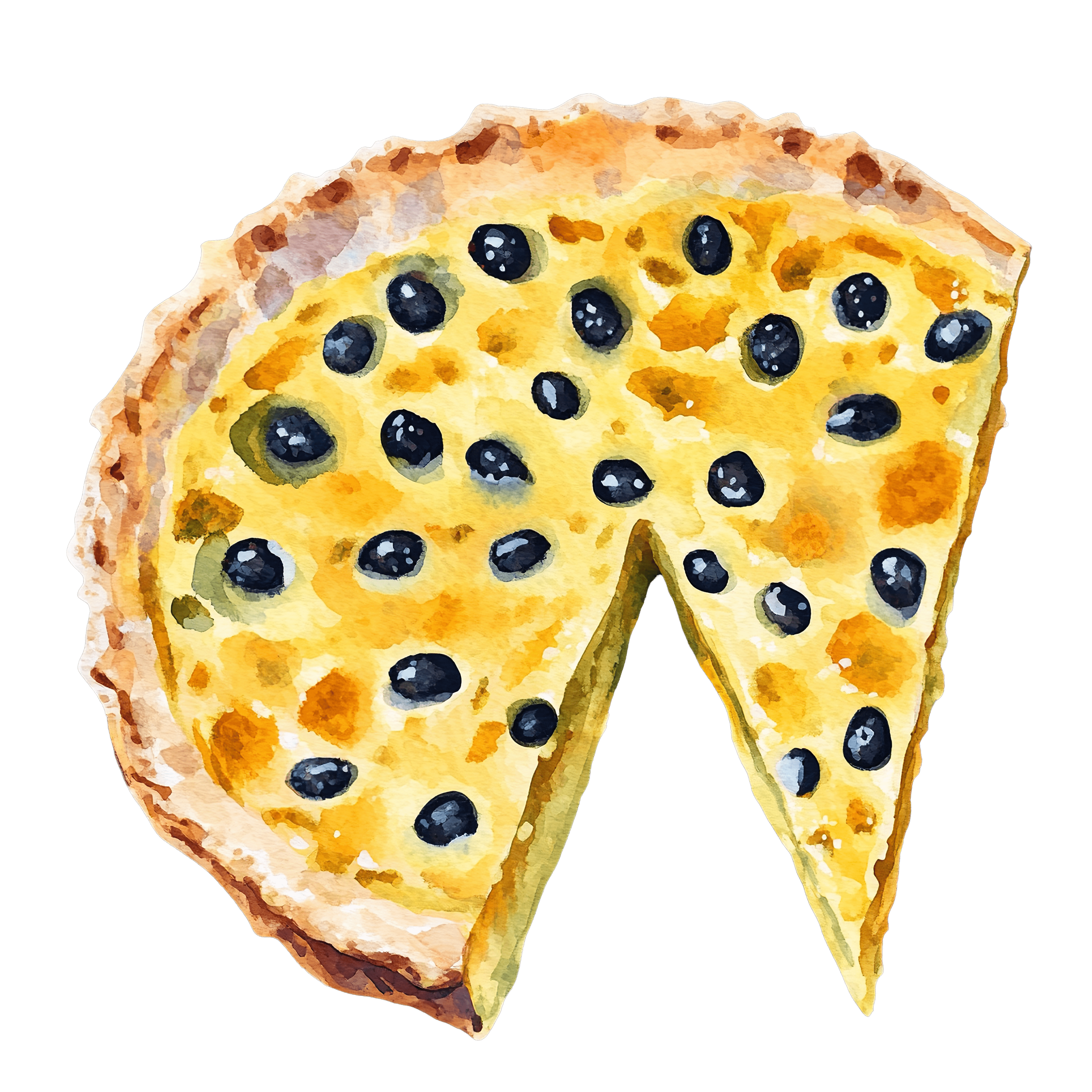 Passionfruit Cheesecake Slice with Blueberries Clipart Passionfruit cheesecake with blueberries and a slice removed.Download PNG ▼Download JPG ▼Related posts:Assorted Colorful Macarons in Watercolor StyleWatercolor Fruit Tarts with Berries and Mint LeavesWhole and Halved Apricots with LeafBlue Cup of Coffee with Heart-Shaped Latte ArtTwo Slices of Dried Lemon in Watercolor StyleTraditional Chinese Mooncakes Wrapped in Paper Liners food dessert watercolor clipart vectorGlass of Lemonade with Sliced Lemon and StrawCoconut halves with striped straw for tropical beveragePurple Hippo Clipart Illustration with Dot TextureChocolate Cake Slice with Cherries and Chocolate DrizzleMuffin Topped with Red Currants and Green LeavesKoala Wearing Festive Elf Costume Clipart