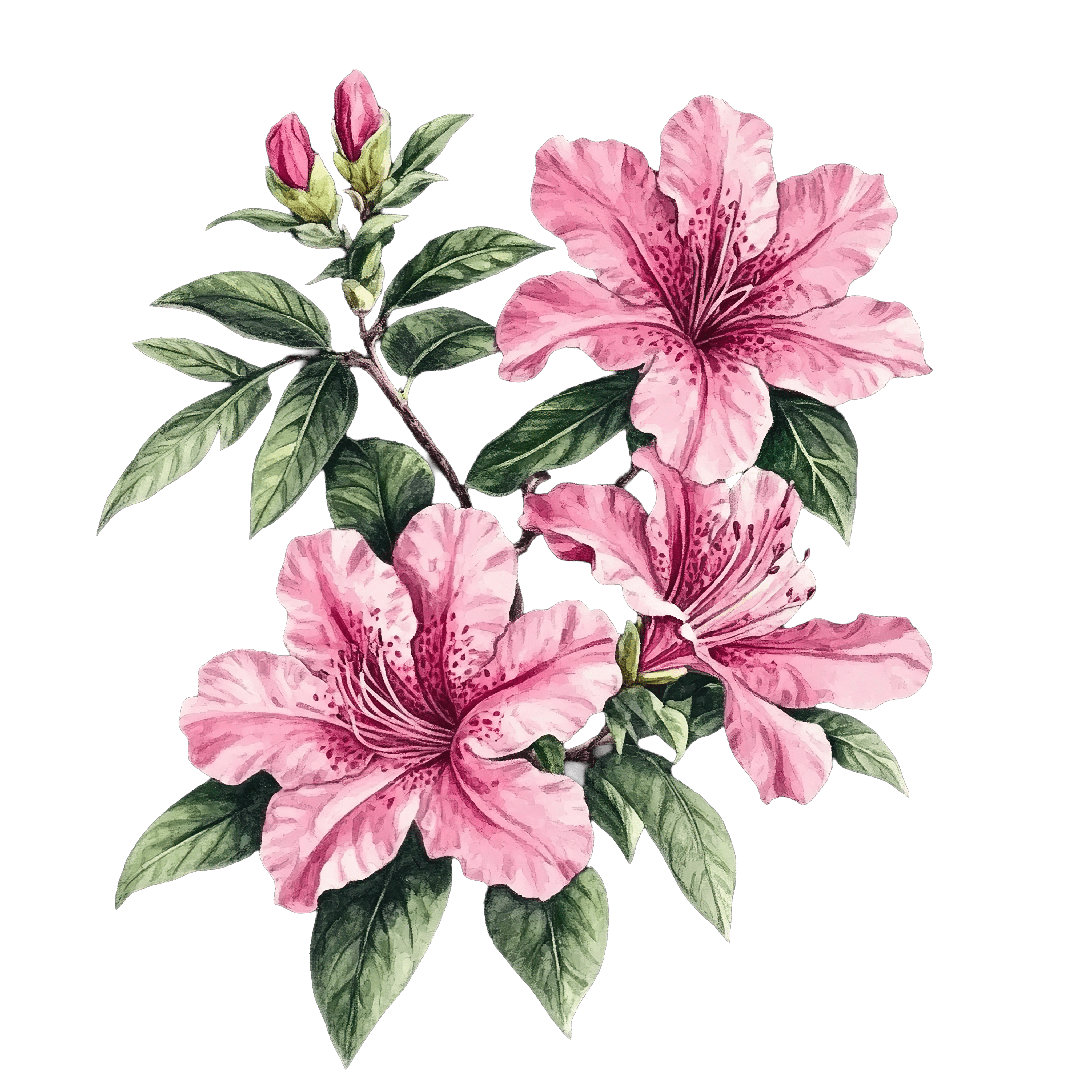 Pink Azalea Flowers with Green Leaves on Black Background Pink azalea flowers and green leaves depicted in detailed watercolor style.Download PNG ▼Download JPG ▼Related posts:Orange Sunflowers Green Leaves ClipartBanana Slices on Whole Grain Bread Clipart food snack vector art printableRefreshing Red Smoothie in Glass with StrawWoman with Wavy Hair and Red Bow Wearing EarringsArtistic Purple Grapes and Leaves Design ClipartCluster of Red Cranberries with Green Leaves fruit clipart vector art foodWoman in Vintage Style Outfit with Green Hat and Red FeatherBunch of Fresh Green Onions Tied with StringThree Lit Candles with Pinecones and Evergreen Foliage for Festive DecorPurple Hippo Clipart Illustration in Cartoon StyleBlackberry Danish Pastries with Icing and Fresh BerriesCartoon Sheep with White Wool Clipart
