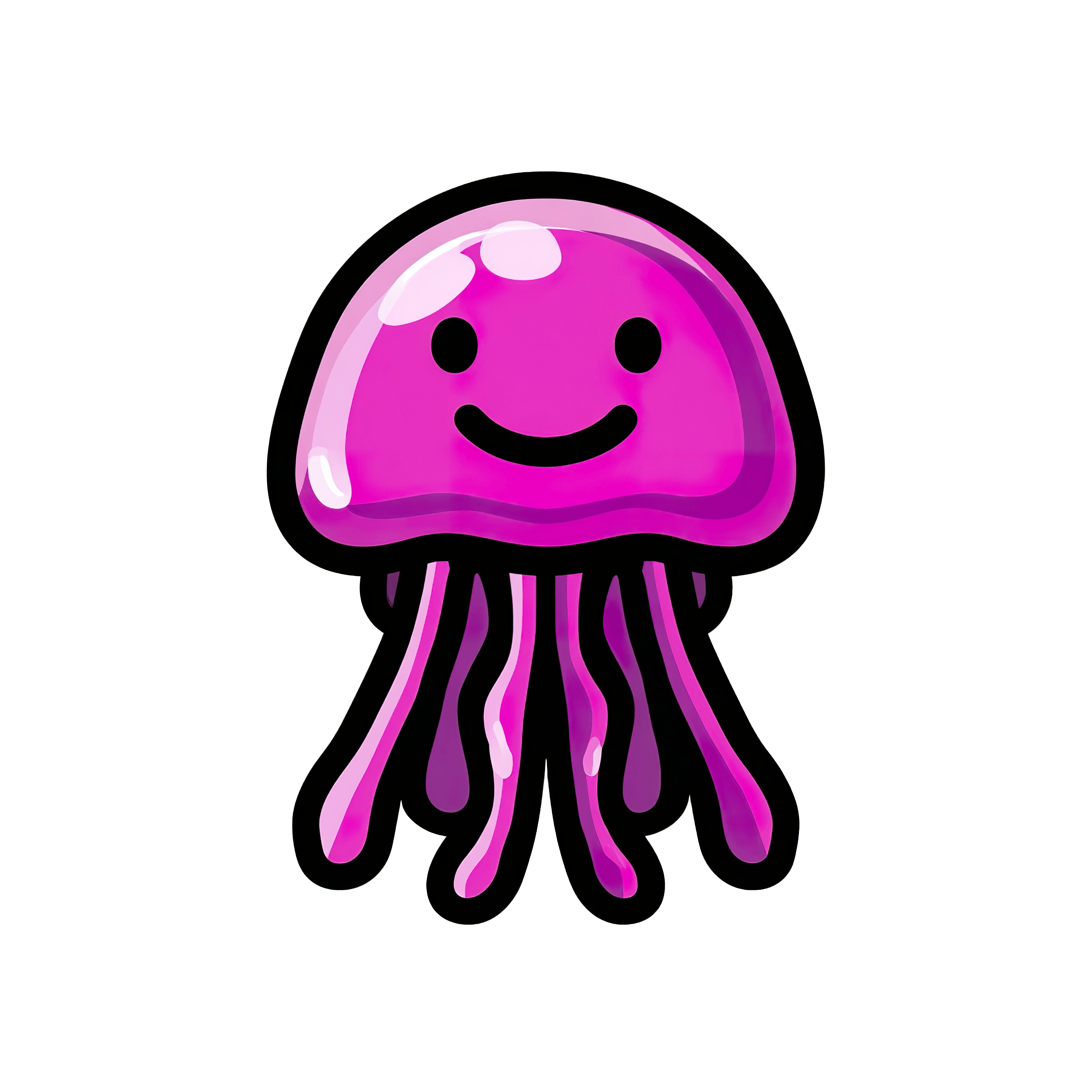 An image of a simplified pink jellyfish featuring a smooth, rounded body and multiple tentacles. The jellyfish is rendered in a cartoon style with vivid coloring and minimal detail, set on a plain background. The illustration is suitable for educational and decorative purposes, providing a clear representation of a jellyfish.