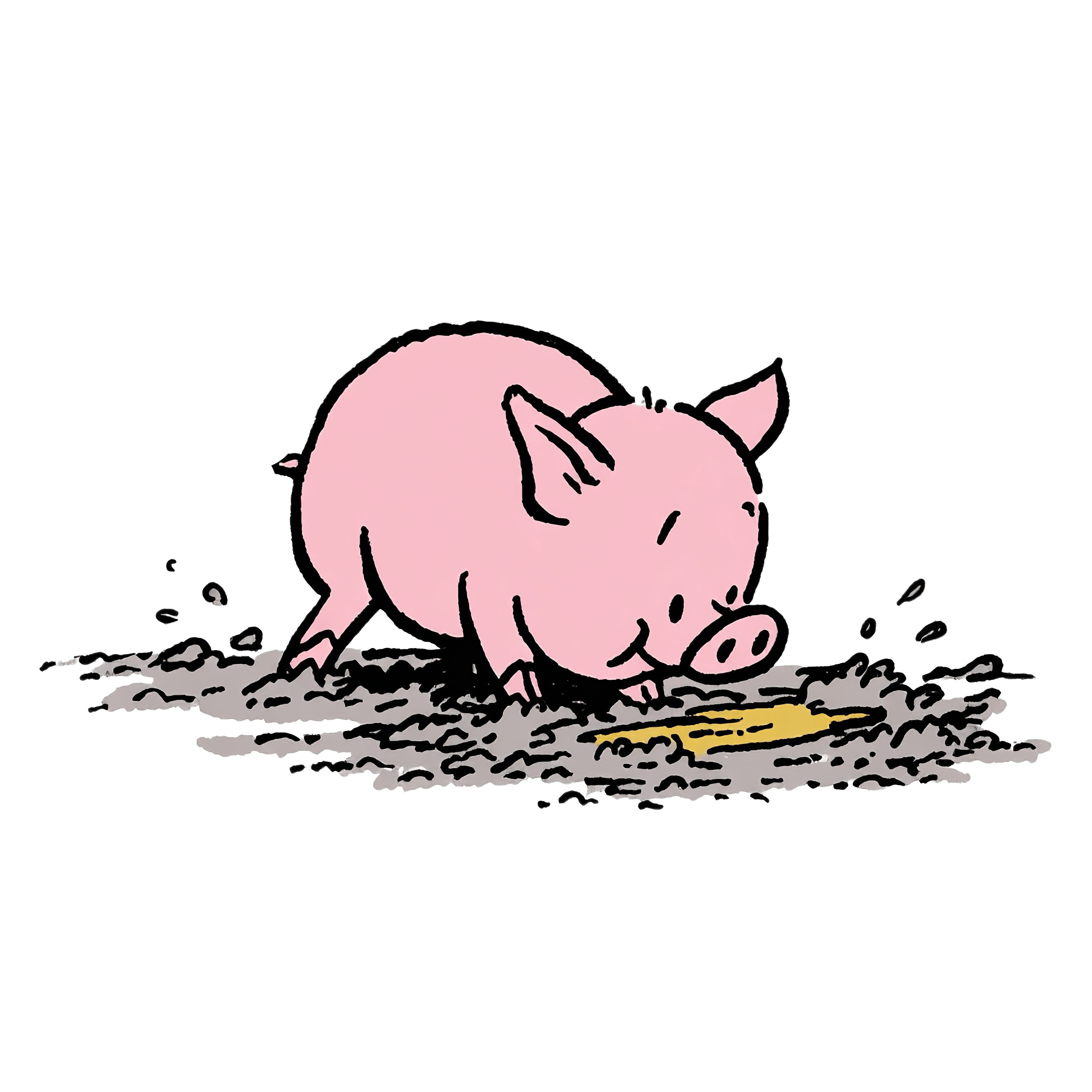 Pink pig with a curly tail snuffling around in the mud. Its simplistic cartoon style depicts a small pig focused on something in the ground. The drawing has clean outlines, emphasizing the pig's round body and slightly uplifted ears, creating an engaging farm animal illustration.