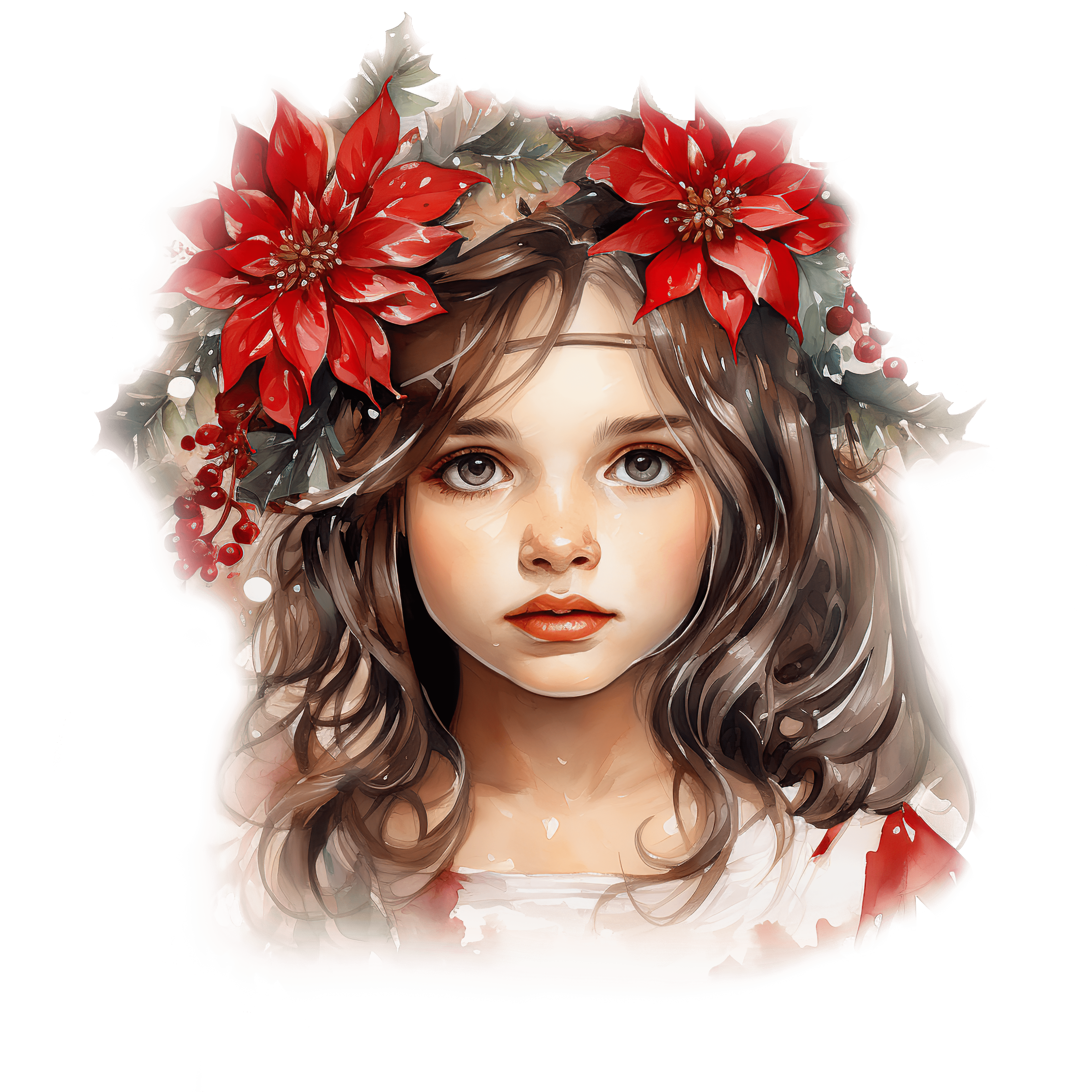 Portrait of a Young Girl with Poinsettia Headdress for Christmas Young girl with poinsettia and berry headdress, depicting Christmas themes.Download PNG ▼Download JPG ▼Related posts:Passionfruit Cheesecake Slice with Fresh Berries and LeavesColorful Watercolor Sunburst with Vibrant Petals on Black BackgroundWatercolor Bergamot Limes with Detailed Green Skin and LeavesCartoon zebra holding candy with red ribbonBunch of Purple Grapes with Green Leaves ClipartCluster of Ripe Lychee Fruits with Green LeavesPair of Red Cherries with Green LeavesFestive Doorway Decorated with Pine Wreaths and Red BowsRaspberry Ice Cream Cone with Fresh Raspberries waffle dessert red sweet clipartNine Pink and Red Heart Designs with Various TexturesMojito Drink Featuring Lime and Mint LeavesGlass Cup of Herbal Tea with Fresh Mint Leaves