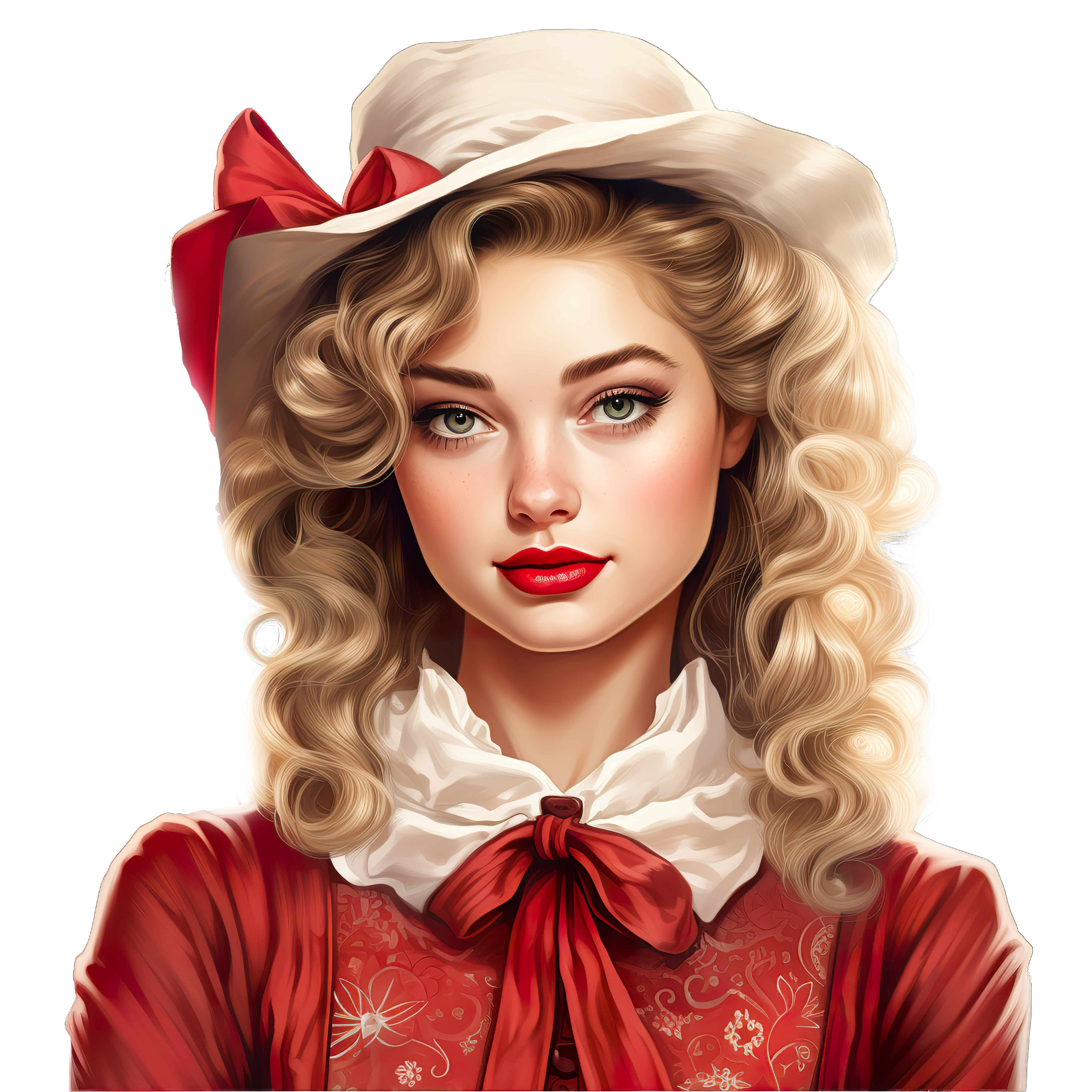 Portrait of Woman in White Hat with Red Ribbon Woman with curled blonde hair wearing a white hat and red ribbon.Download PNG ▼Download JPG ▼Related posts:Sliced Kiwano Melon with Spiky Orange Skin and SeedsPink jellyfish with tentacles clipart illustrationWatercolor Red Apple with Green Leaf and StemChocolate Brownie with Swirled Caramel Frosting Clipart dessert sweet food vector artWatercolor Style Red Cherries Fruit Vector Art PrintableBlue Lantern Adorned with Flowers and Candle for Holiday DecorDetailed Illustration Of A Purple Butterfly With IntricateCartoon squirrel with a large fluffy tailFresh Fennel Bulb with Lush Green FrondsRaccoon Clipart with Purple HoodBunch of Ripe Mulberries with Green LeavesFestive Christmas Decorated Winter Caravan with Snow and Wreaths