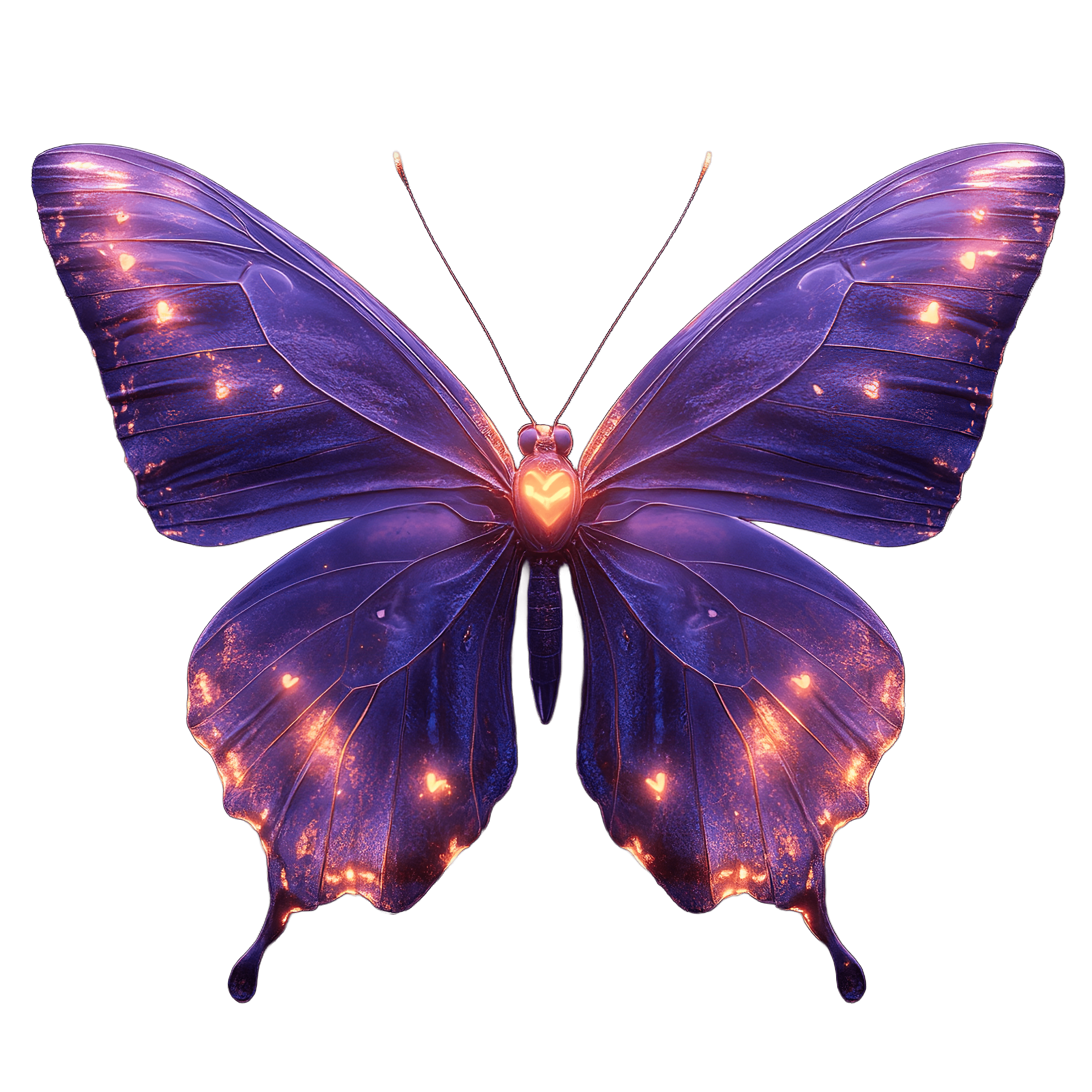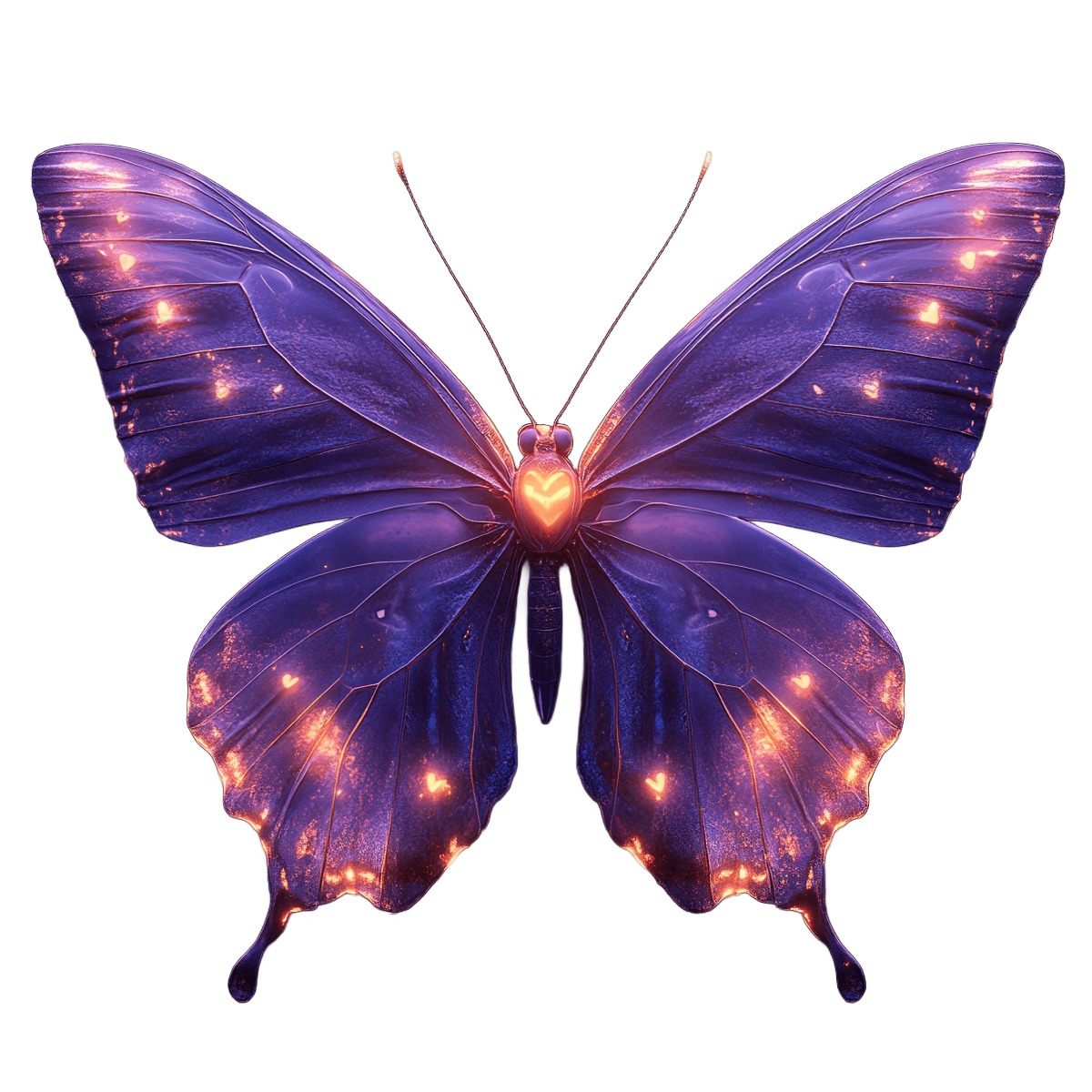 Purple Butterfly With Glowing Heart Patterns On Wings Purple butterfly features glowing heart patterns on its wings.Download PNG ▼Download JPG ▼Related posts:Cluster of Purple Blackberries with Green Leaves fruit clipart vector art printableWoolly Sheep Illustration Grass Clipart PngTwo Pink Mushrooms with Detailed Gills and StemsColorful Peacock Clipart with Patterned PlumageCartoon meerkat with large eyes by a treeVibrant Butterfly Art With Open Wings A DetailedBlue Moon Embracing Golden Sun with Swirling PatternsWatercolor Donuts Topped with Fresh Berries and LeavesHeart Shape Filled With White Daisies On BlackMatcha Bubble Tea with Tapioca Pearls and StrawFestive Deer with Antlers in Holiday Wreath of Pine and HollyWatercolor Glass of Sparkling White Wine Clipart drink beverage vector art printable