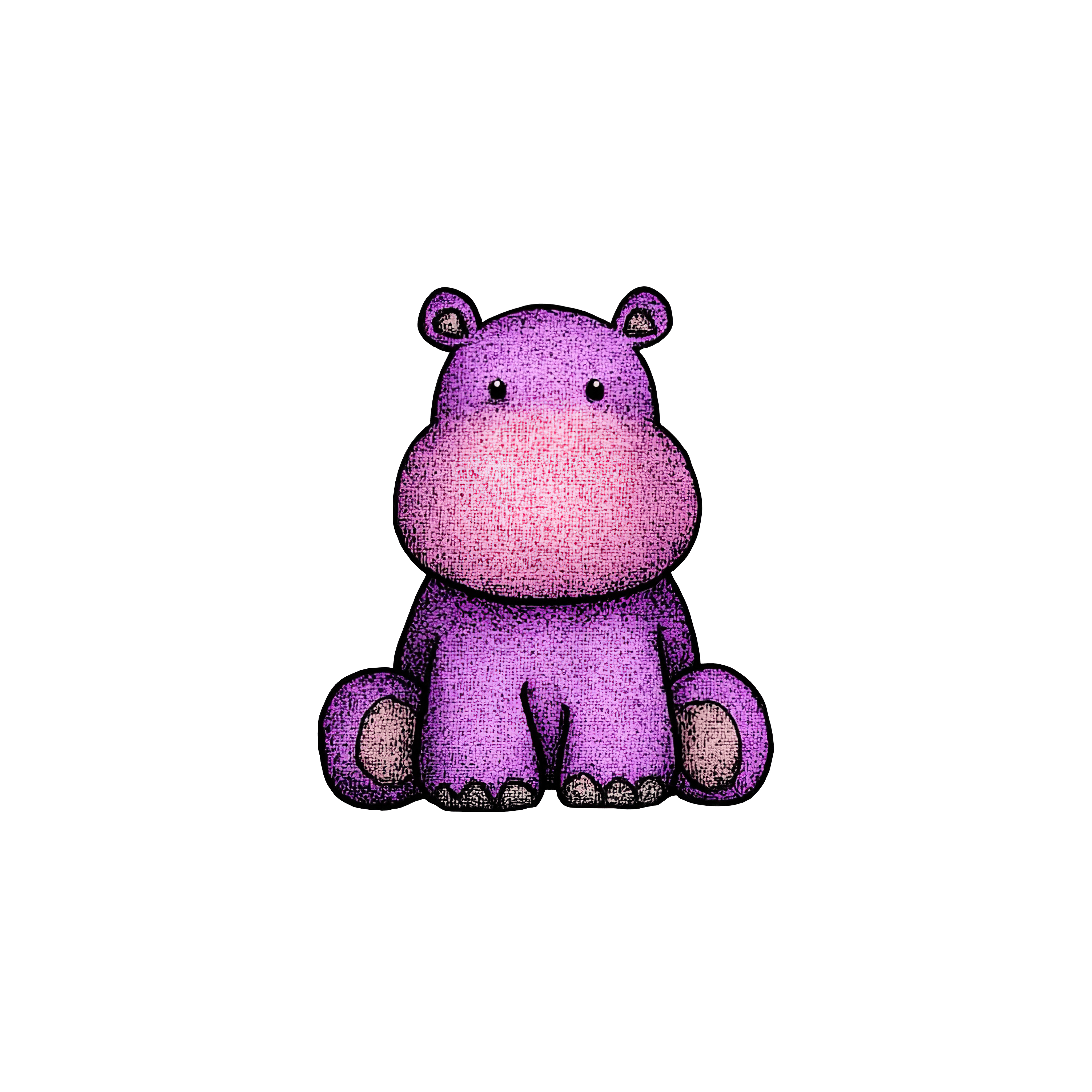 A simplistic representation of a hippo depicted in clipart style. The hippo is colored in shades of purple and has a dot texture design. Its design is characterized by simple lines and a cartoon-like appearance. The hippo is centrally positioned, and the design highlights its round features and small eyes.