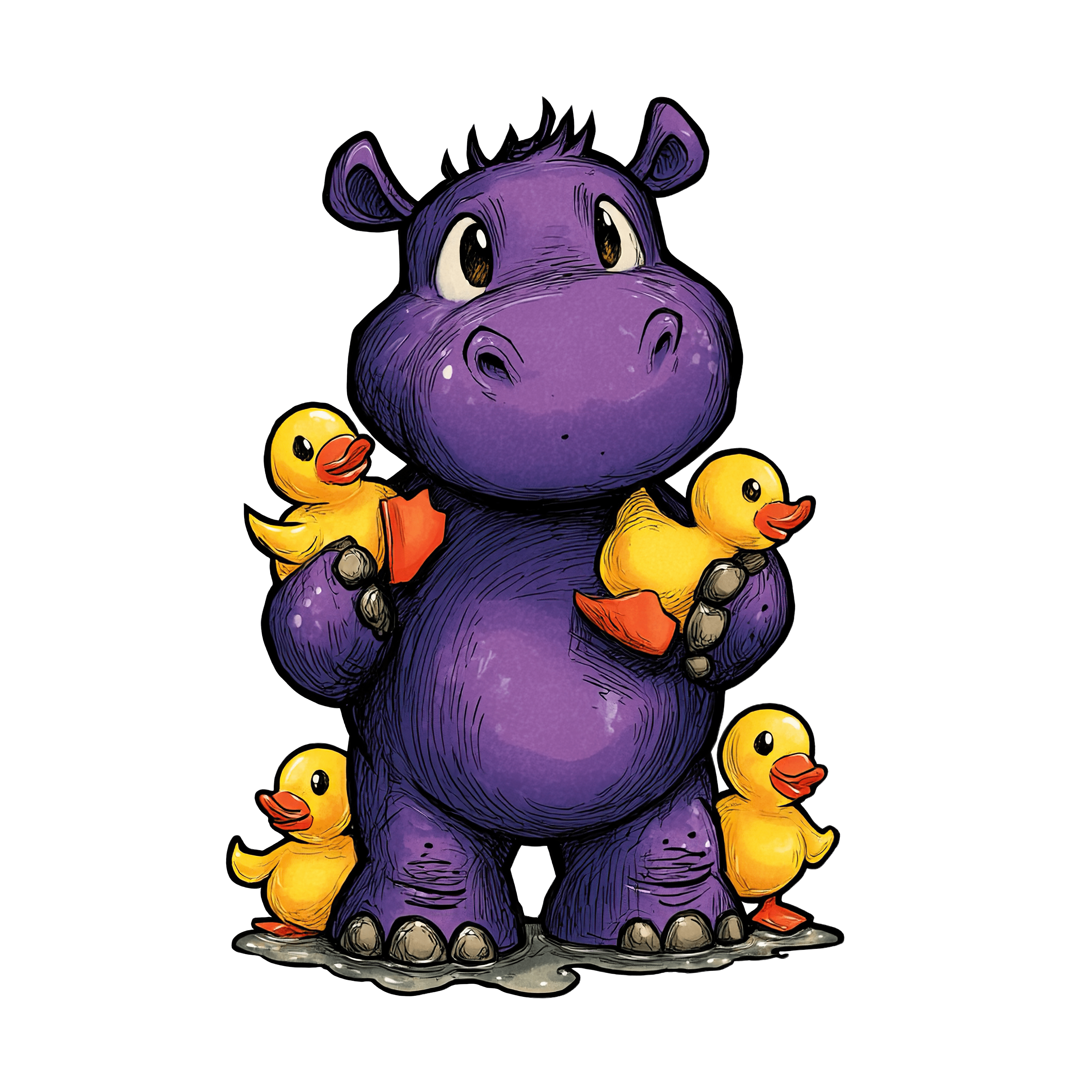 Illustration of a purple hippo standing and holding two yellow rubber ducks in its hands. The hippo is depicted in a cartoon style with exaggerated features. There are additional ducks at the hippo's feet. The vibrant colors and playful design make it suitable for various printed materials.