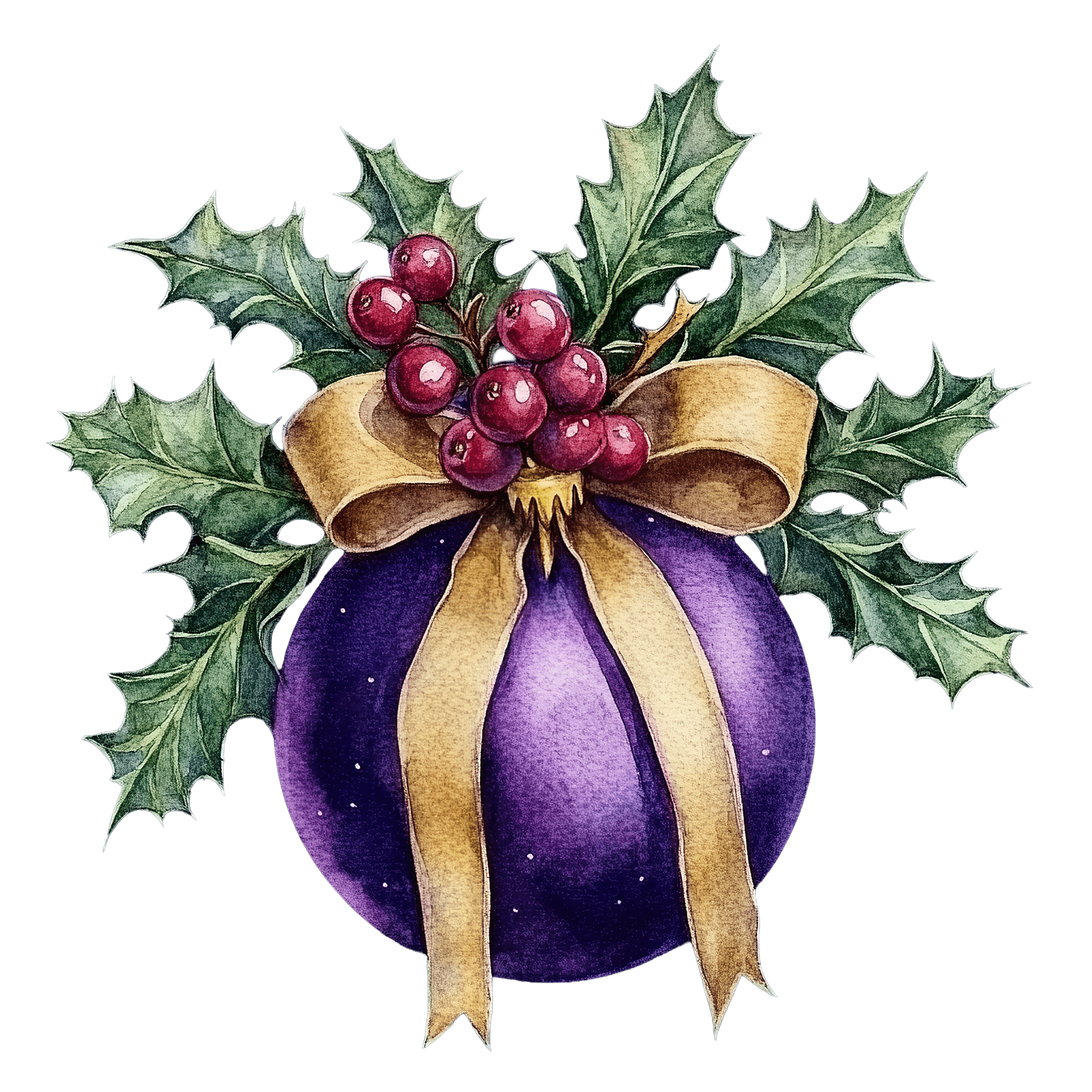 Purple Holiday Ornament with Holly Leaves and Berries Purple ornament decorated with green holly, red berries, and gold ribbon.Download PNG ▼Download JPG ▼Related posts:Chocolate Brownie with Walnuts and Cream Cheese FillingVibrant Bouquet of Red and White Flowers with GreeneryHamster on a Wheel Cartoon ClipartChristmas Elf Holding Green and Red Wrapped PresentsBlack Cat with Big Eyes and Bell Collar ClipartCartoon Girl with Big Eyes in Blue DressGiraffe Wearing Top Hat and Bow Tie ClipartRambutan Fruit with Spiky Red Skin and White FleshVibrant Green Soybean Plant with LeavesRed logging truck illustration with timber load on a black backgroundWhole and Sliced Pears with Seeds in Clipart StyleGreen lettuce head with layered leaves in vector style