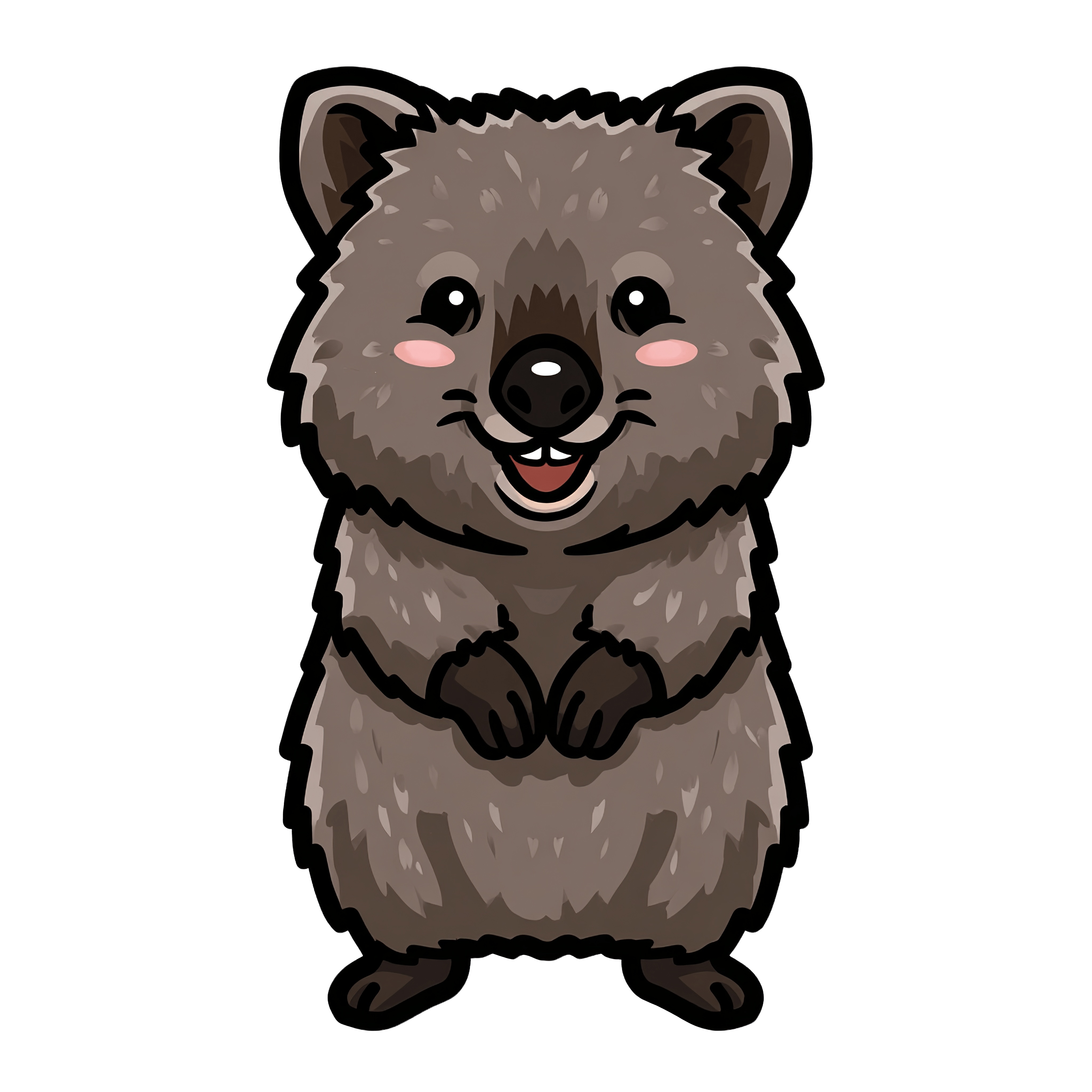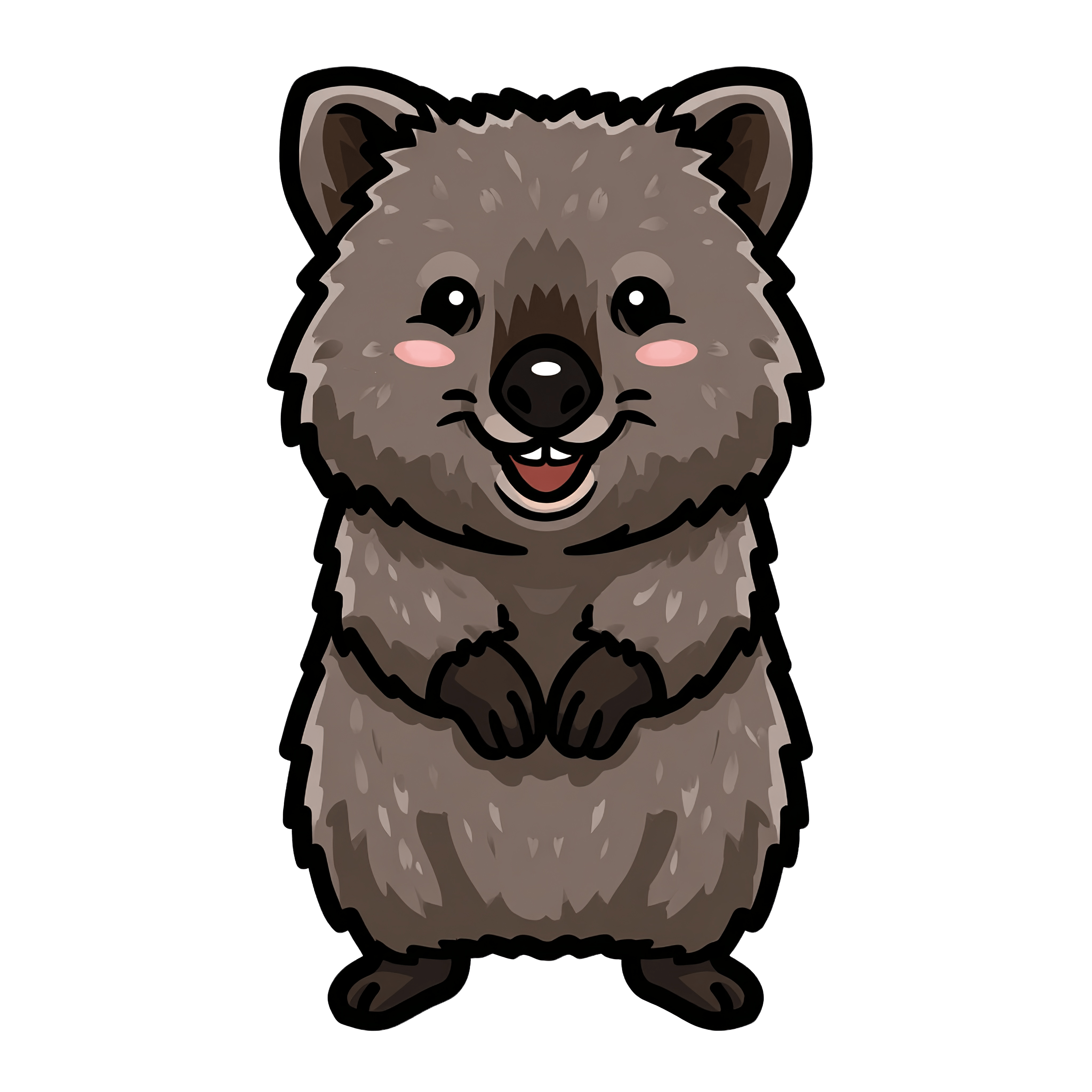 Quokka cartoon illustration showing its standing posture with round ears, small hands, and a smiling expression. The fur is textured with varying shades of brown, adding depth to the character’s body. Features include prominent eyes and subtle detailing around the muzzle and paws, typical of a simple, stylized animal design. The clipart character is rendered in a clear, vector style, suitable for a variety of digital and printable uses.