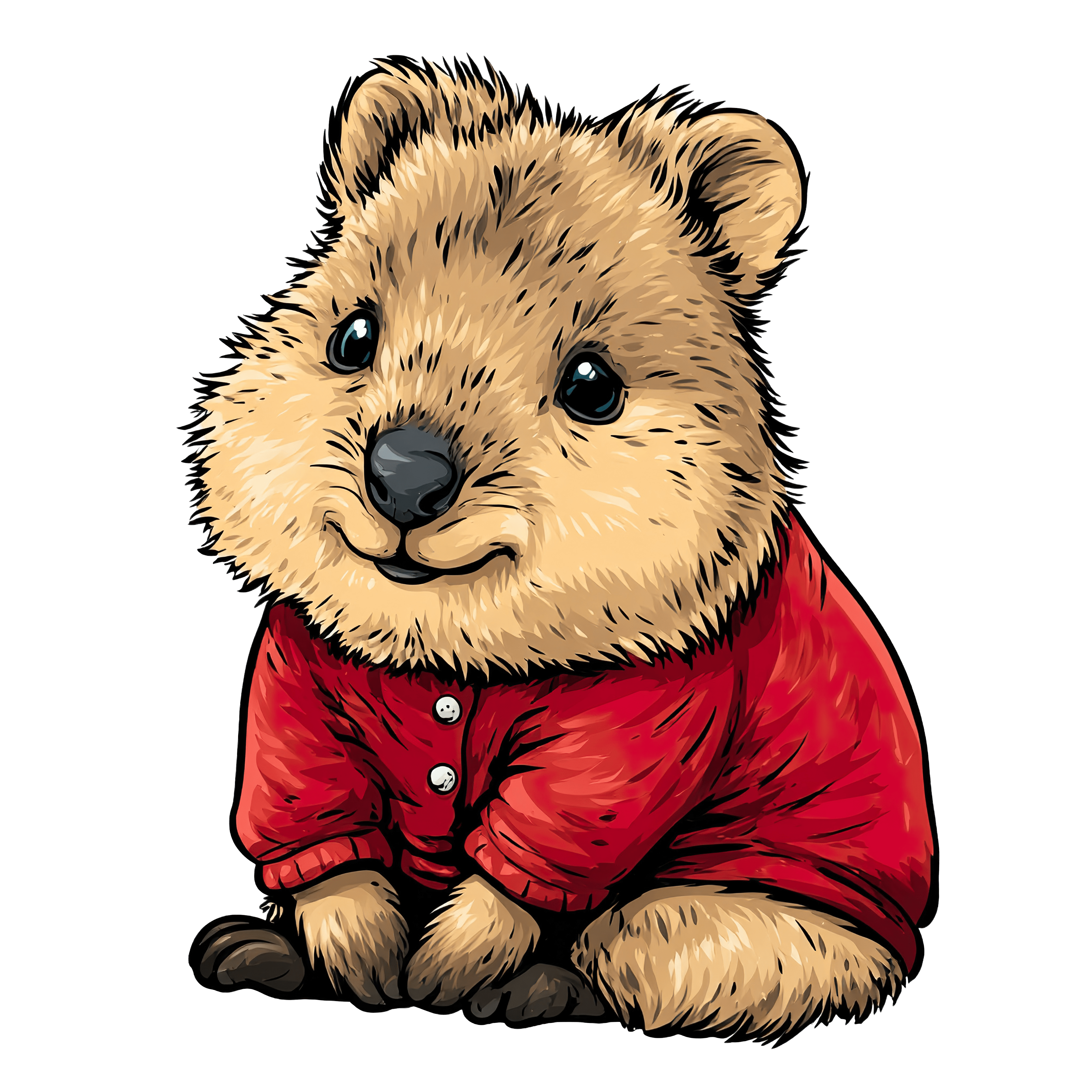 Quokka depicted in a detailed illustration, features soft tan fur contrasted by a vibrant red jacket with buttons. The animal's facial expression includes prominent dark eyes and a small nose, enhancing its realistic appearance. The quokka is positioned sitting upright, highlighting its short limbs and natural texture in a cartoon style.