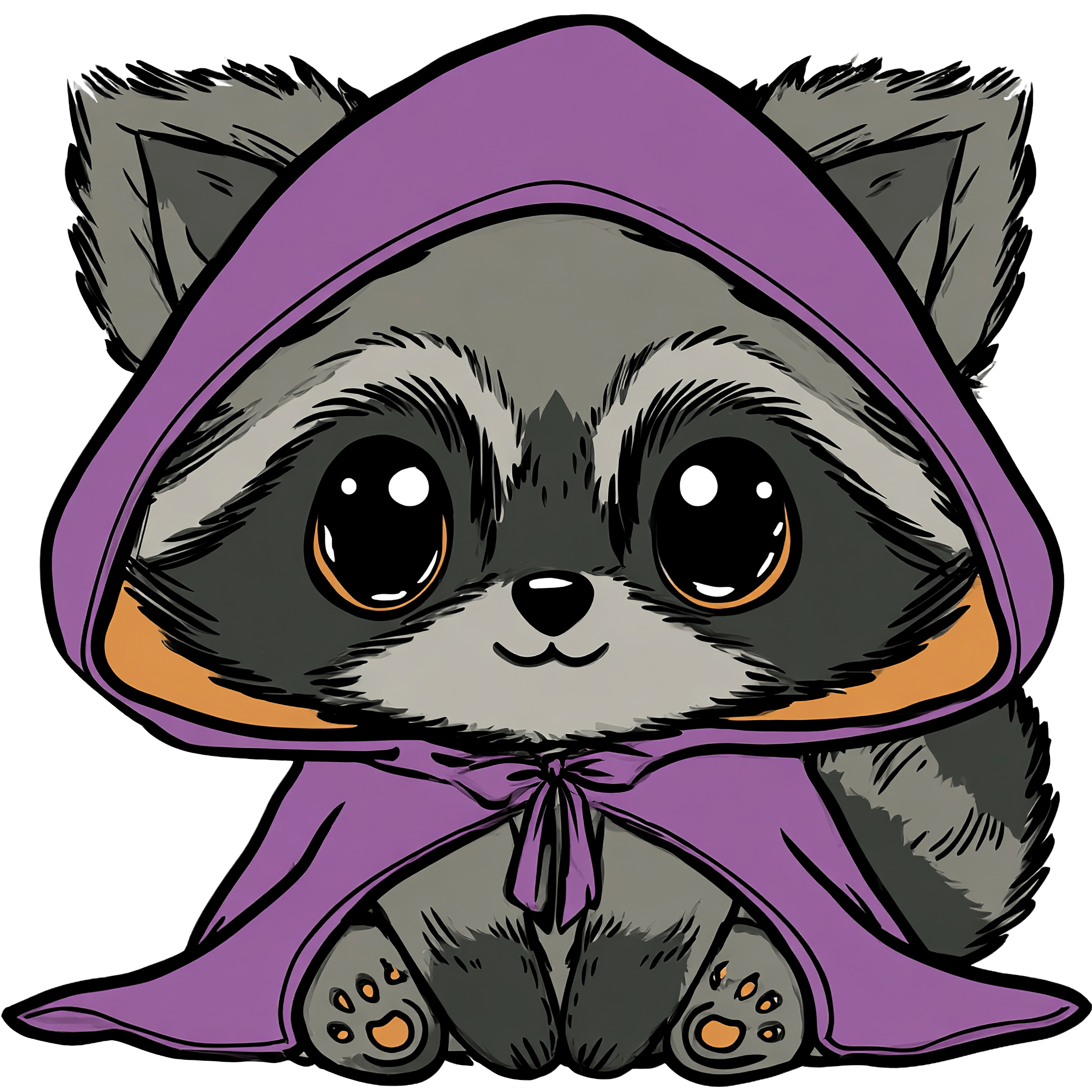 Raccoon illustration features a grey raccoon wearing a purple hooded cloak. The raccoon's facial markings are detailed with black and white patterns, while the ears peek out above the hood. The cloak ties under the chin, adding a whimsical element to the design. Large, dark eyes and small paws detail the character, creating a simple yet striking graphic. Ideal for vector designs and animal-themed projects.