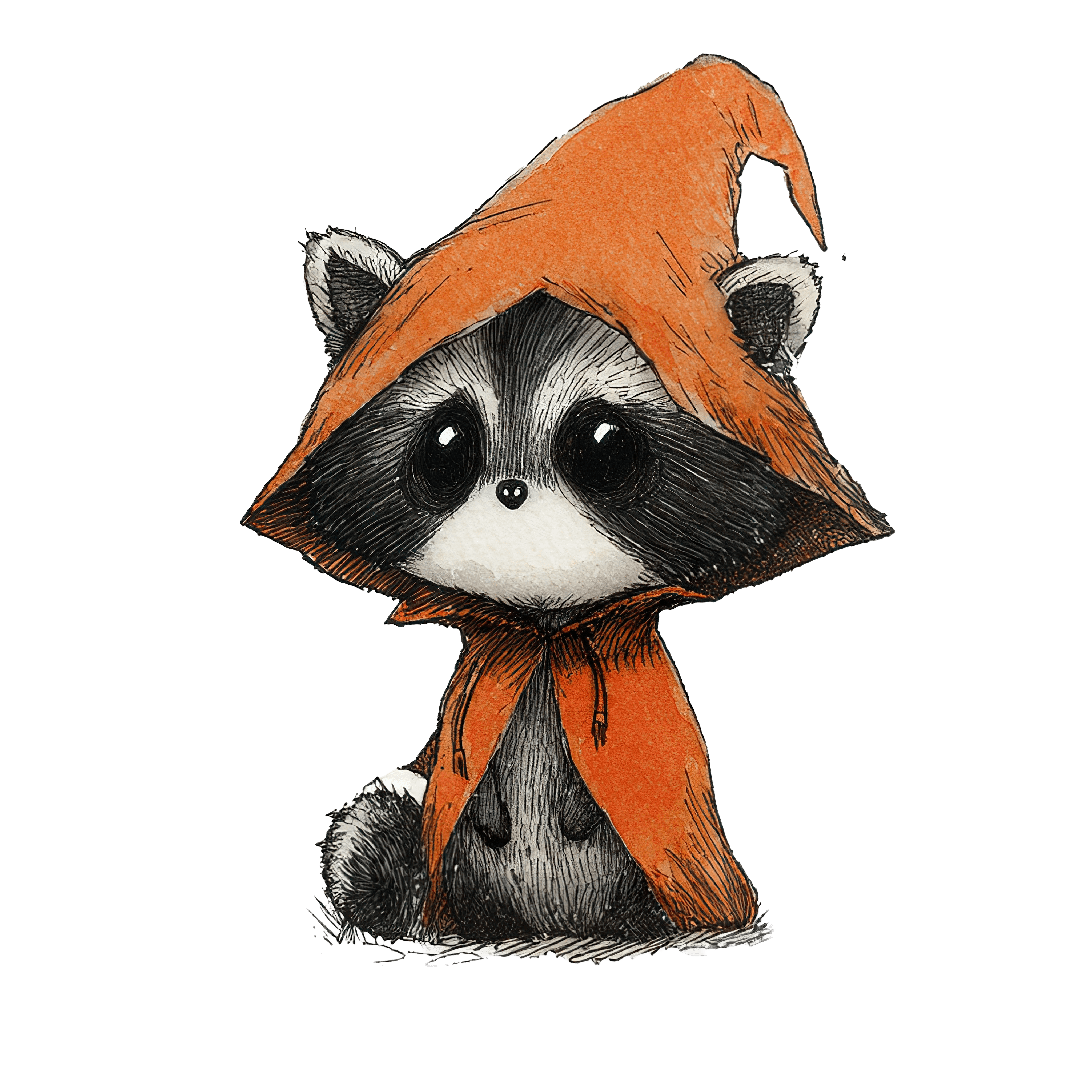 Raccoon wearing an orange hooded cloak, depicted in a sketch-like clipart style. Its fur features detailed black and white patterns, with prominent facial markings. The cloak has exaggerated pointed ends, adding a whimsical touch to the character. Focus on the animal's inquisitive eyes and soft fur texture enhances the illustration's visual appeal.