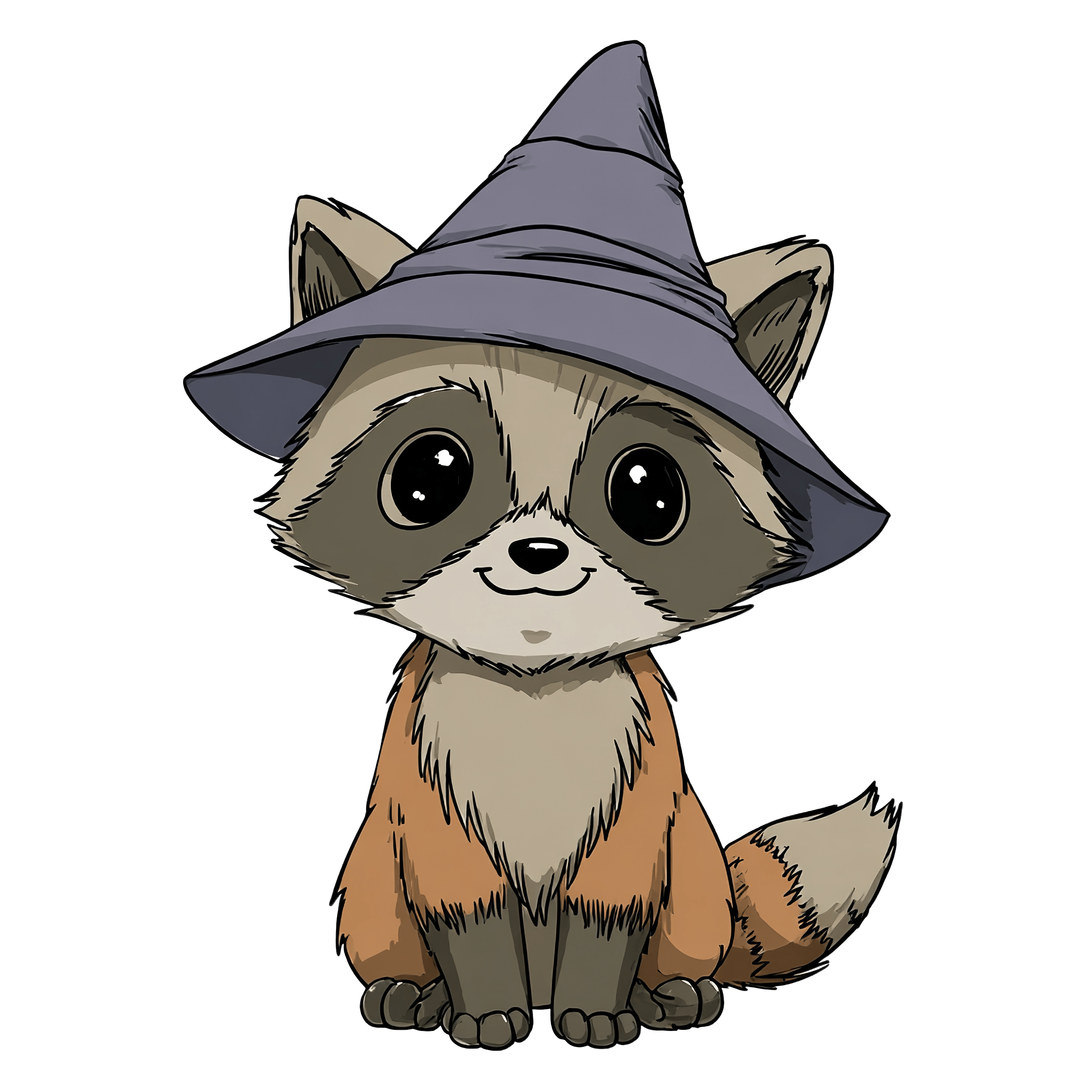 Raccoon wearing a large, pointed wizard hat. The raccoon is designed with detailed fur patterns, featuring shades of grey and brown. The oversized hat adds a whimsical touch, complementing the raccoon's rounded features and distinct facial markings.